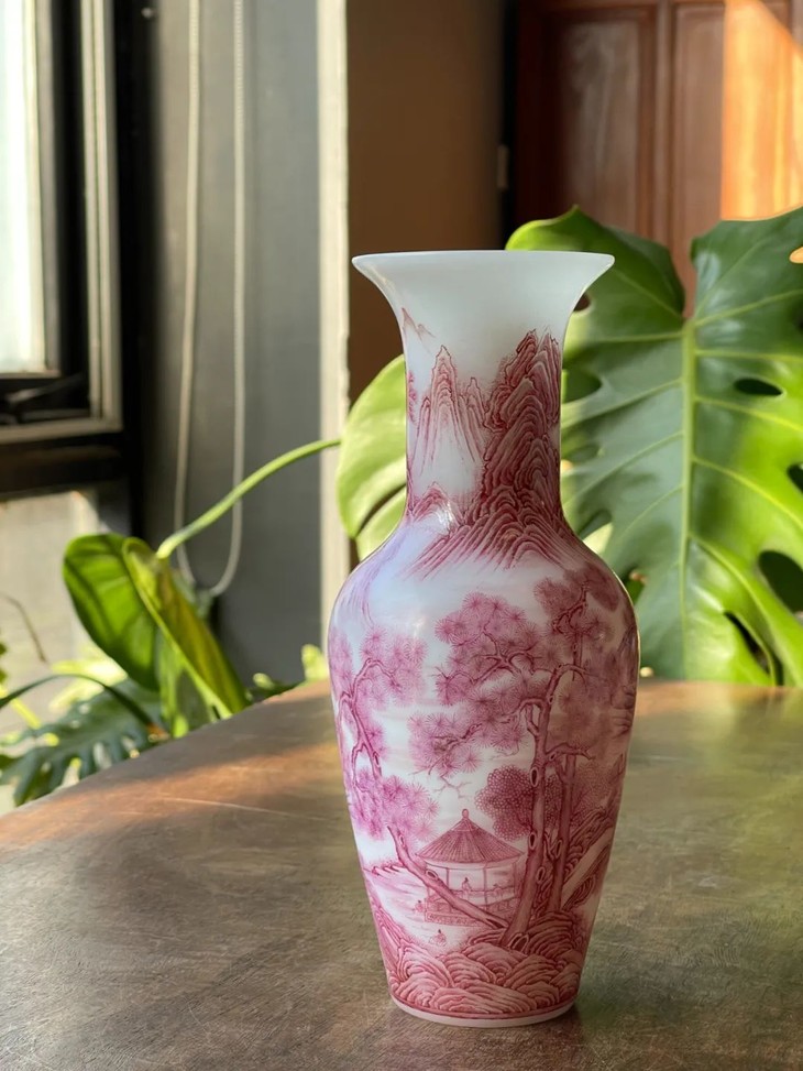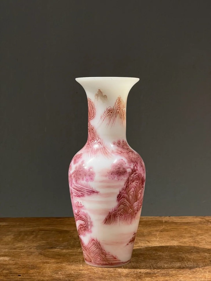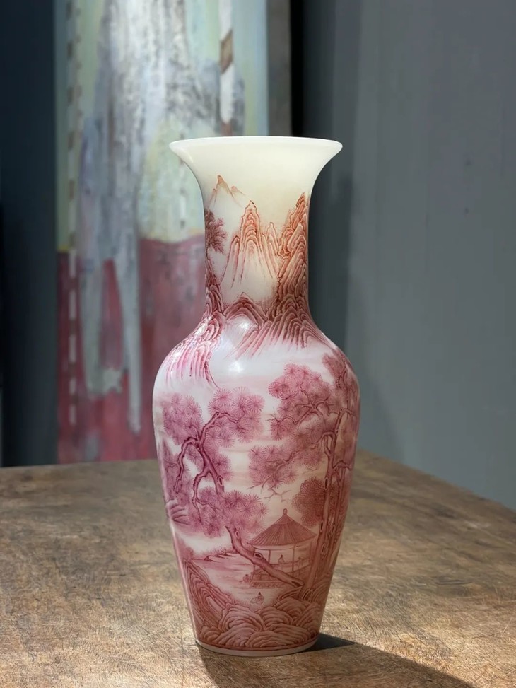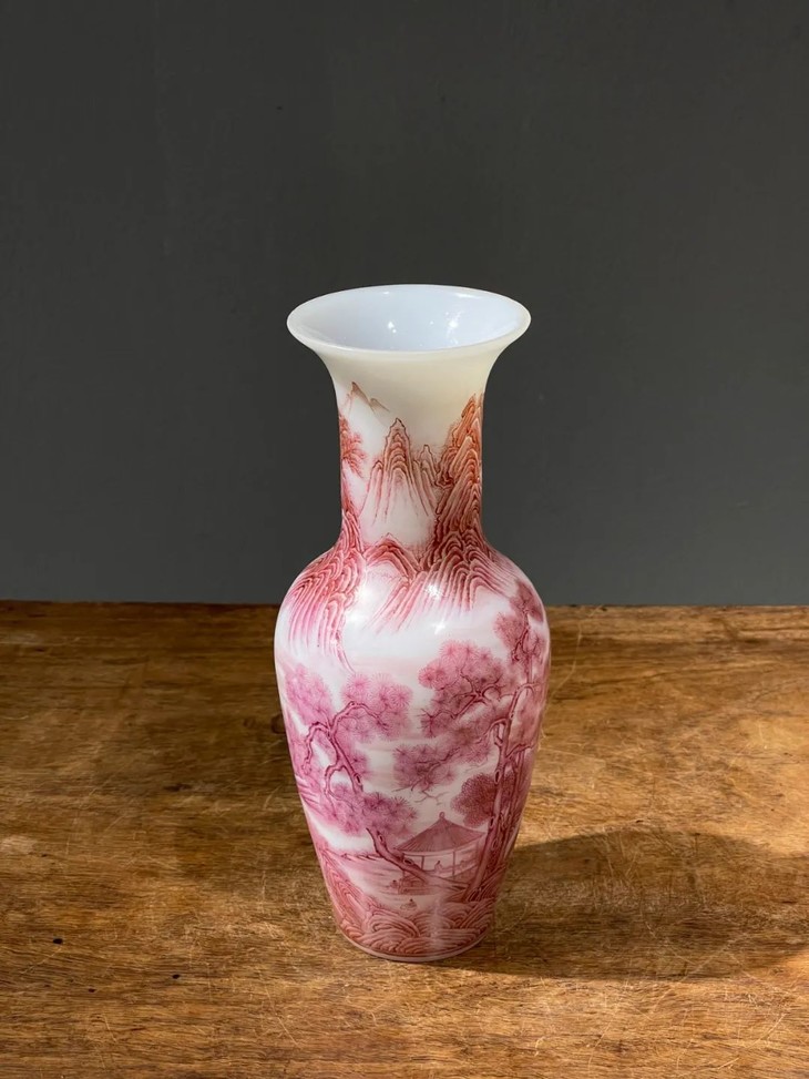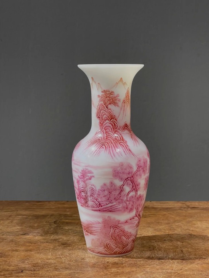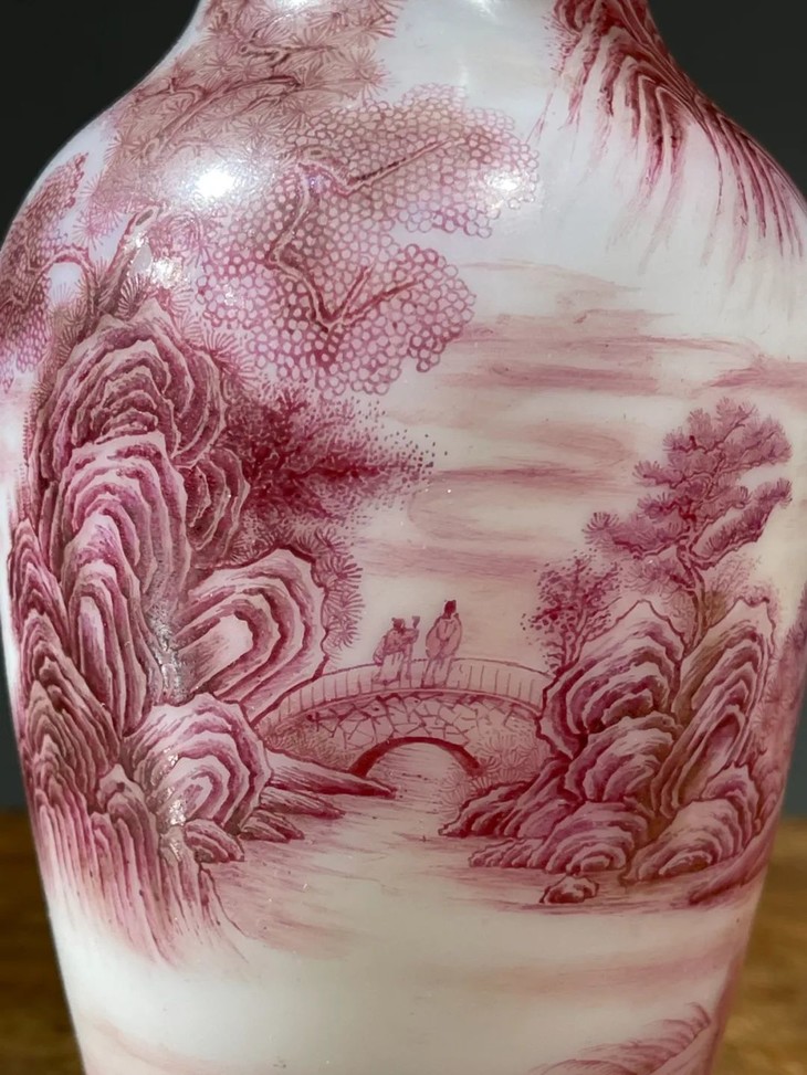 这是一件制作精美的琉璃胎珐琅彩赏瓶,以白色琉璃料器吹制琢磨成观音撇口瓶,环绕瓶身以胭脂红色珐琅彩料绘制宋代壮丽山水画风格高仕春游图,单色胭脂红珐琅彩仿水墨画浓淡深浅流畅自然,整体绘画风格典雅大气,一气呵成,颇有大师之风范,含黄金成份的胭脂红珐琅彩烧制出柔美明亮的色泽,婉如胭脂的风采,是依循宫廷造办处瓷胎与料胎绘珐琅风格的所谓“古月轩“珐琅彩之绘画工艺绘制而成。