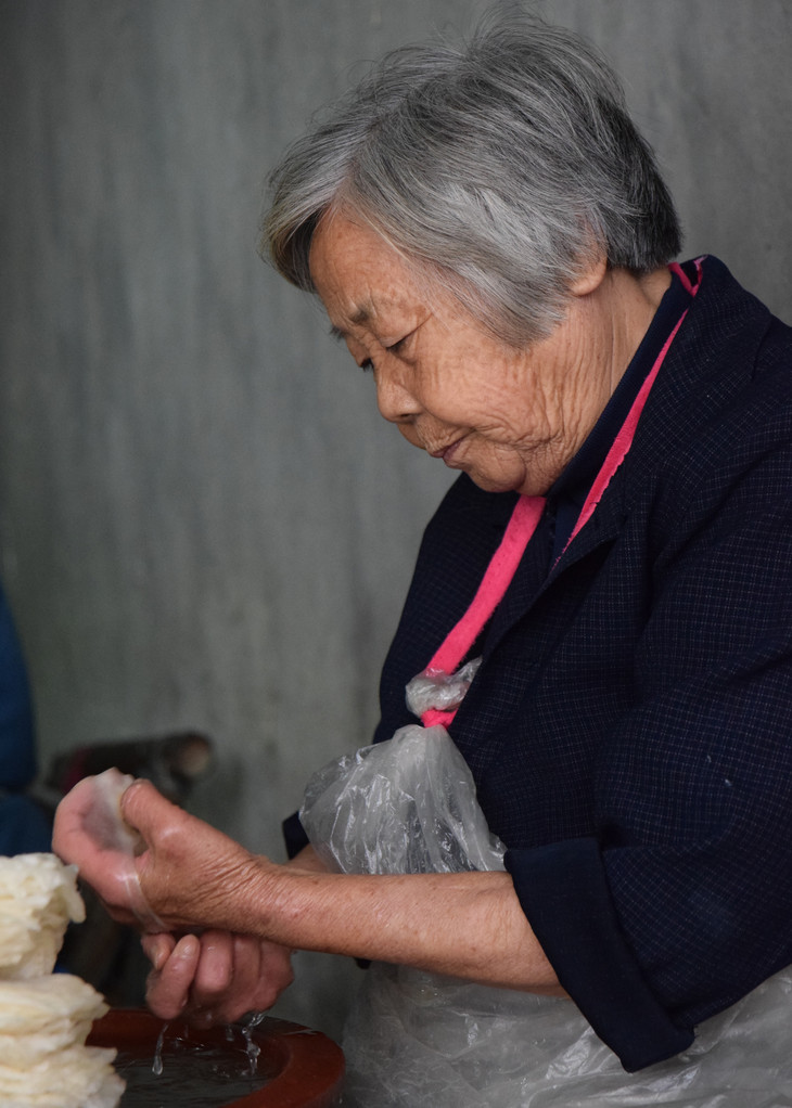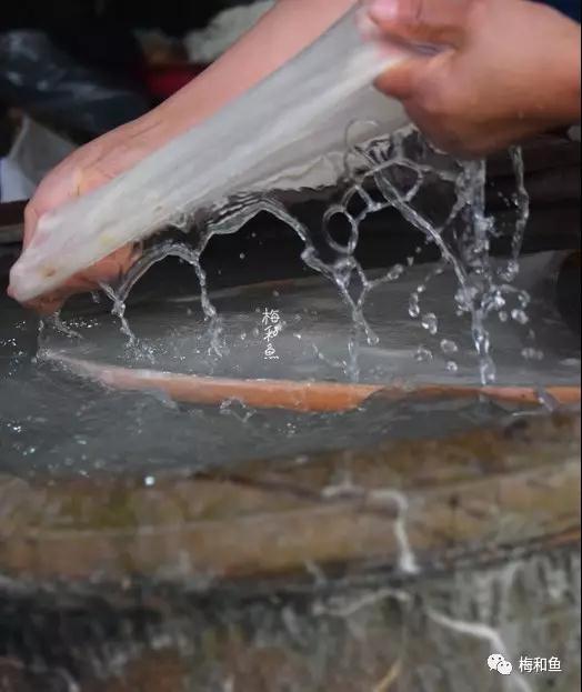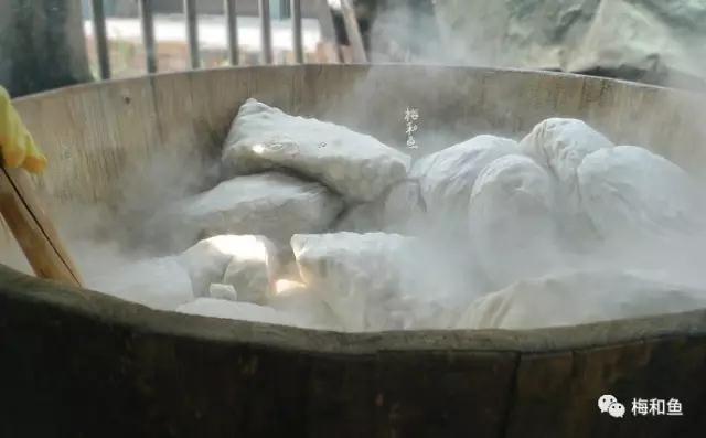 师傅们每日凌晨煮茧:将选好的双宫茧放入专制大木桶中烧开;添冷水,如此反复三次,约90分钟后出锅,冲洗干净。