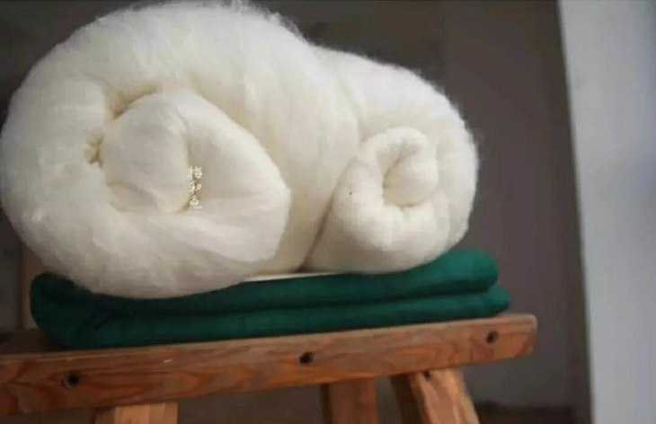 蚕丝被的原料是蚕茧,但是蚕茧分为茧衣、中间层、蛹衬。传统的蚕丝被,蛹衬是不作为主要的材料来源的。蛹衬是蚕蛹里面的一层,油性大,无法缫丝,以前是丝厂的下脚料,现在是一般蚕丝被的最大原料来源。蛹衬经过化学漂白处理后的丝绵中长、白净,属于国标的一等品。