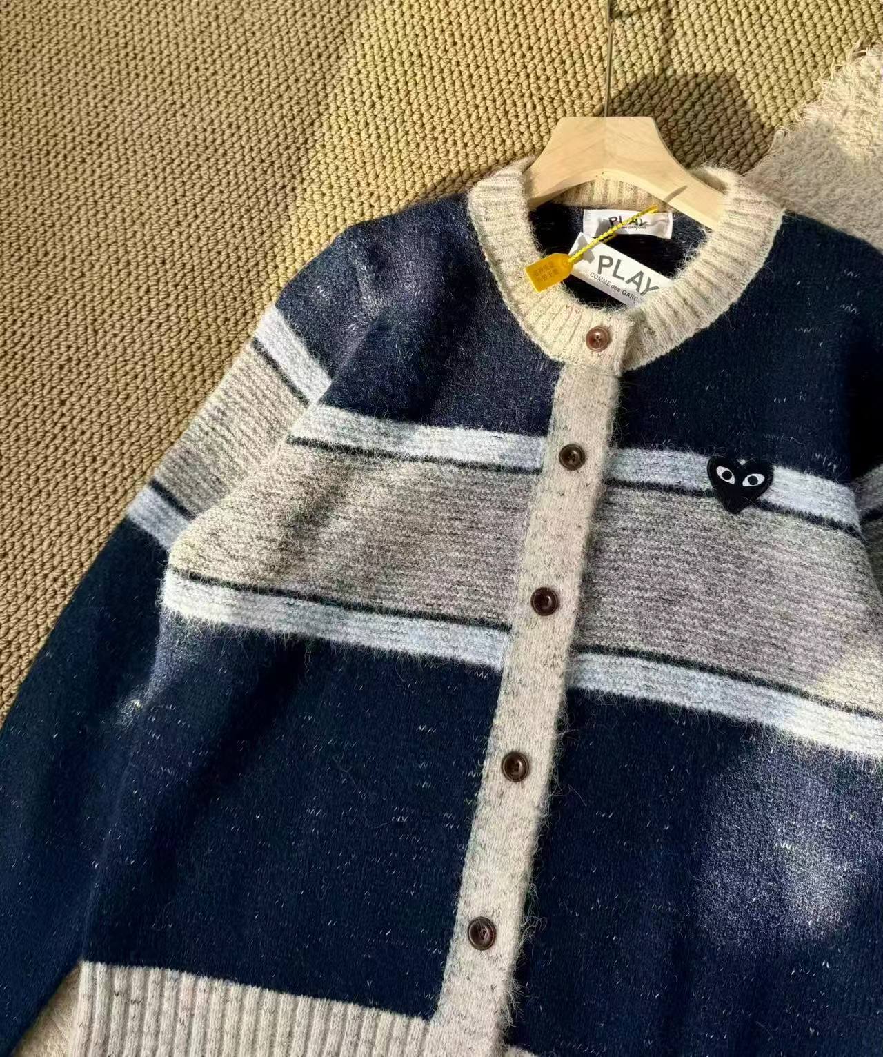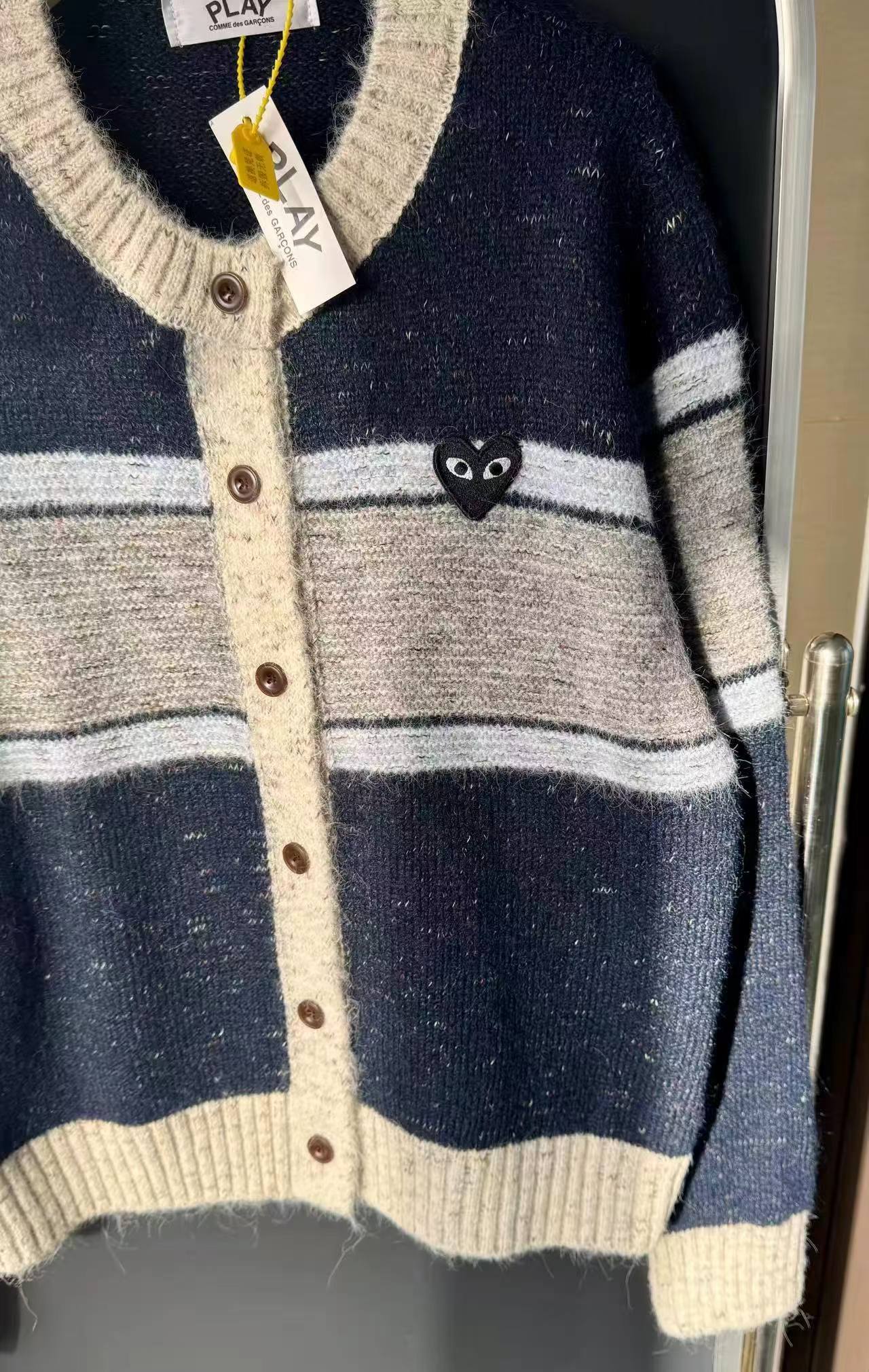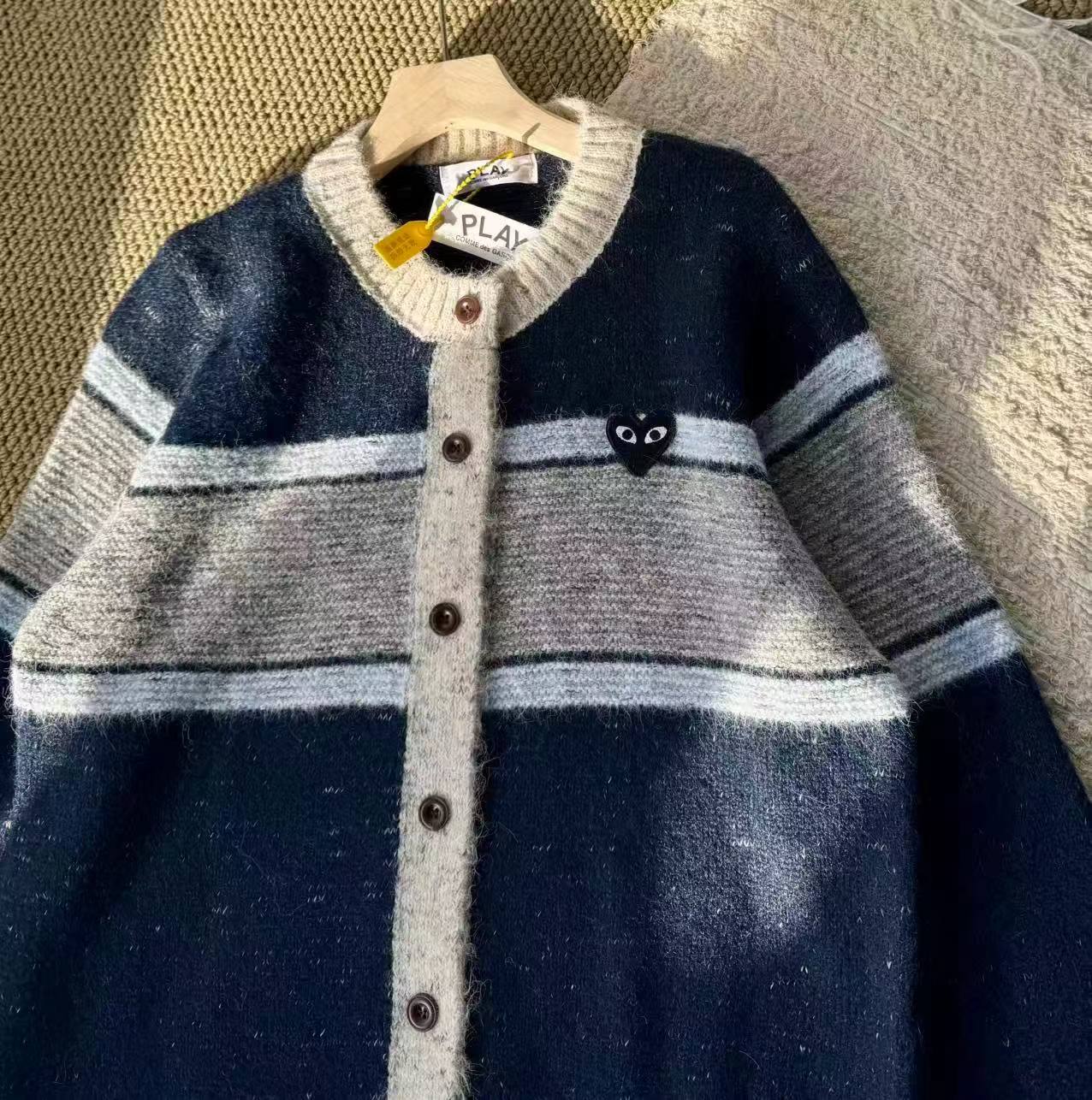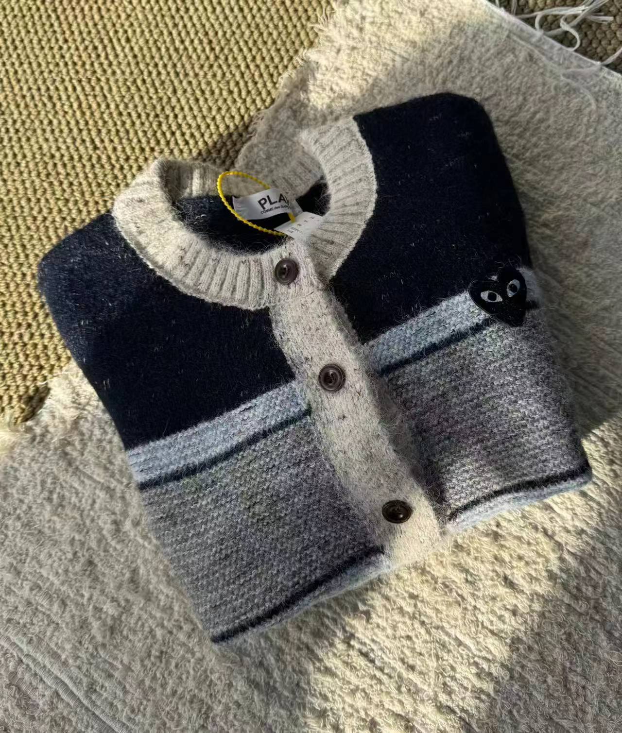 这款毛衣是一件风格复古又不失可爱拼色设计,色彩搭配复古且有层次。采用圆领单排扣版型,穿脱方便且能很好地修饰颈部线条。衣身带有标志性的黑色爱心眼睛图案,为整体增添了灵动俏皮感,同时也具有较高的品牌辨识度。材质看起来柔软亲肤,整体版型偏宽松,是一件兼具复古感与时尚感的单品,可轻松打造出休闲又不失格调的穿搭风格,适合多种场合穿着。