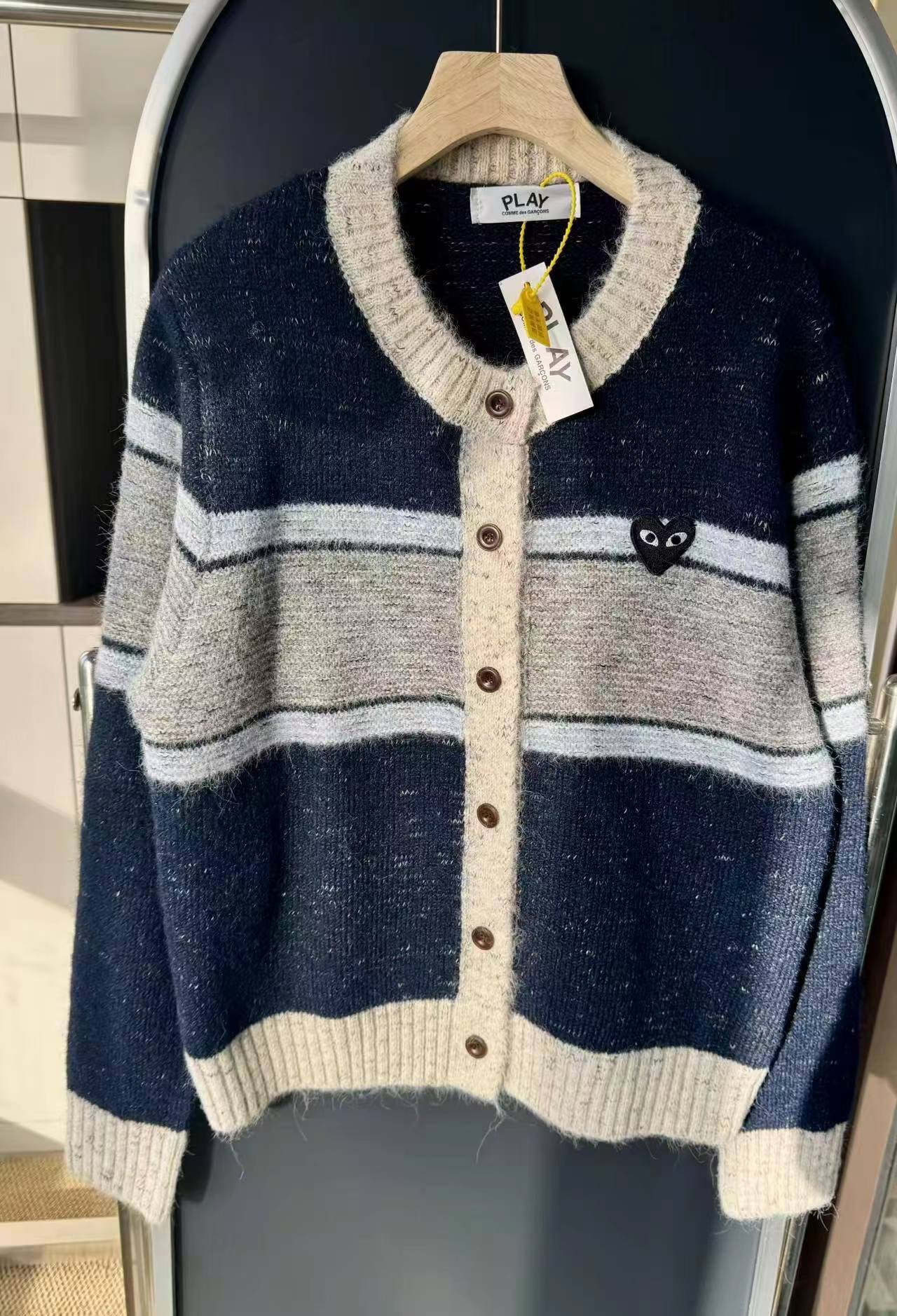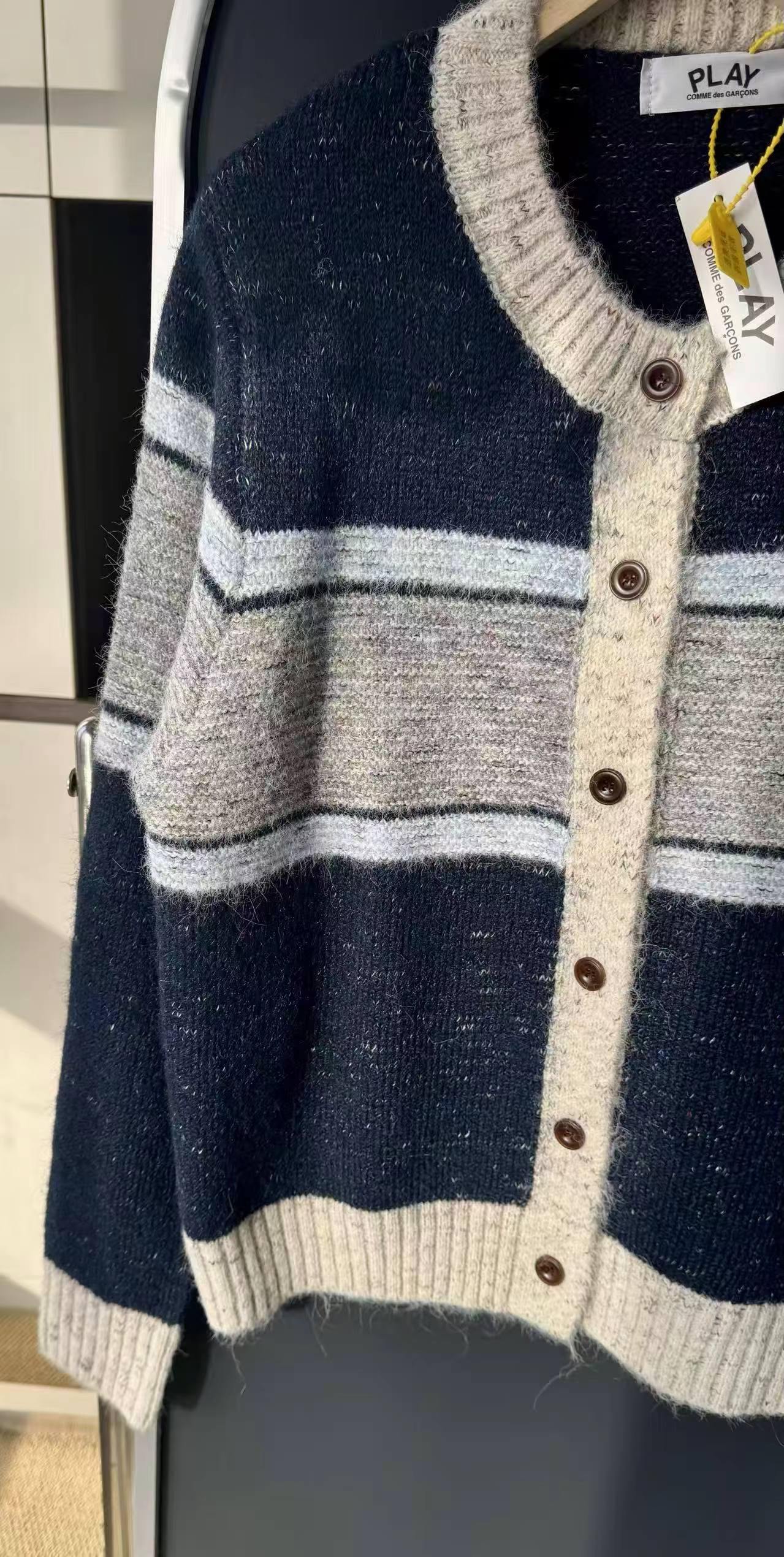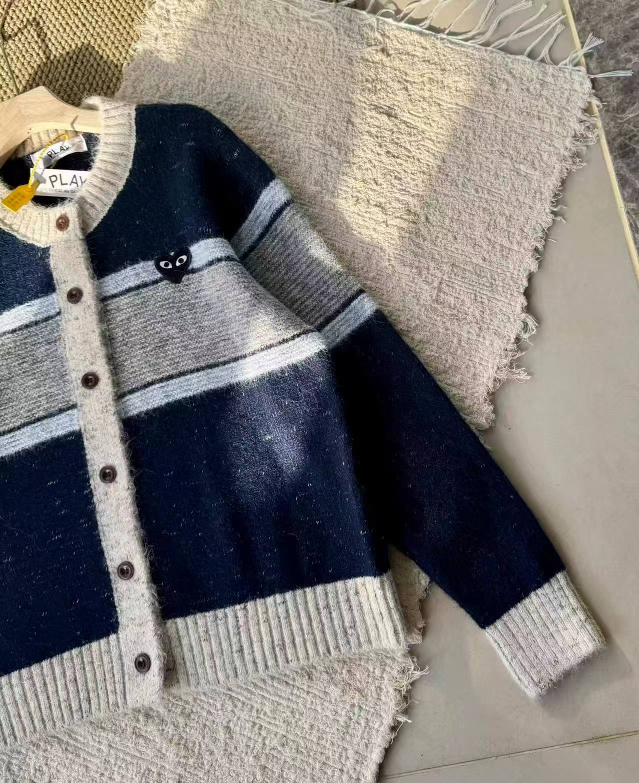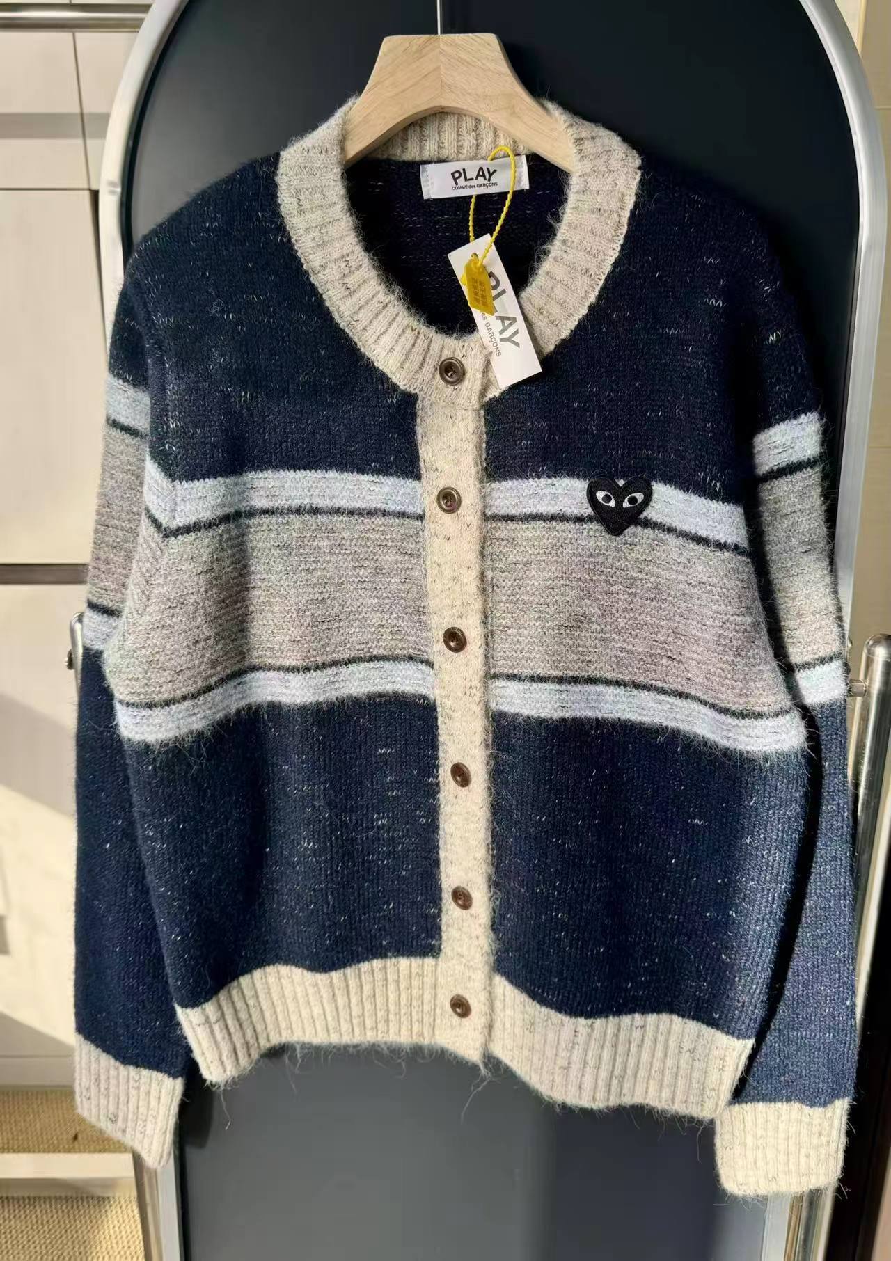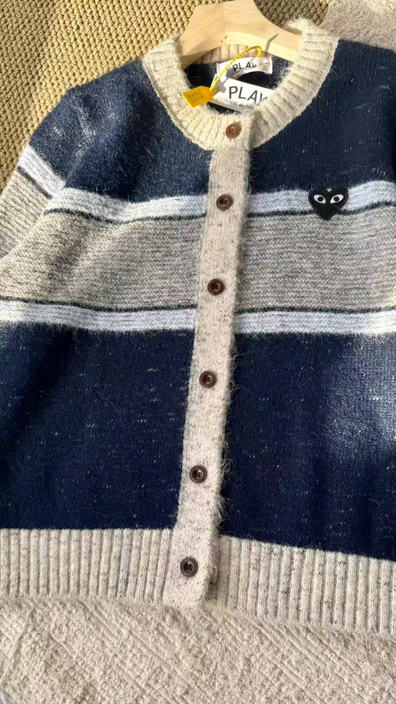 这款毛衣是一件风格复古又不失可爱拼色设计,色彩搭配复古且有层次。采用圆领单排扣版型,穿脱方便且能很好地修饰颈部线条。衣身带有标志性的黑色爱心眼睛图案,为整体增添了灵动俏皮感,同时也具有较高的品牌辨识度。材质看起来柔软亲肤,整体版型偏宽松,是一件兼具复古感与时尚感的单品,可轻松打造出休闲又不失格调的穿搭风格,适合多种场合穿着。
