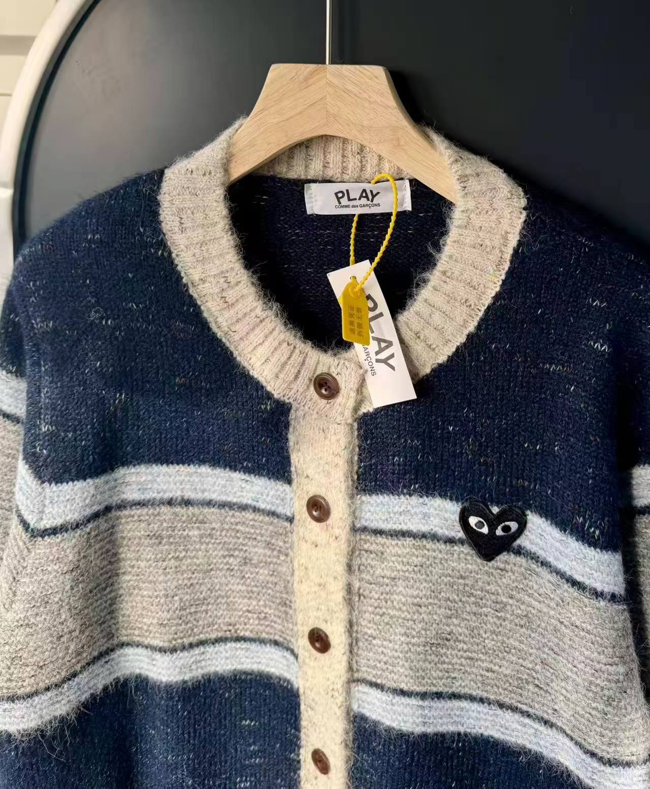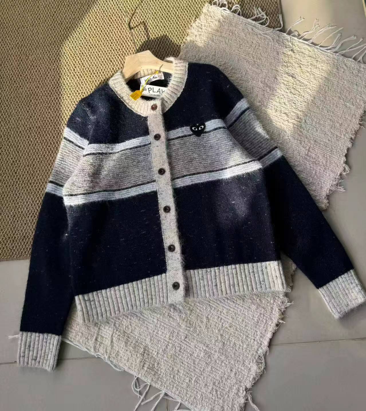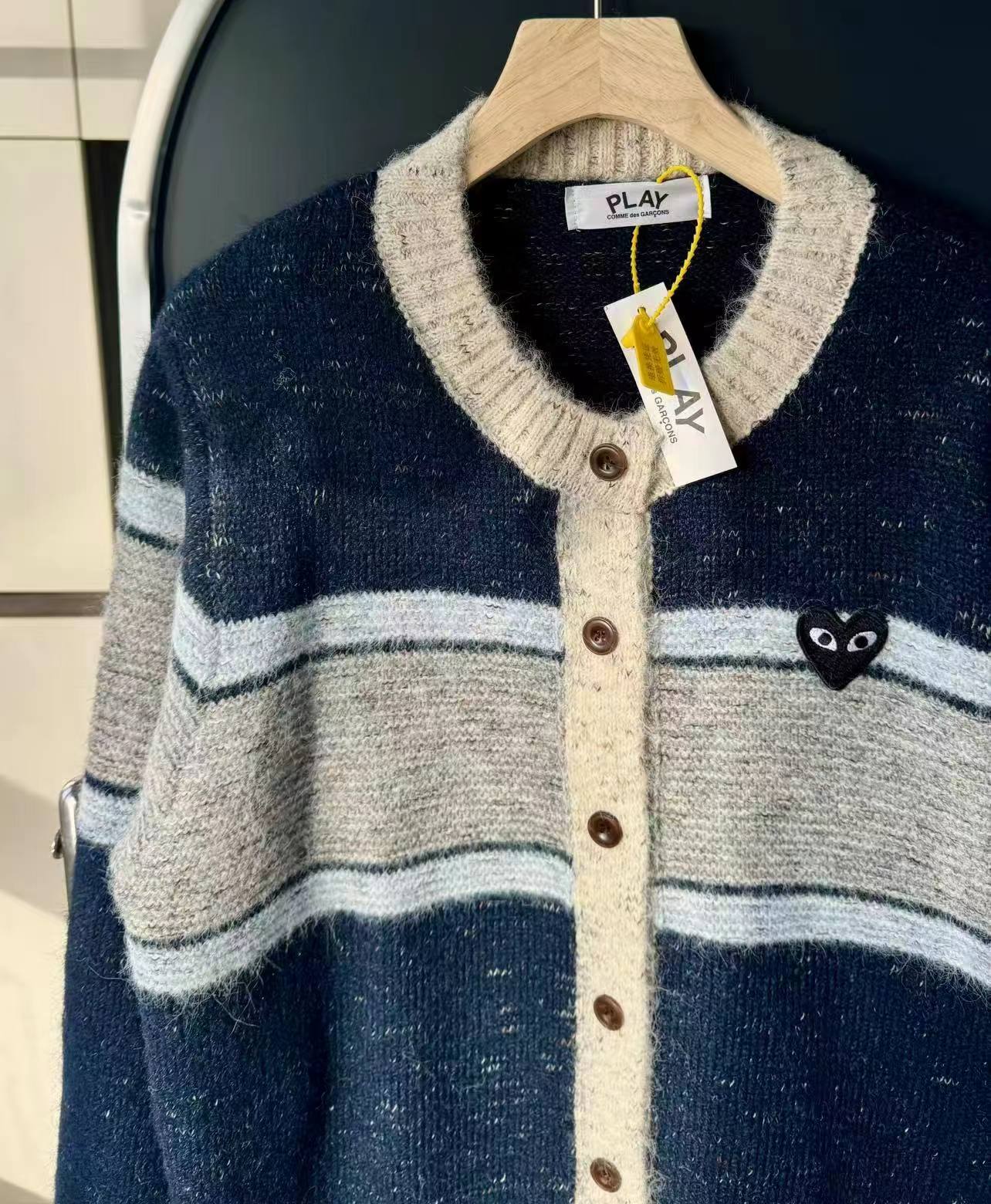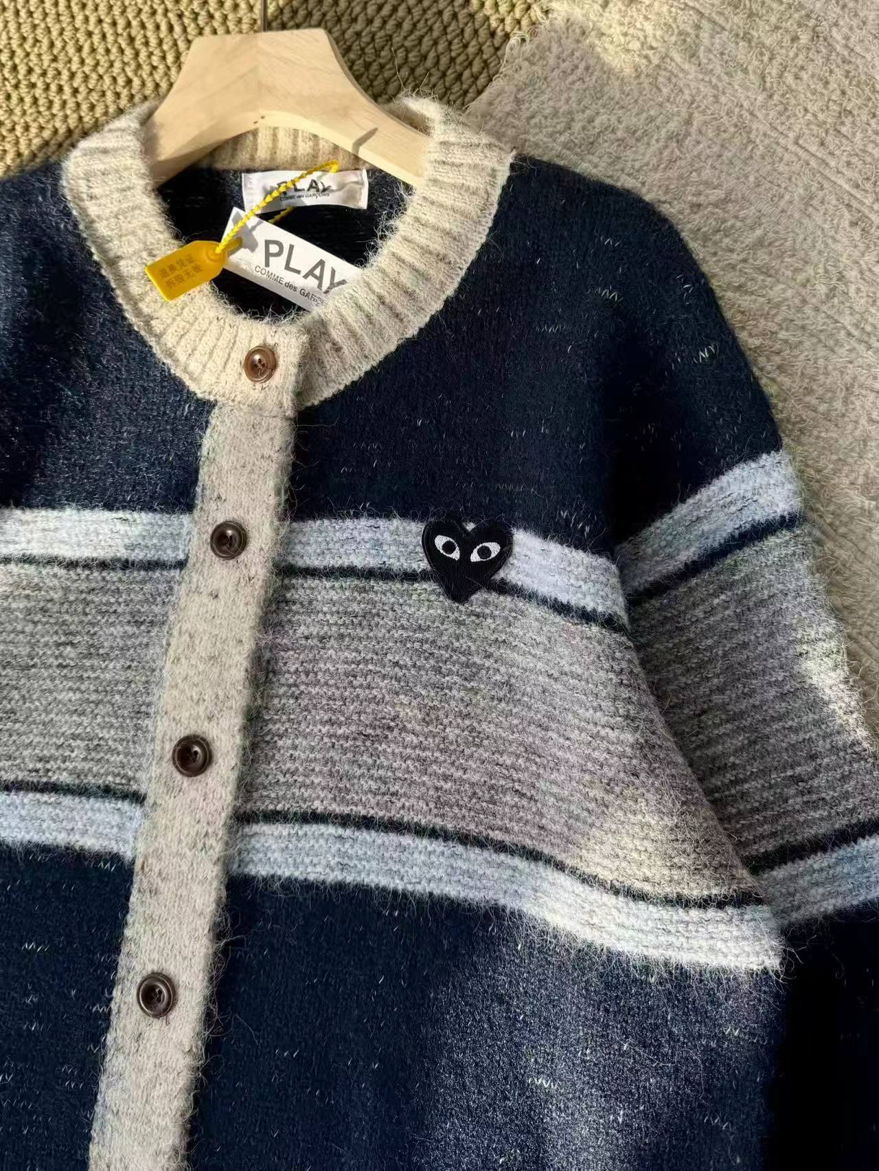 这款毛衣是一件风格复古又不失可爱拼色设计,色彩搭配复古且有层次。采用圆领单排扣版型,穿脱方便且能很好地修饰颈部线条。衣身带有标志性的黑色爱心眼睛图案,为整体增添了灵动俏皮感,同时也具有较高的品牌辨识度。材质看起来柔软亲肤,整体版型偏宽松,是一件兼具复古感与时尚感的单品,可轻松打造出休闲又不失格调的穿搭风格,适合多种场合穿着。