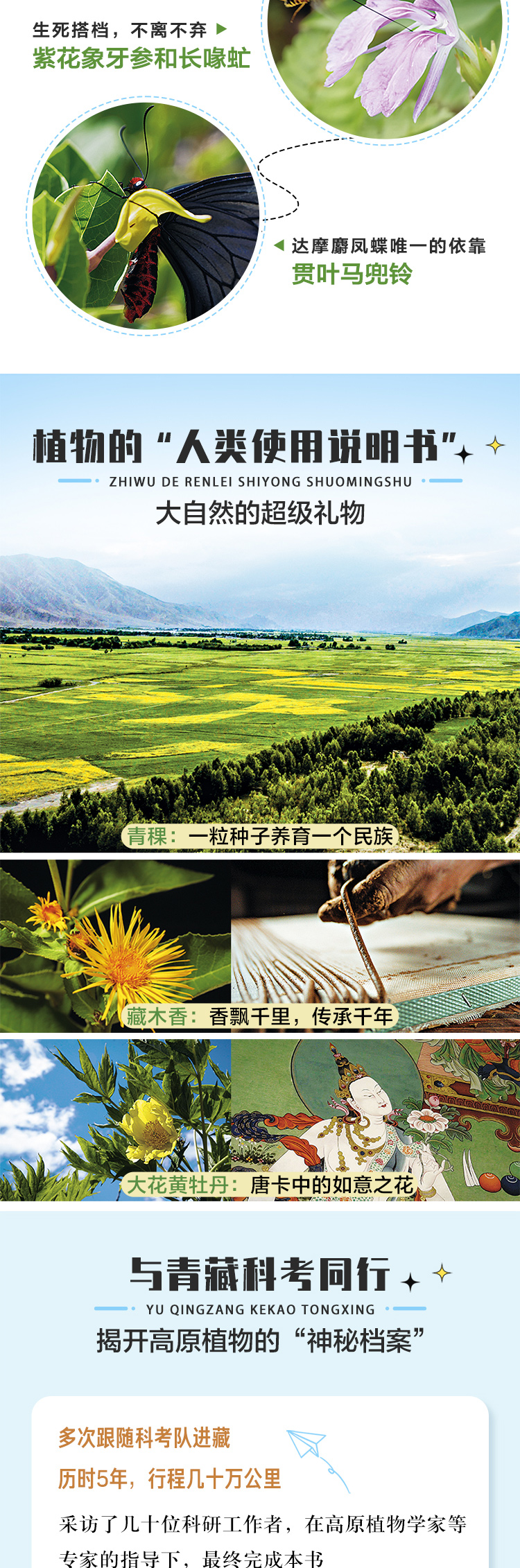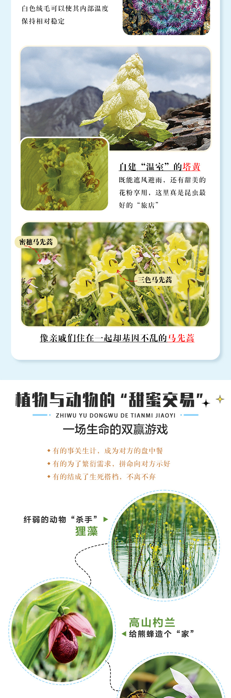 本书主要介绍了青藏高原*的野生植物资源,揭示了它们在严 酷的高原环境中为了生存与繁衍而焕发出的顽强生命力和为了适应环境所展现的令人惊叹的演化奇迹。全书共分为 6 章,介绍了喜马拉雅山脉的崛起及其植物种类的多样性,高原植物的生存智慧,以及高原植物与动物、人类紧密依存的关系,反映了高原人民与自然和谐互动、共存共生,展示了科学家和高原人民为践行当代生态文明理念和保护国家种质资源做出的努力。本书适合植物爱好者阅读,也适合对喜马拉雅山脉、青藏高原感兴趣的大众读者阅读。