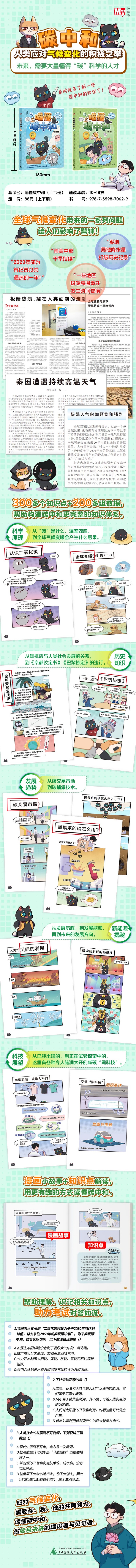 《喵懂碳中和》(上下册)为一套运用漫画形式向青少年读者普及碳中和相关知识的图书。书中通过环境专业研究生李热与猫咪小碳的对话、知识小贴士(“来点小鱼干”),以及大量详实的数据阐释了碳中和相关的概念,如碳达峰、温室气体、增温潜势、可再生能源等,详细介绍了碳中和碳达峰提出的背景、意义、实现途径、发展历史及发展现状,并介绍了我国在实现碳中和碳达峰目标上所取得的成就等。其中,上册从全球变暖、气候变化入手,依次介绍了全球变暖的原因、温室气体的概念及人类排放现状、如何应对全球变暖、节能减排的意义及做法等内容。下册则向读者介绍了可再生能源技术和日常生活中的低碳知识。书中依次叙述了太阳能、风能、水能、生物质能、氢能等可再生能源的概念及目前对这些能源开发利用的情况,同时还介绍了人们日常生活中与吃、穿、住、行相关的碳知识,用孩子们容易理解和接受的方式介绍了低碳生活理念。