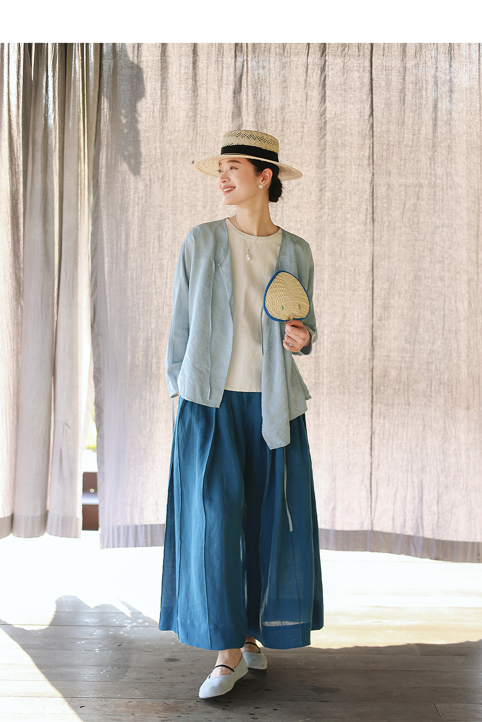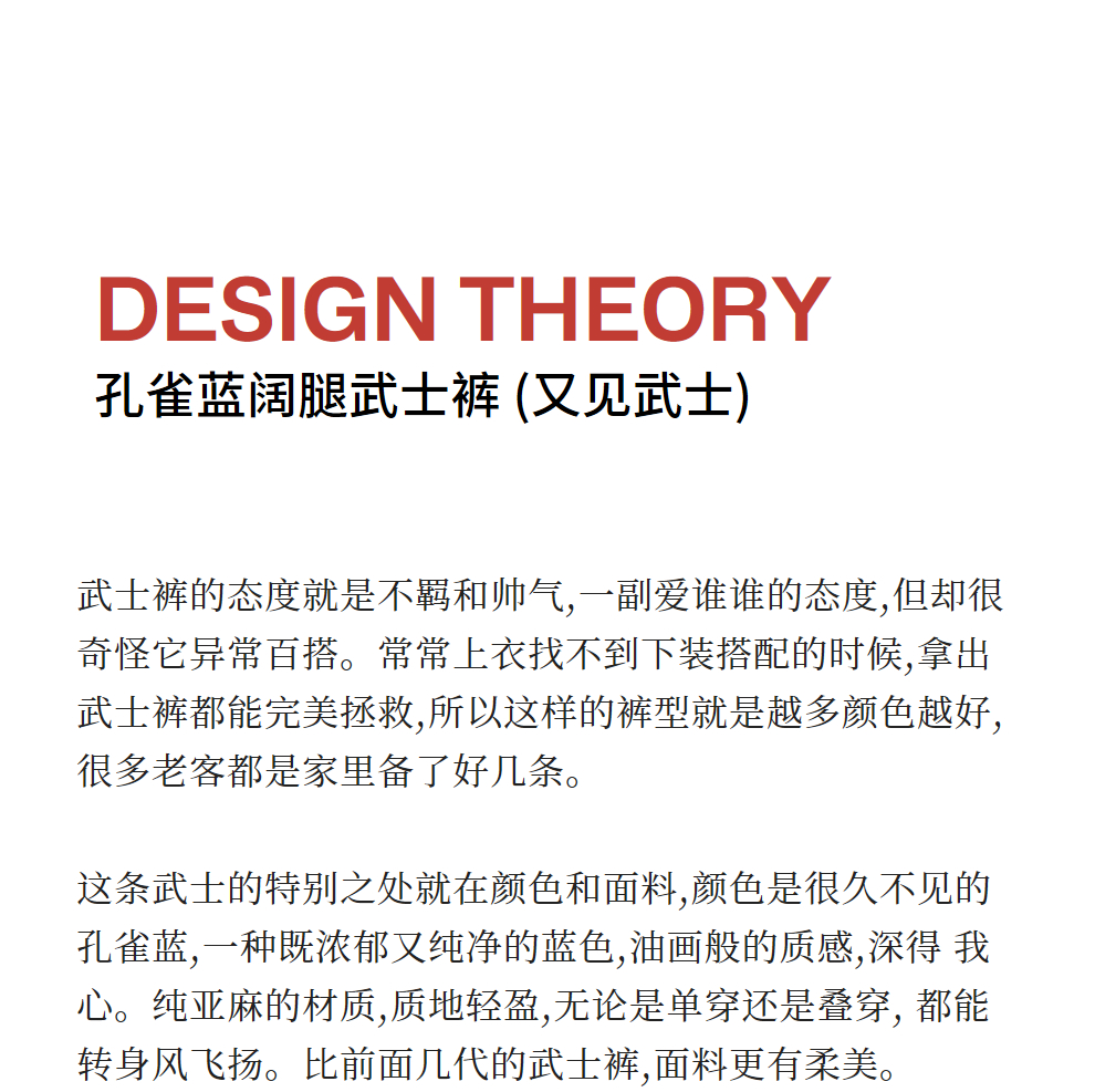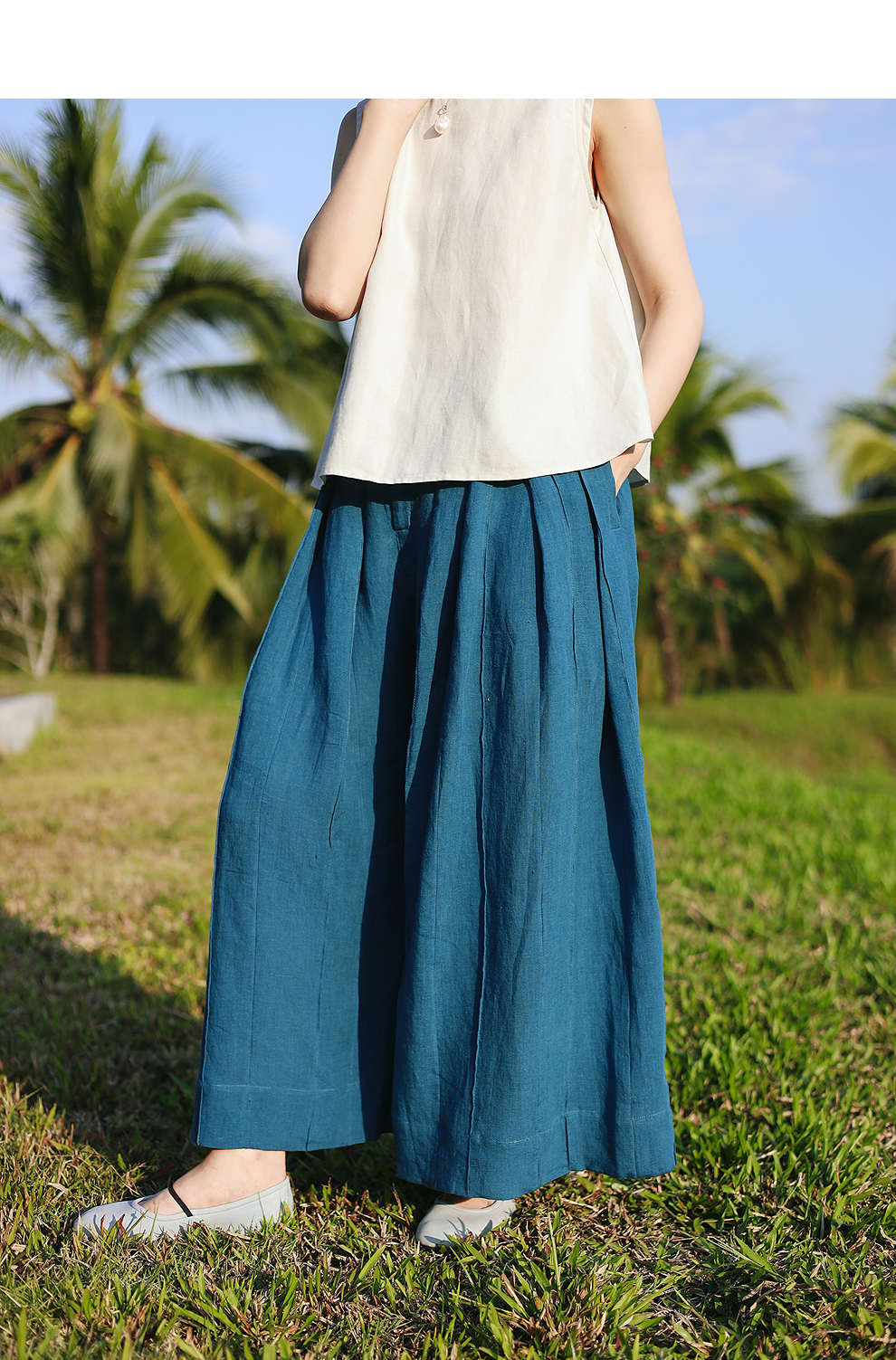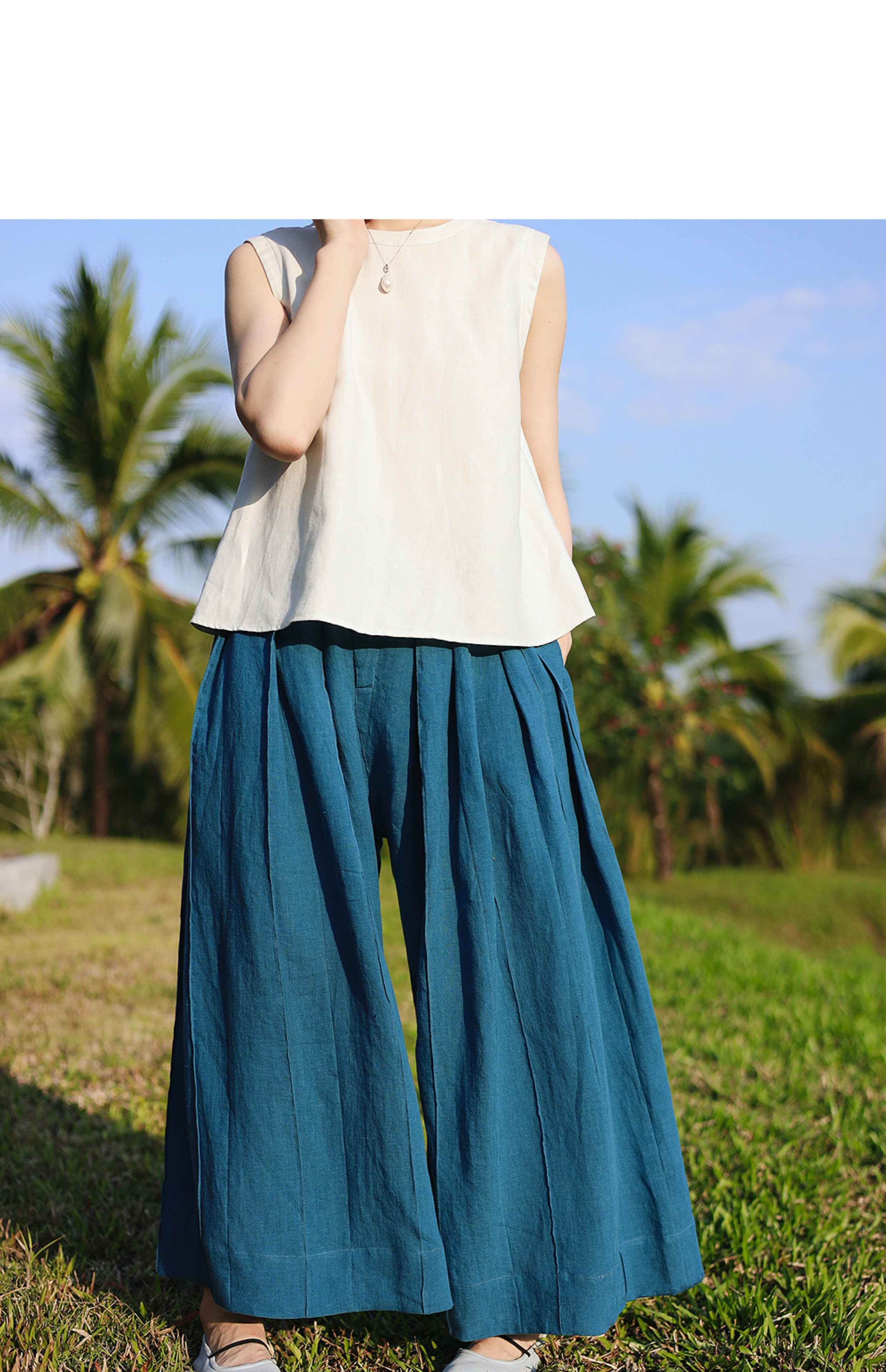 绽放旅行女装154朵/又见武士阔腿长裤孔雀蓝亚麻百搭宽松武士裤