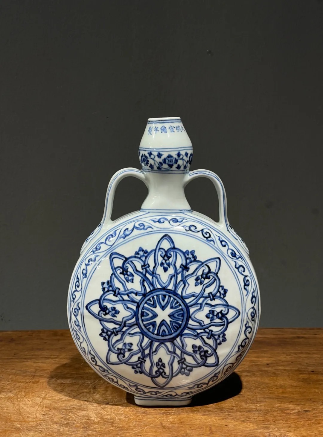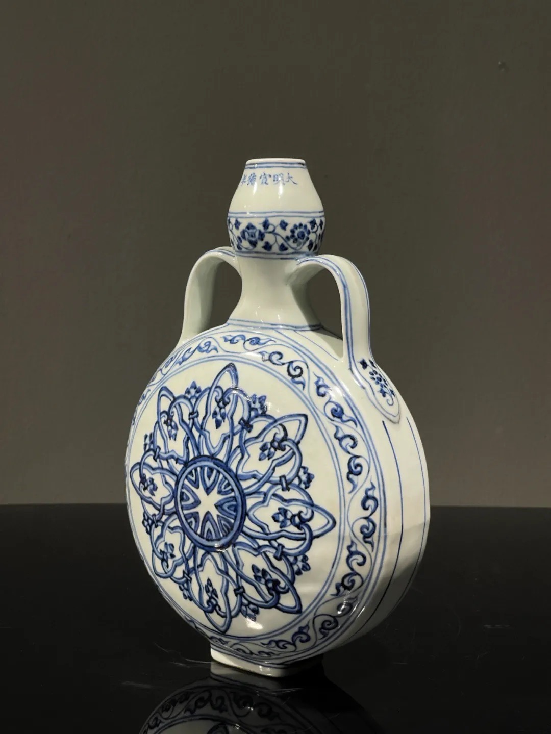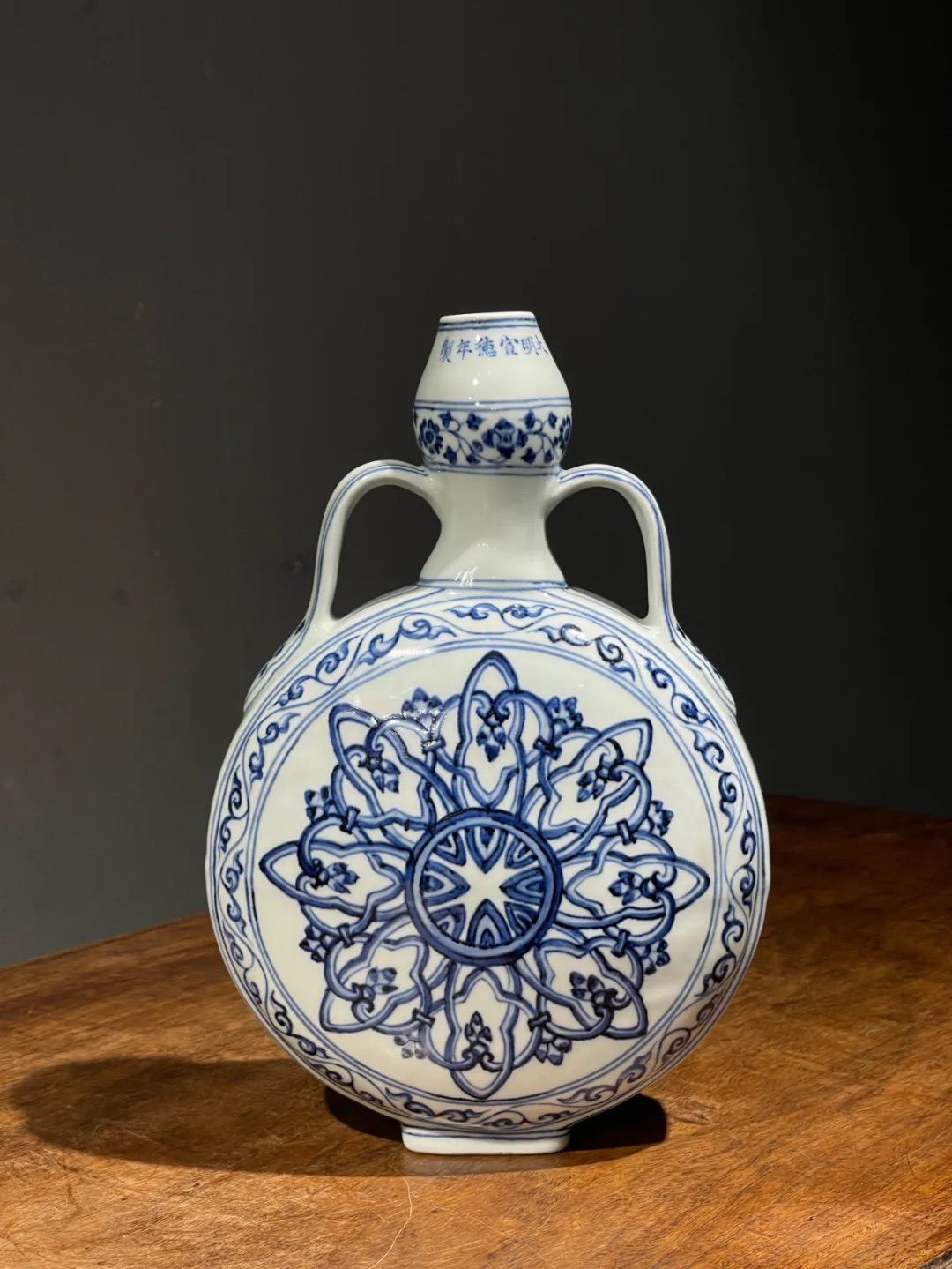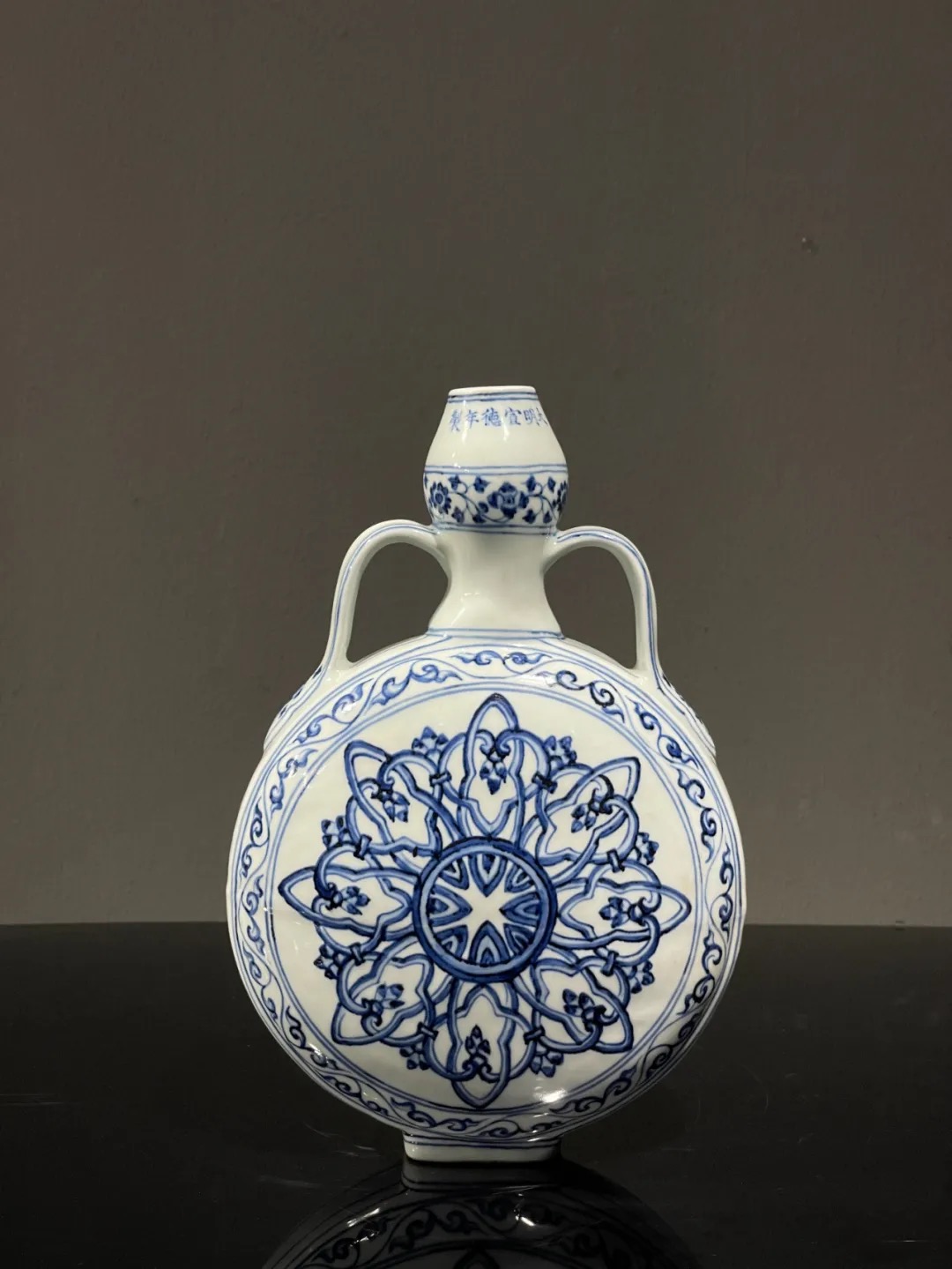 这件烧造于景德镇的青花瓷器扁壶是以明代早期的瓷器风格精心制作而成,景德镇特有之洁白高岭土为胎,葫芦型双系扁壶,壶身以深蓝青花料绘波斯星纹饰,口沿下方横书六字楷书款:“大明宣德年製”,扁壶造型独特,高雅贵气,器身双面绘波斯星纹与回纹及缠枝花卉边饰典雅独特,细节丰富流畅自然,绘工自然洒脱,白釉温润,底部长方圈足露出紧致的白胎,整体风格典雅高贵,近距离观赏令人赞叹,是景德镇传统瓷器技艺的结晶。