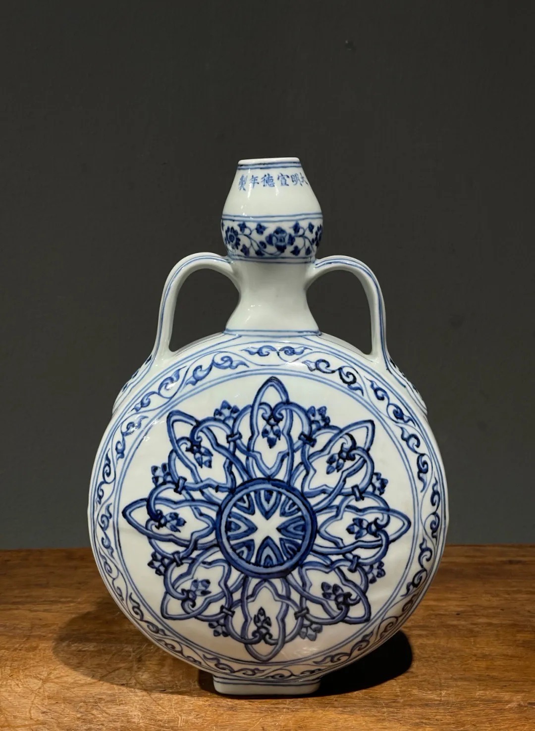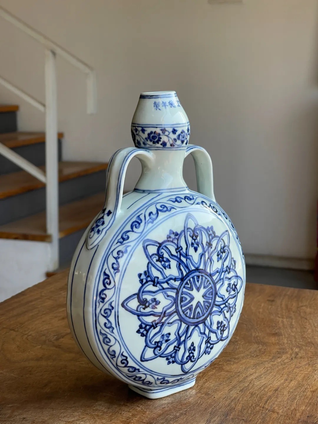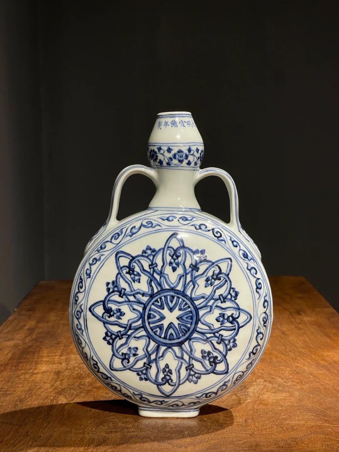 这件烧造于景德镇的青花瓷器扁壶是以明代早期的瓷器风格精心制作而成,景德镇特有之洁白高岭土为胎,葫芦型双系扁壶,壶身以深蓝青花料绘波斯星纹饰,口沿下方横书六字楷书款:“大明宣德年製”,扁壶造型独特,高雅贵气,器身双面绘波斯星纹与回纹及缠枝花卉边饰典雅独特,细节丰富流畅自然,绘工自然洒脱,白釉温润,底部长方圈足露出紧致的白胎,整体风格典雅高贵,近距离观赏令人赞叹,是景德镇传统瓷器技艺的结晶。