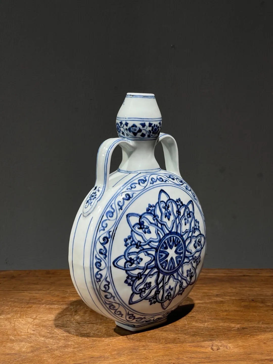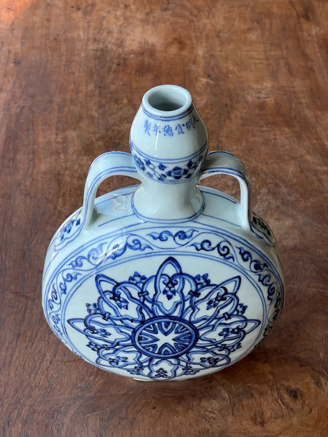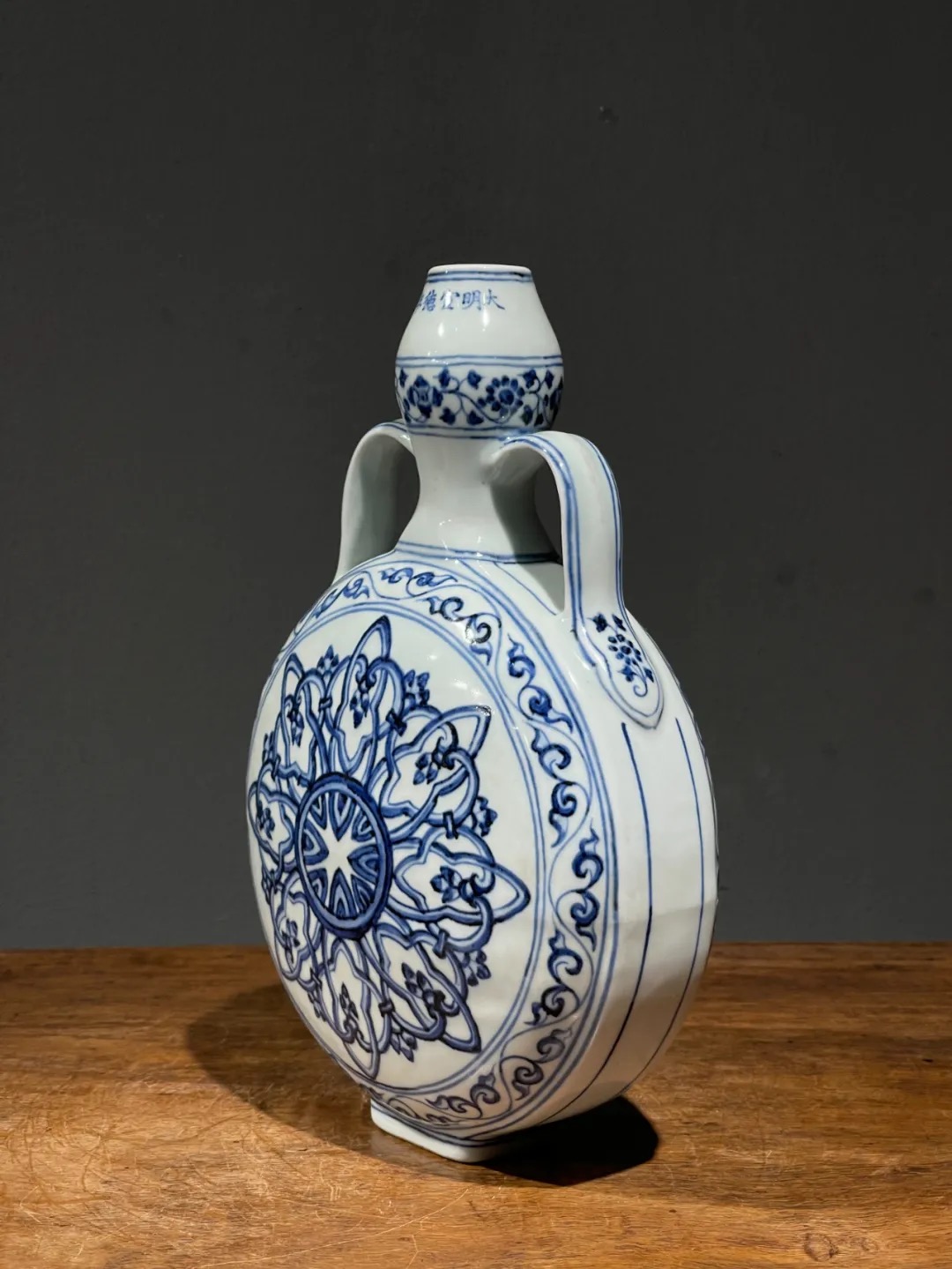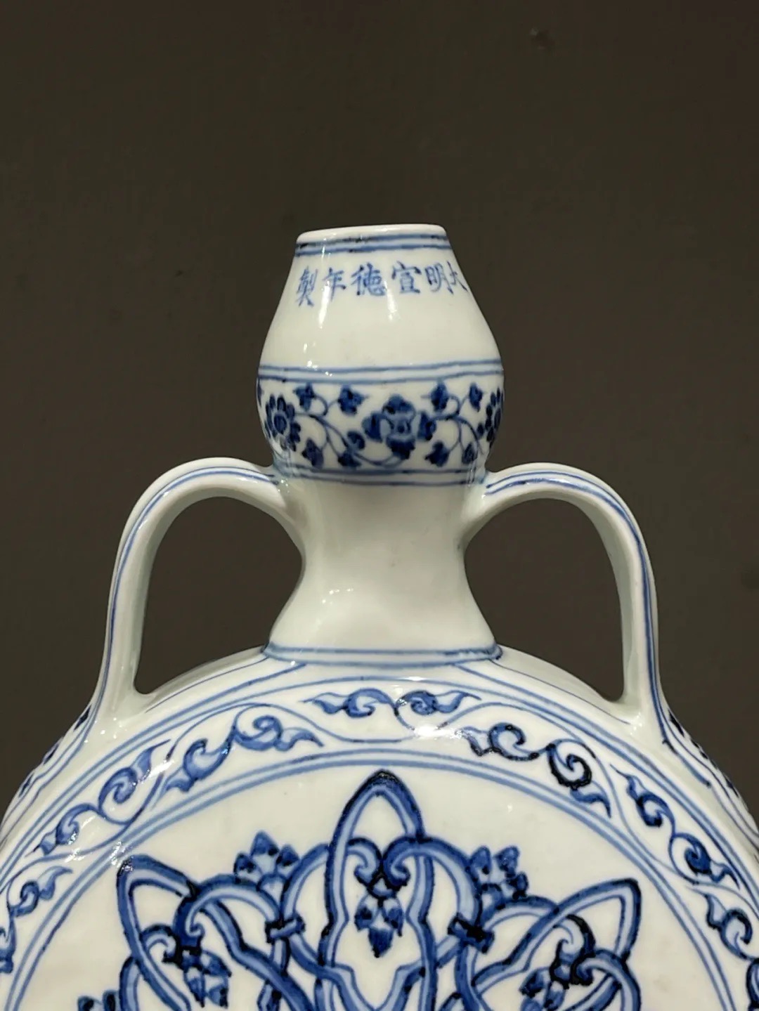 这件烧造于景德镇的青花瓷器扁壶是以明代早期的瓷器风格精心制作而成,景德镇特有之洁白高岭土为胎,葫芦型双系扁壶,壶身以深蓝青花料绘波斯星纹饰,口沿下方横书六字楷书款:“大明宣德年製”,扁壶造型独特,高雅贵气,器身双面绘波斯星纹与回纹及缠枝花卉边饰典雅独特,细节丰富流畅自然,绘工自然洒脱,白釉温润,底部长方圈足露出紧致的白胎,整体风格典雅高贵,近距离观赏令人赞叹,是景德镇传统瓷器技艺的结晶。