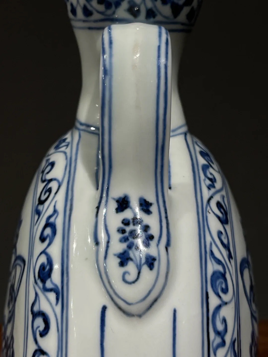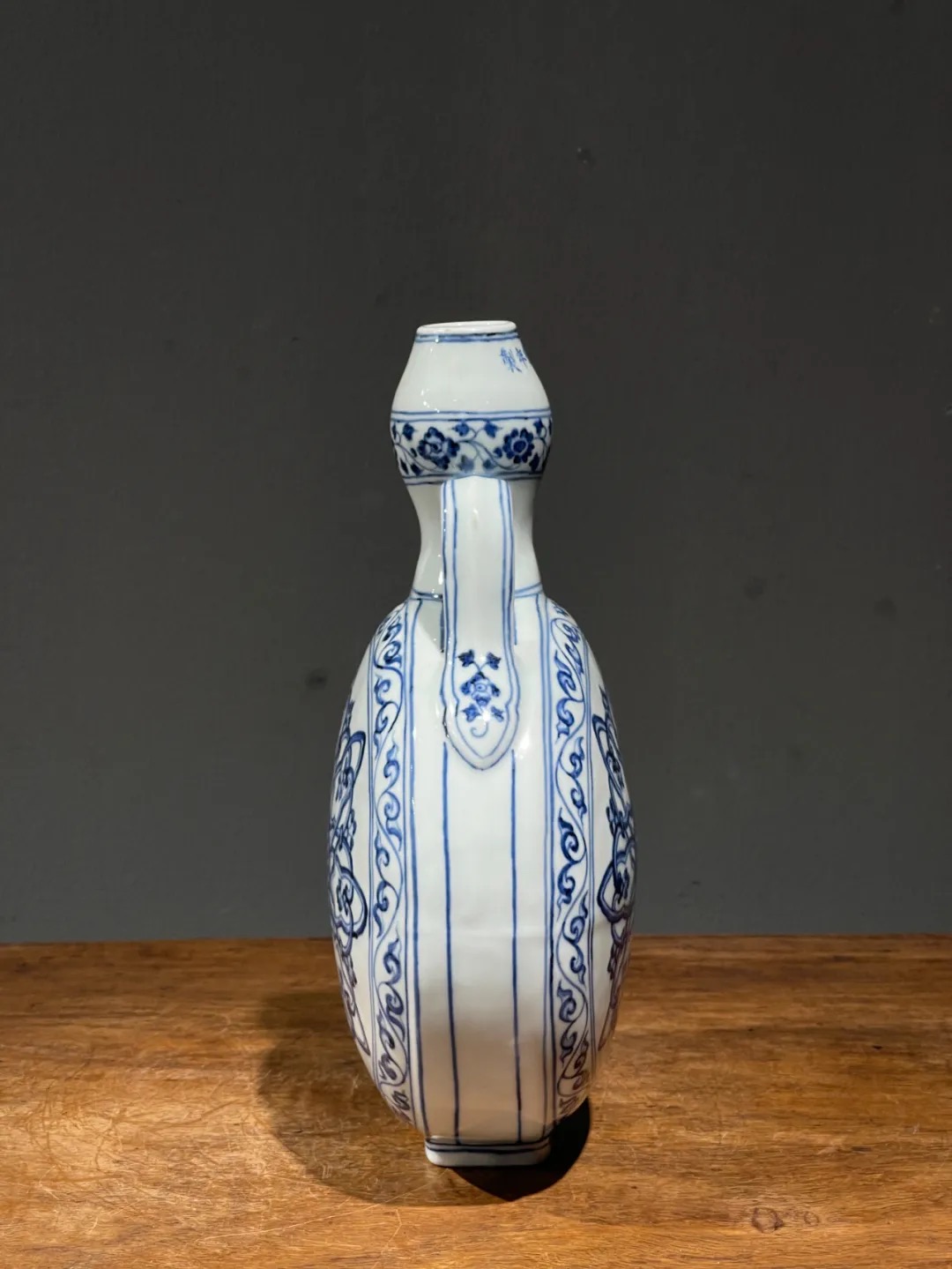 此青花绘波斯星纹双系葫芦扁壶制作严谨,胎体厚实,釉色温润,绘画流畅自然,青花料深蓝具進口苏麻离青钴蓝料的晕染特质,纹饰工艺细腻,非卓越工匠不可为,工艺水平与艺术性皆高。