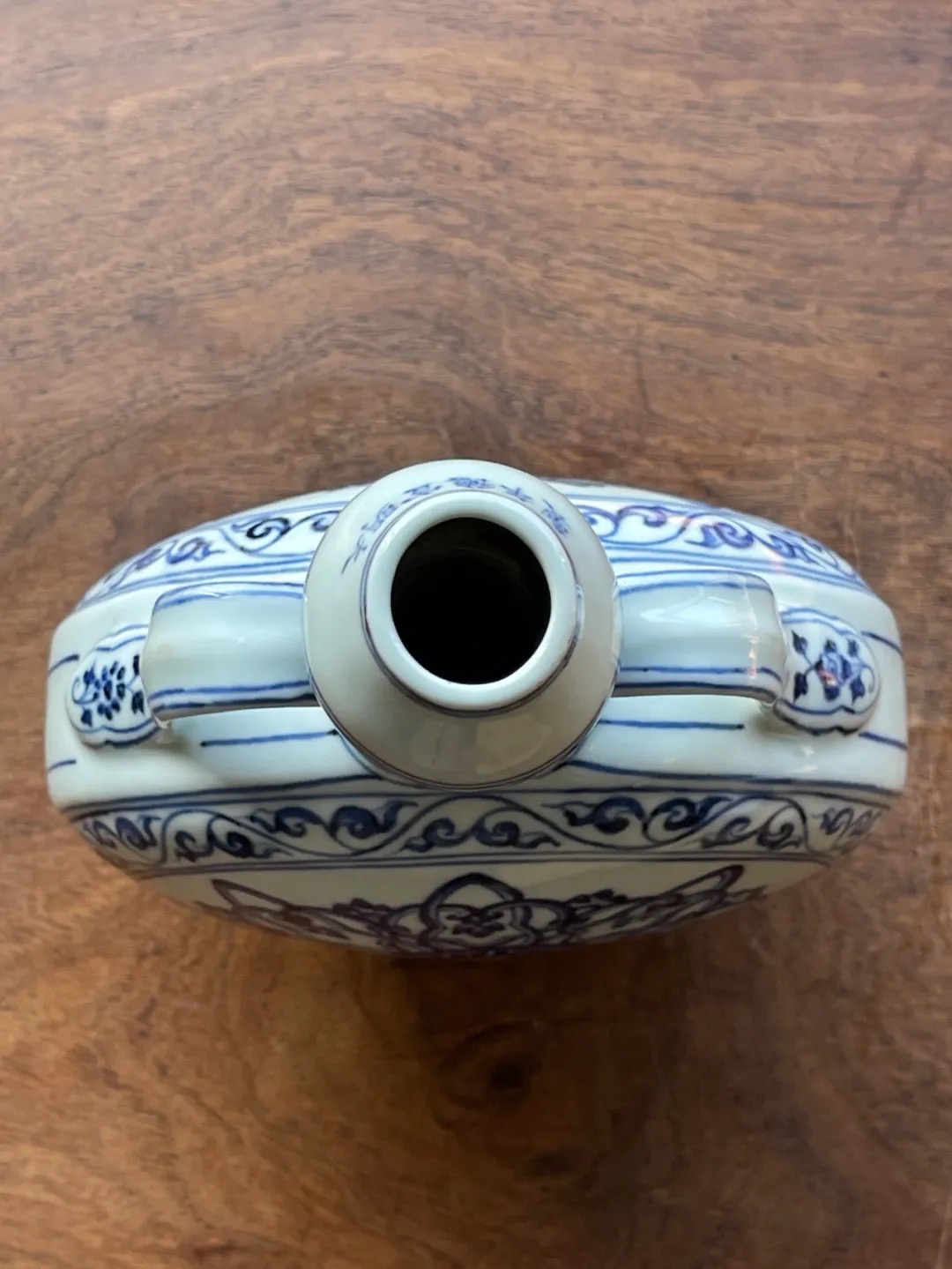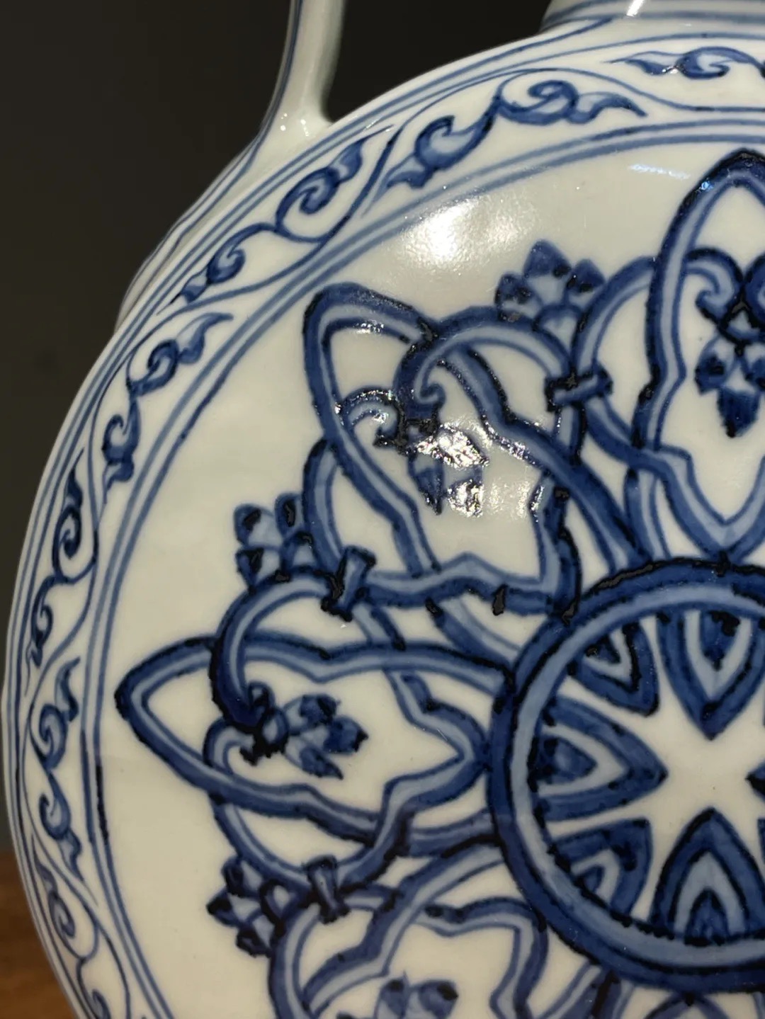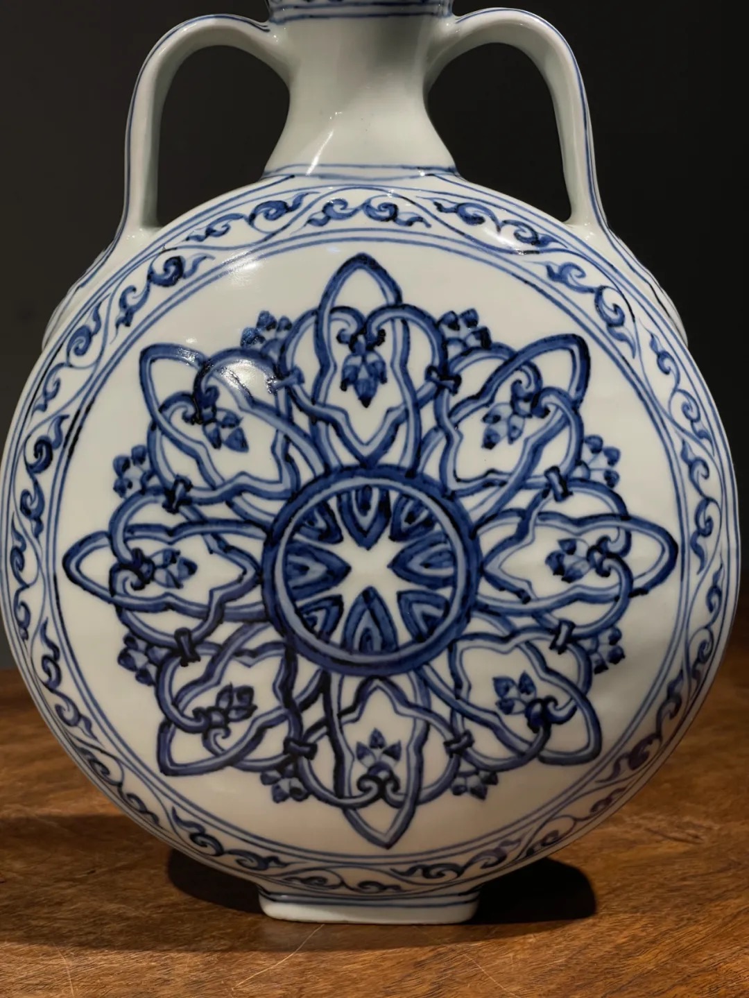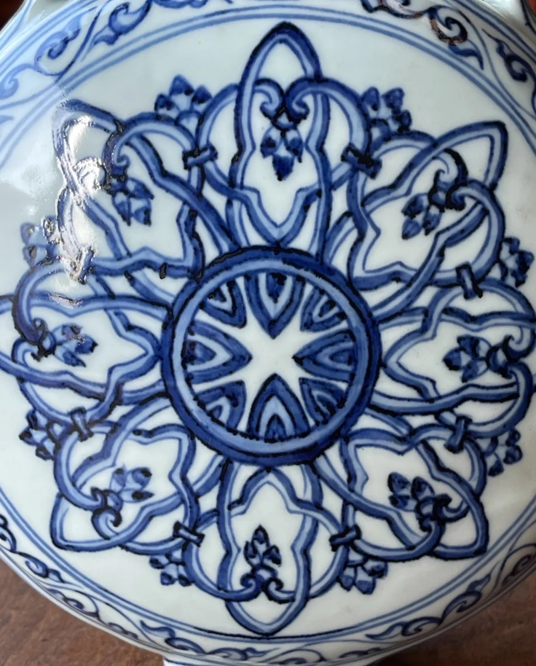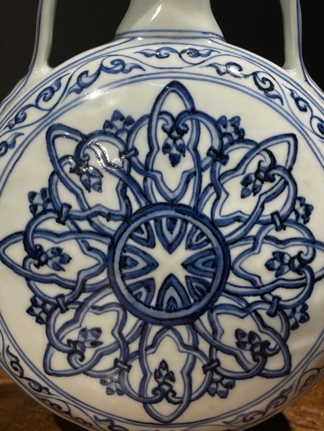 以进口之高品质苏麻离青钴蓝料绘制青花纹饰的装饰技法是景德镇高端青花瓷的制作工艺,这件碩大的波斯星纹扁壶,使用如此多昂贵的钴蓝料,其烧造费用之昂贵可见一斑。