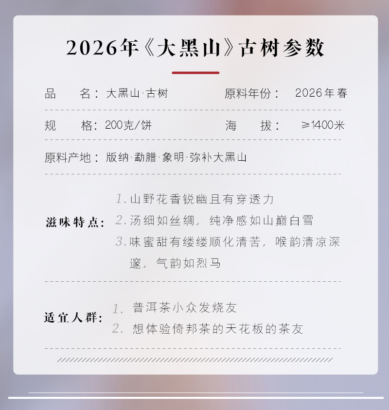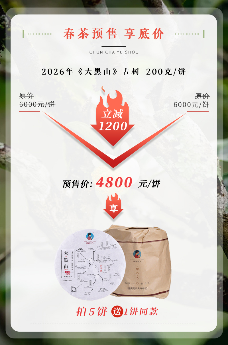 【会员专享 预售8折 买5送1】2026《大黑山》古树春茶 200克/饼 生茶