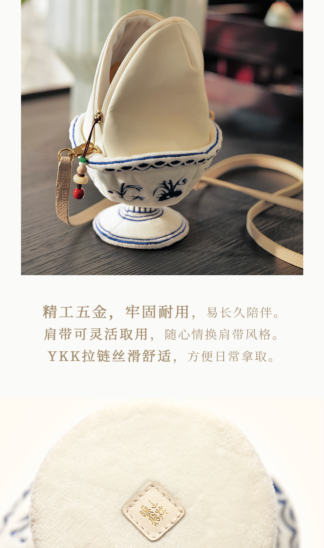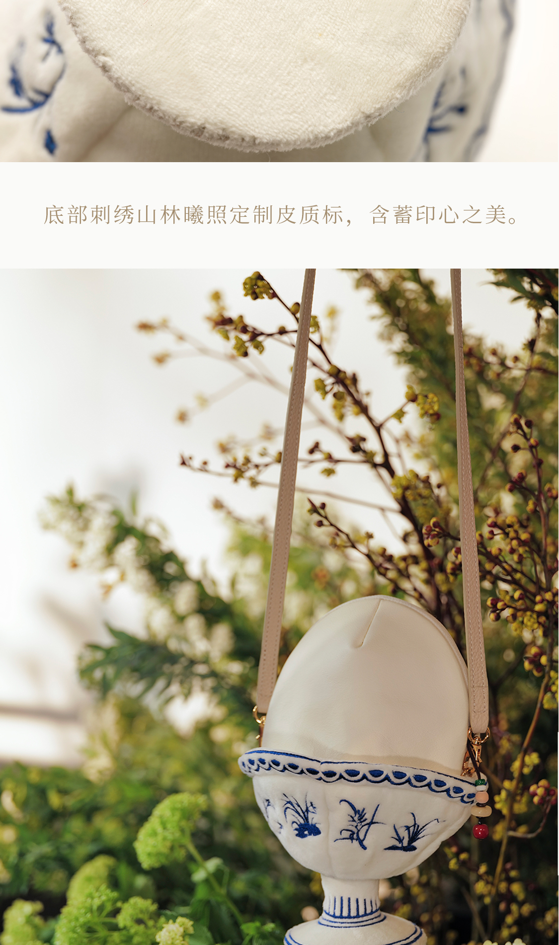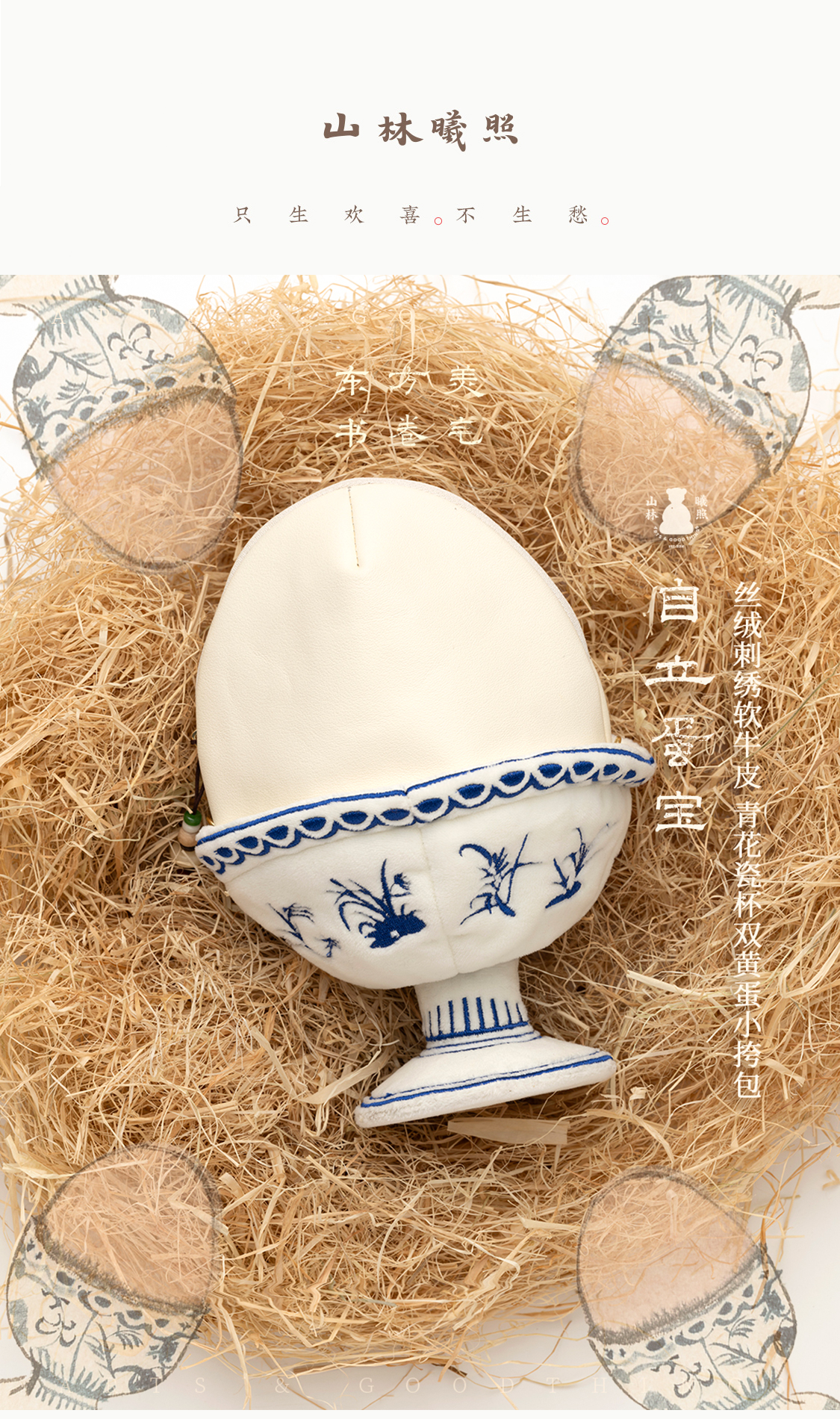 自立蛋宝 丝绒刺绣软牛皮 青花瓷杯双黄蛋小挎包 山林曦照