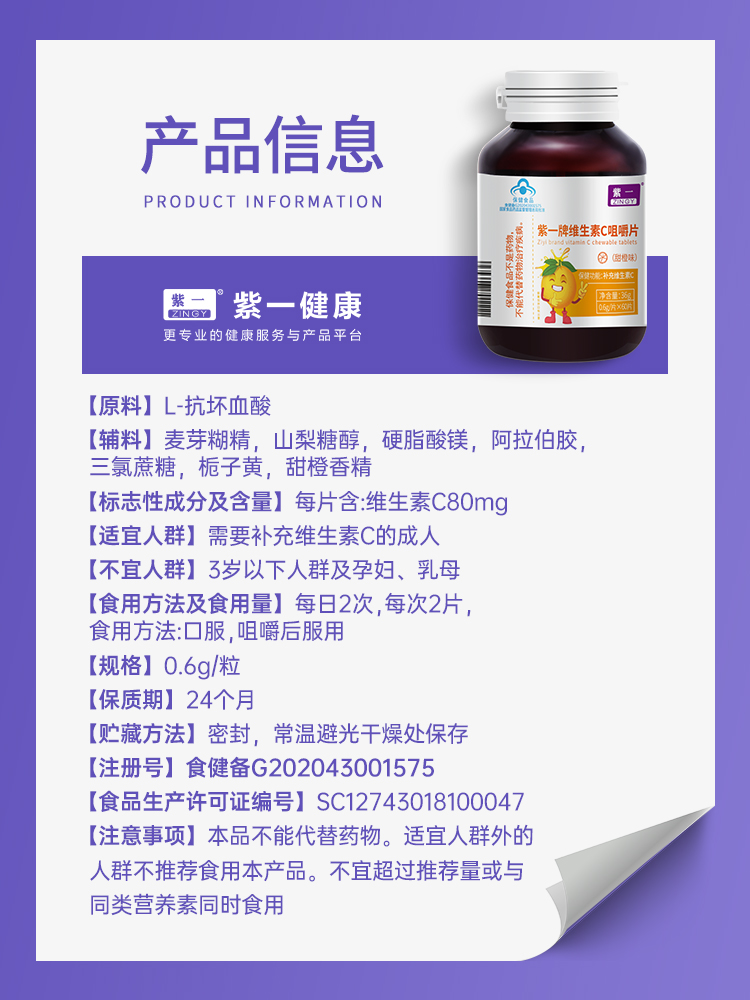 【效期2025年11月】【补充维C,家庭常备】紫一维生素C咀嚼片(甜橙味)60片/瓶