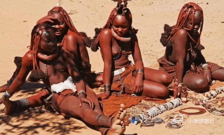 之后驱车前往红泥人部落,辛巴族人都生存在沙漠气候地区,是纳米比亚部落文化重要的组成部分。即使在殖民统治时期也一直维持着自己的传统生活方式。辛巴人的女子展示美的方式与众不同。她们袒露上身,喜欢用一种红色石粉和羊脂和在一起的红泥,涂抹在身上,就连头发也要用这种红色包裹。所以,辛巴人的身上在太阳下总是红的发亮。因此得名“红泥人”。她们认为这么做可以防止烈日的暴晒。