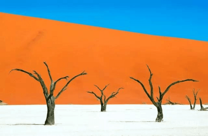 上午:享用早餐后,我们驱车前往苏斯斯利红沙漠深处, 达世界闻名的45号沙丘,世界上最高的独立式沙丘(325米)。之后前往死亡盆地,徒步进入,观赏一片荒漠中的枯树奇景,拍摄死亡和生命为主元素对比的经典照片