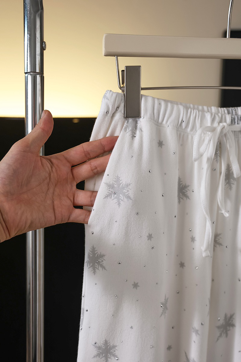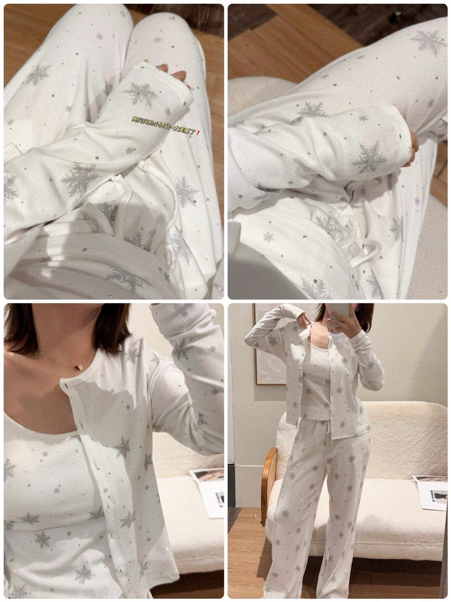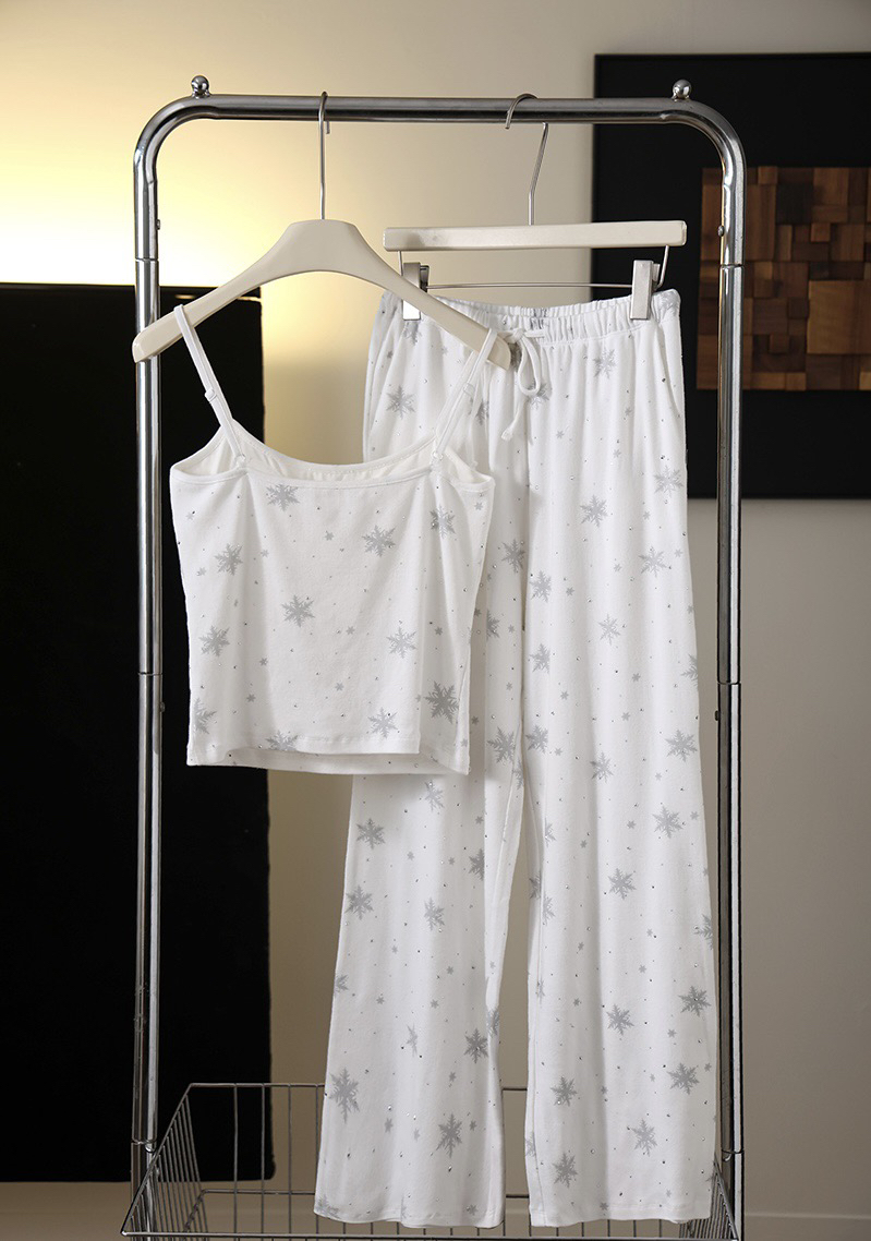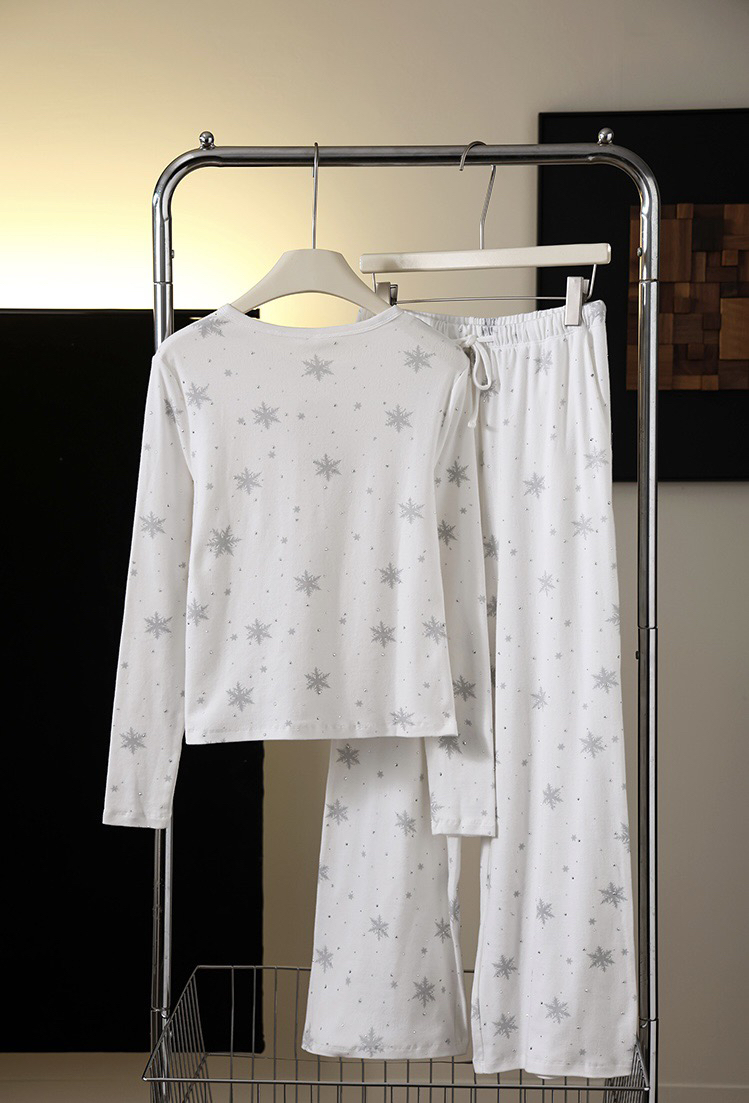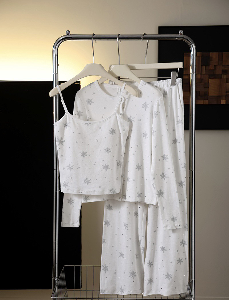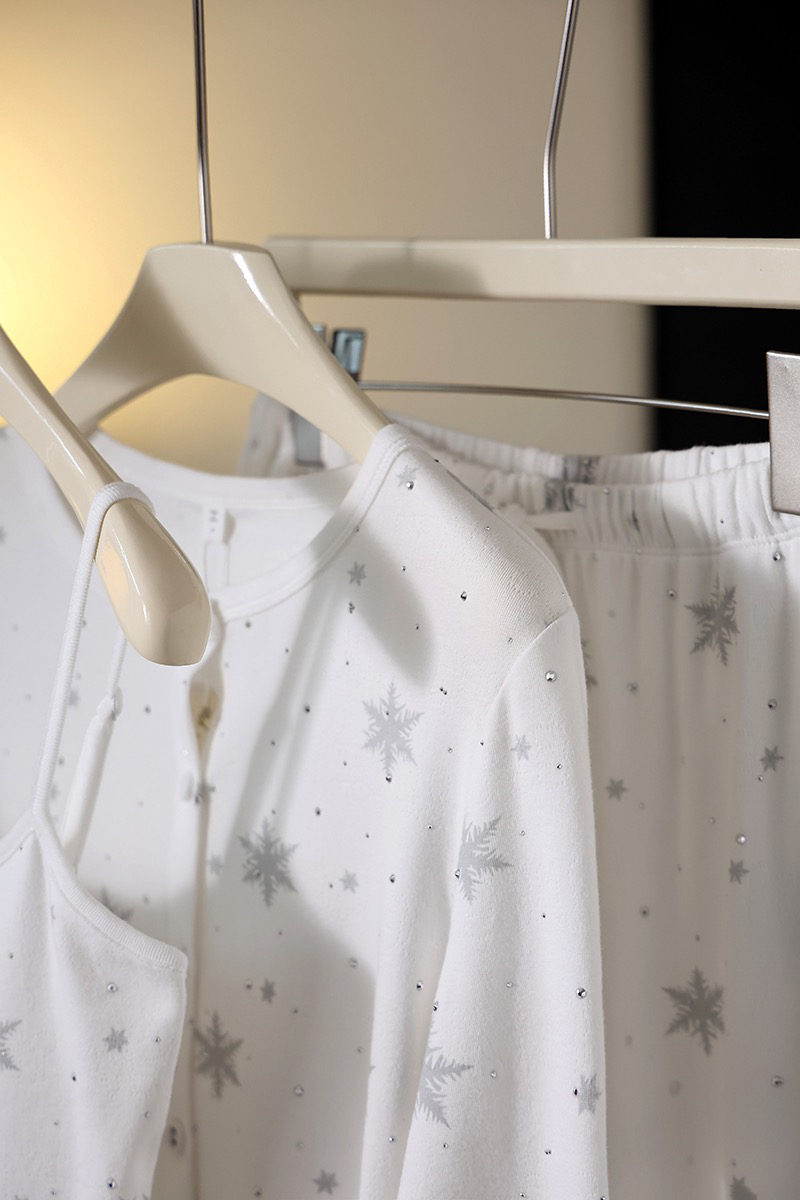 温柔显贵~skim雪花烫钻睡衣三件套 免穿文胸吊带+长袖开衫+长裤 雪花图案 blingbling烫钻 镂空提花 精致家居服