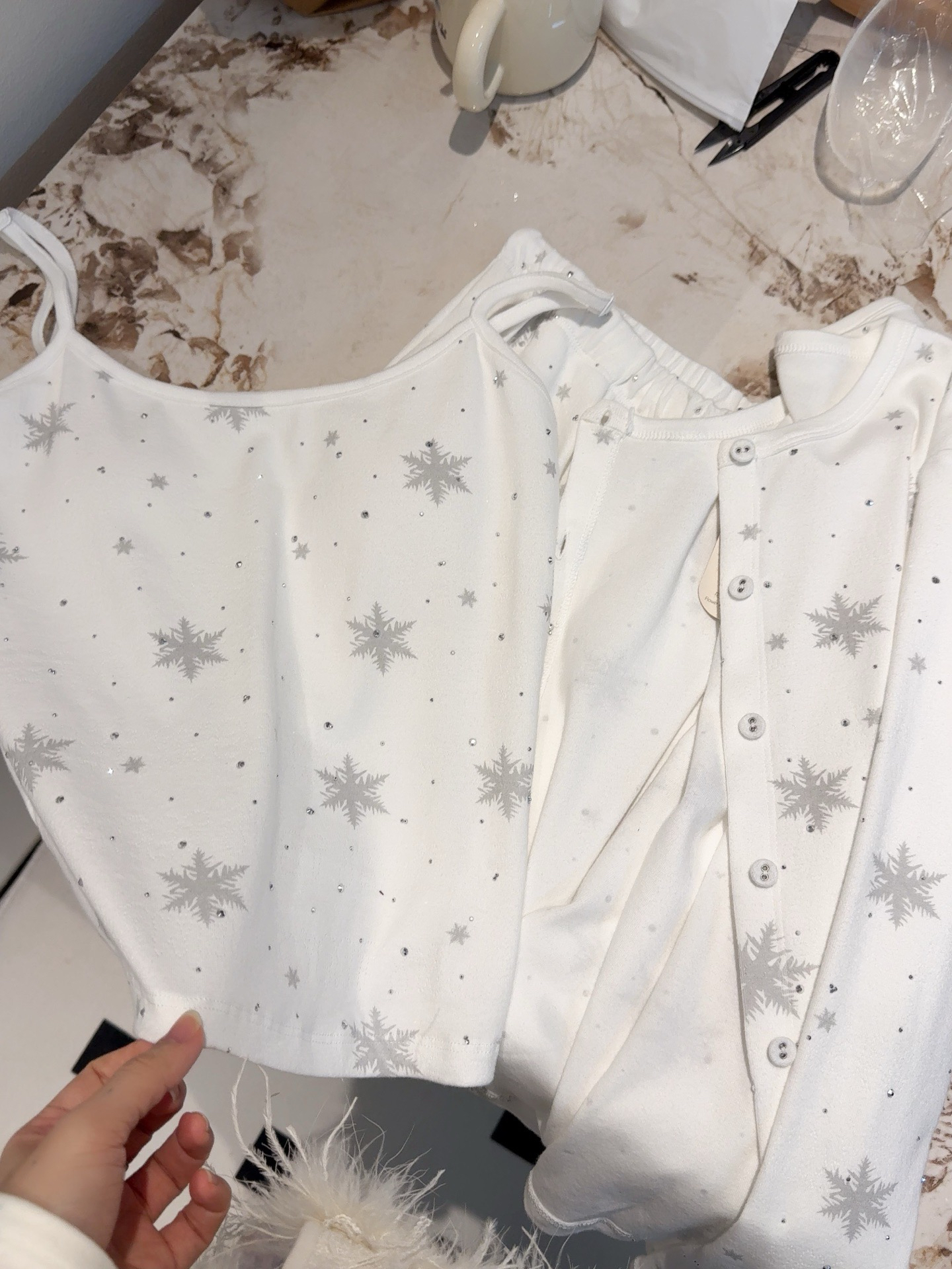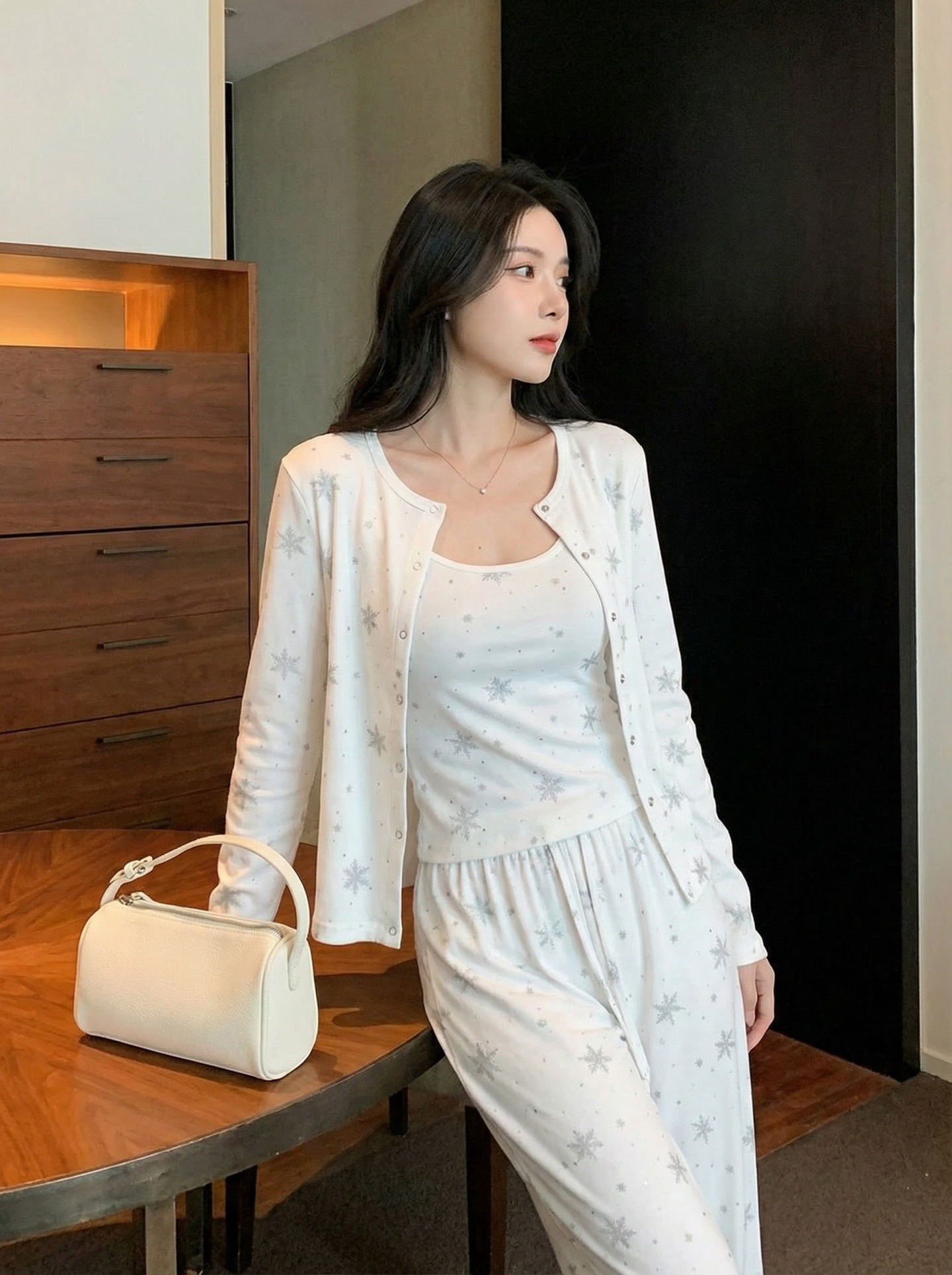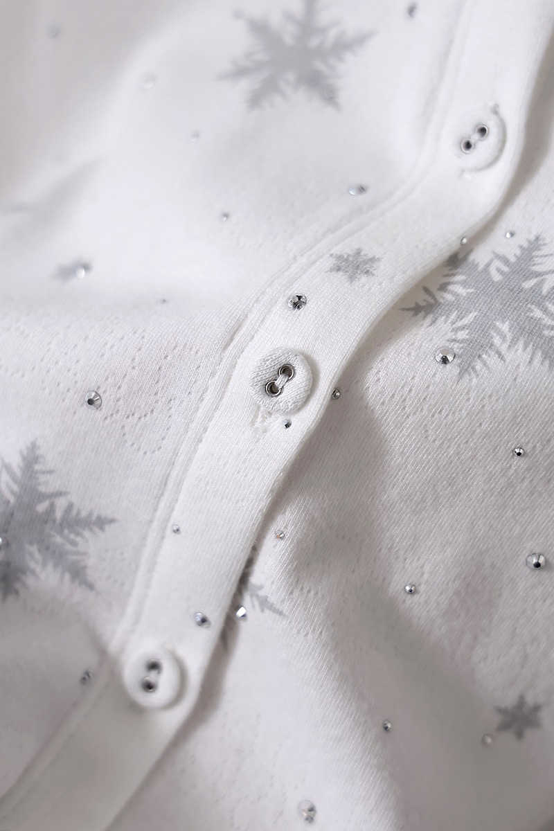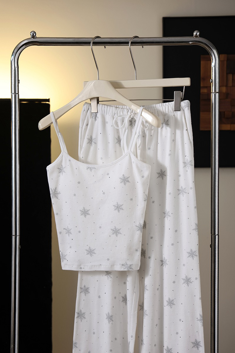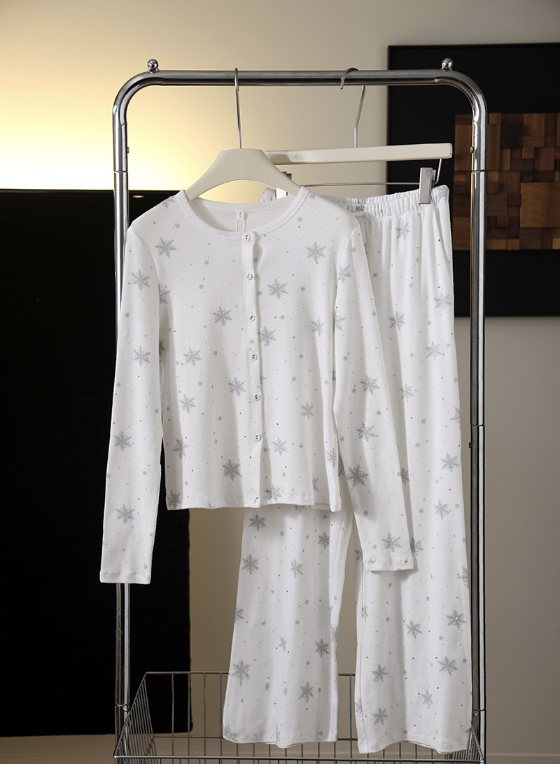 温柔显贵~skim雪花烫钻睡衣三件套 免穿文胸吊带+长袖开衫+长裤 雪花图案 blingbling烫钻 镂空提花 精致家居服