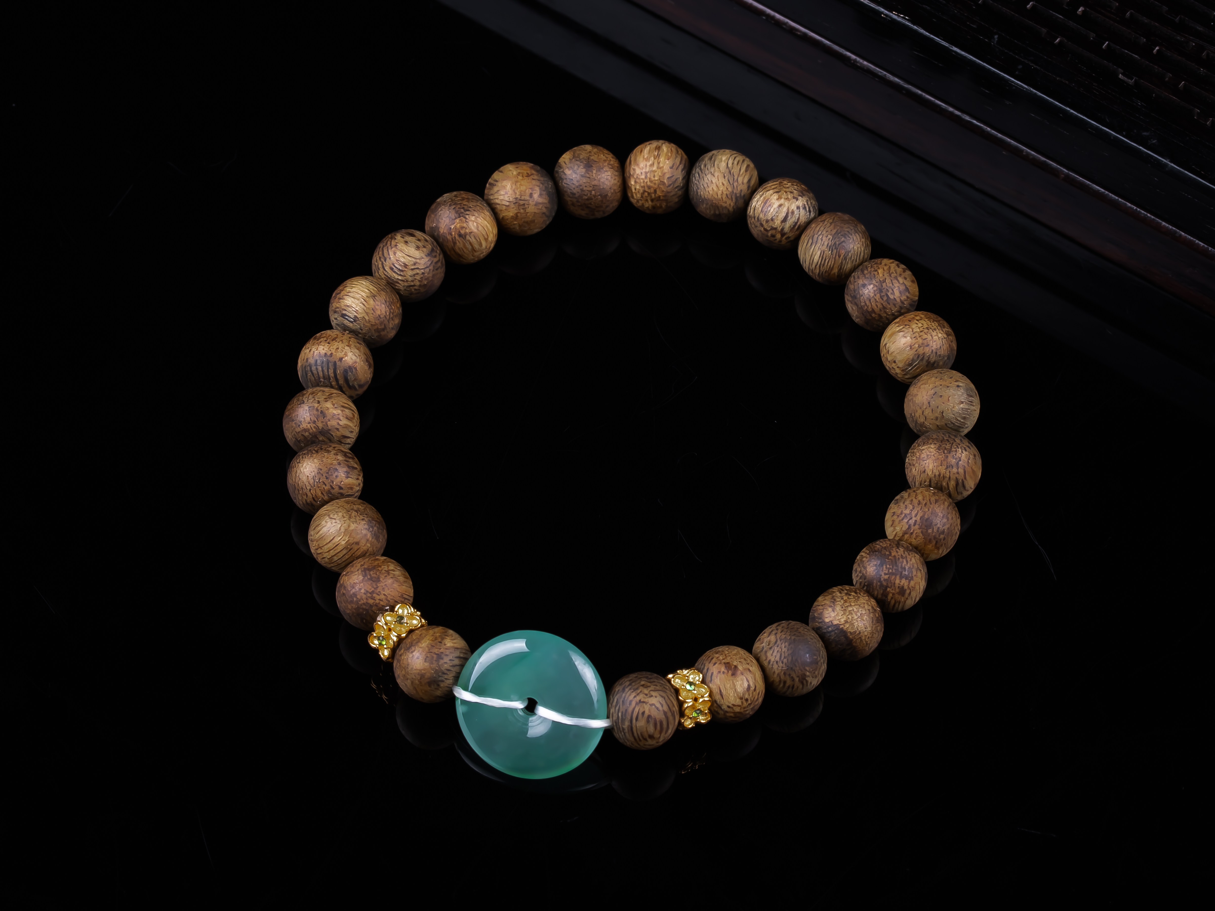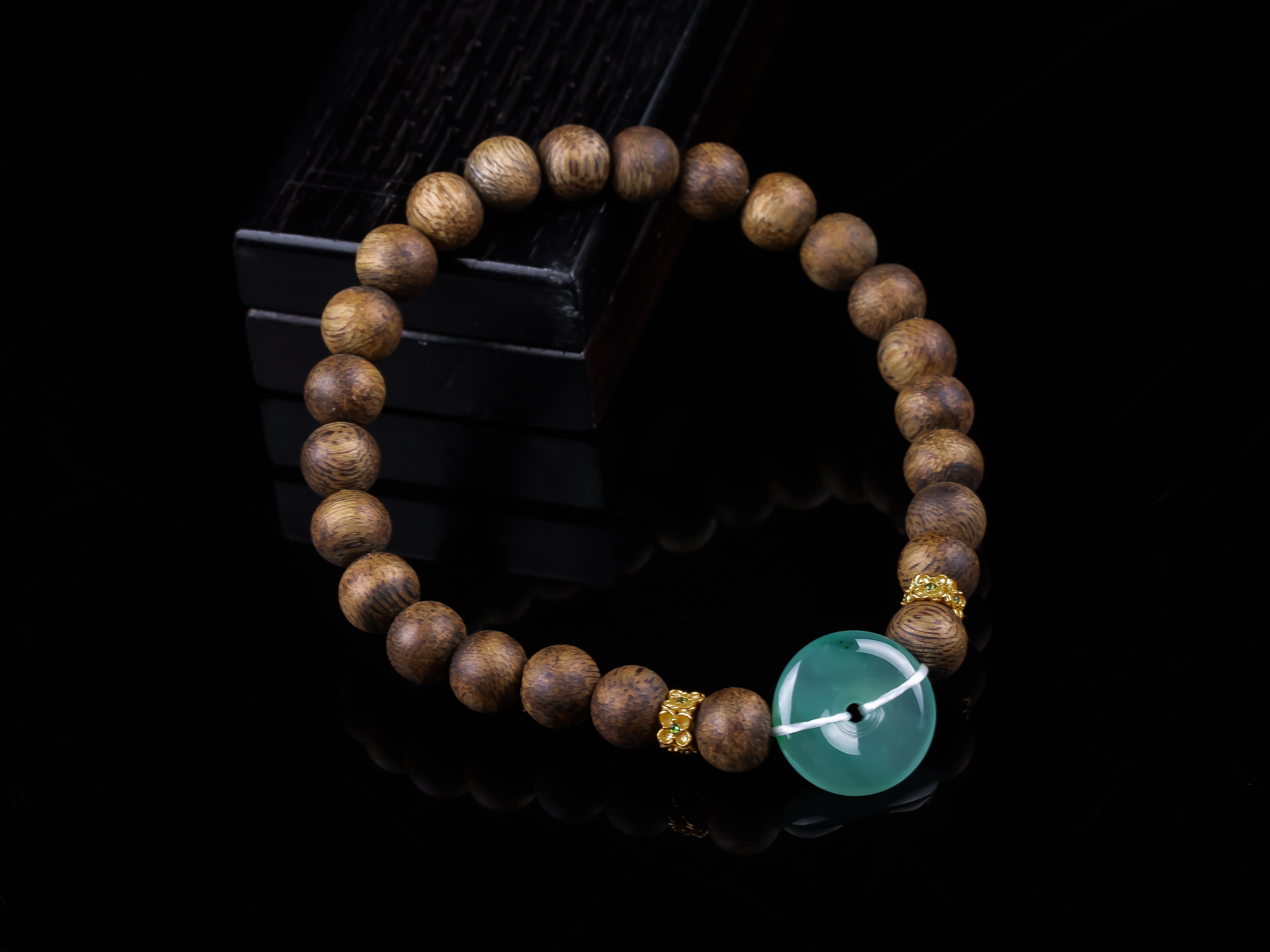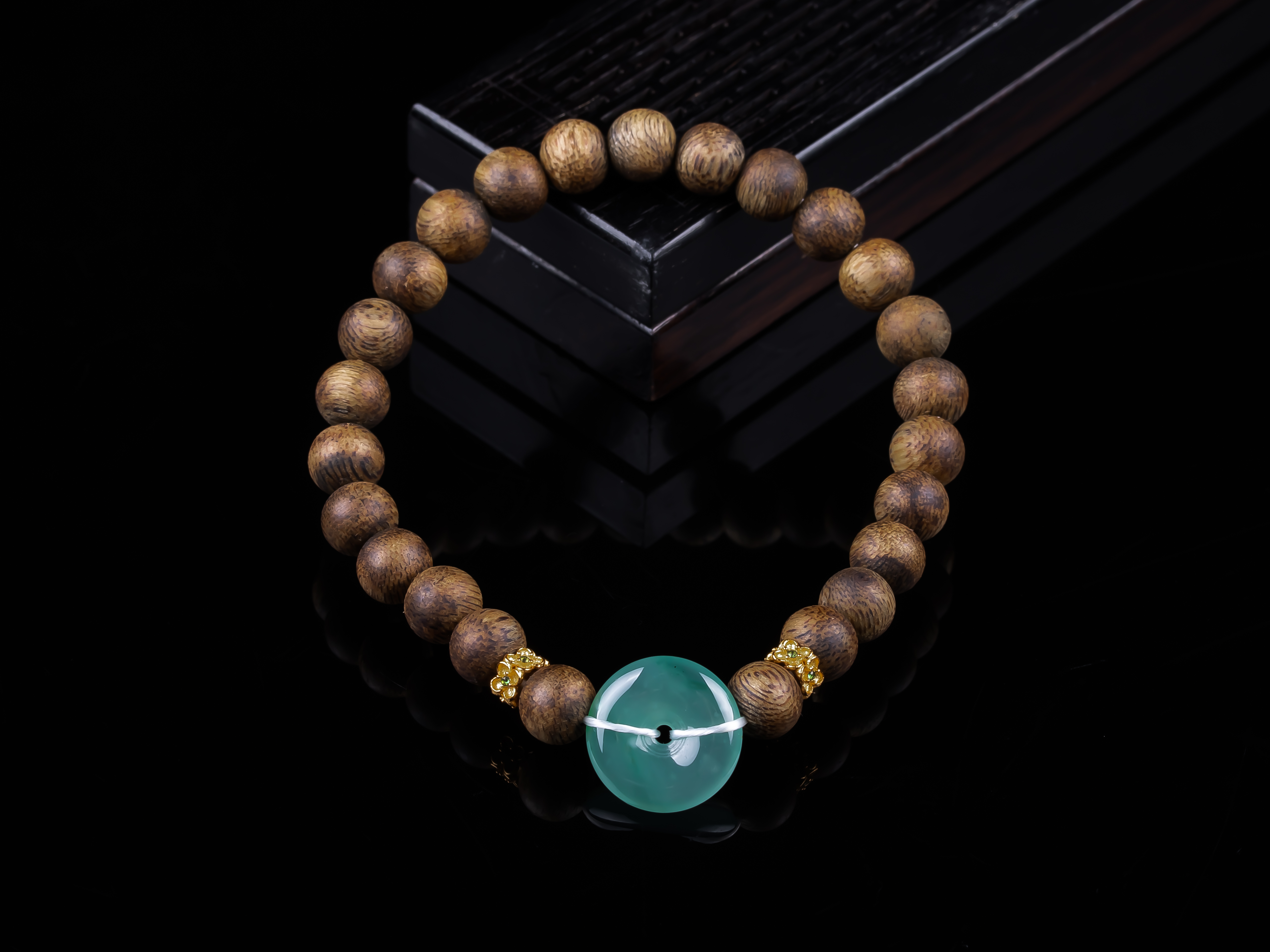 XY0203沉香+冰种翡翠平安扣手串,天然沉香约7.2mm,原色原味,香味自然清甜,冰蓝底的翡翠平安扣约14*3mm,种水细润,两颗925银花珠,搭配简约、大方,上手气质满满。