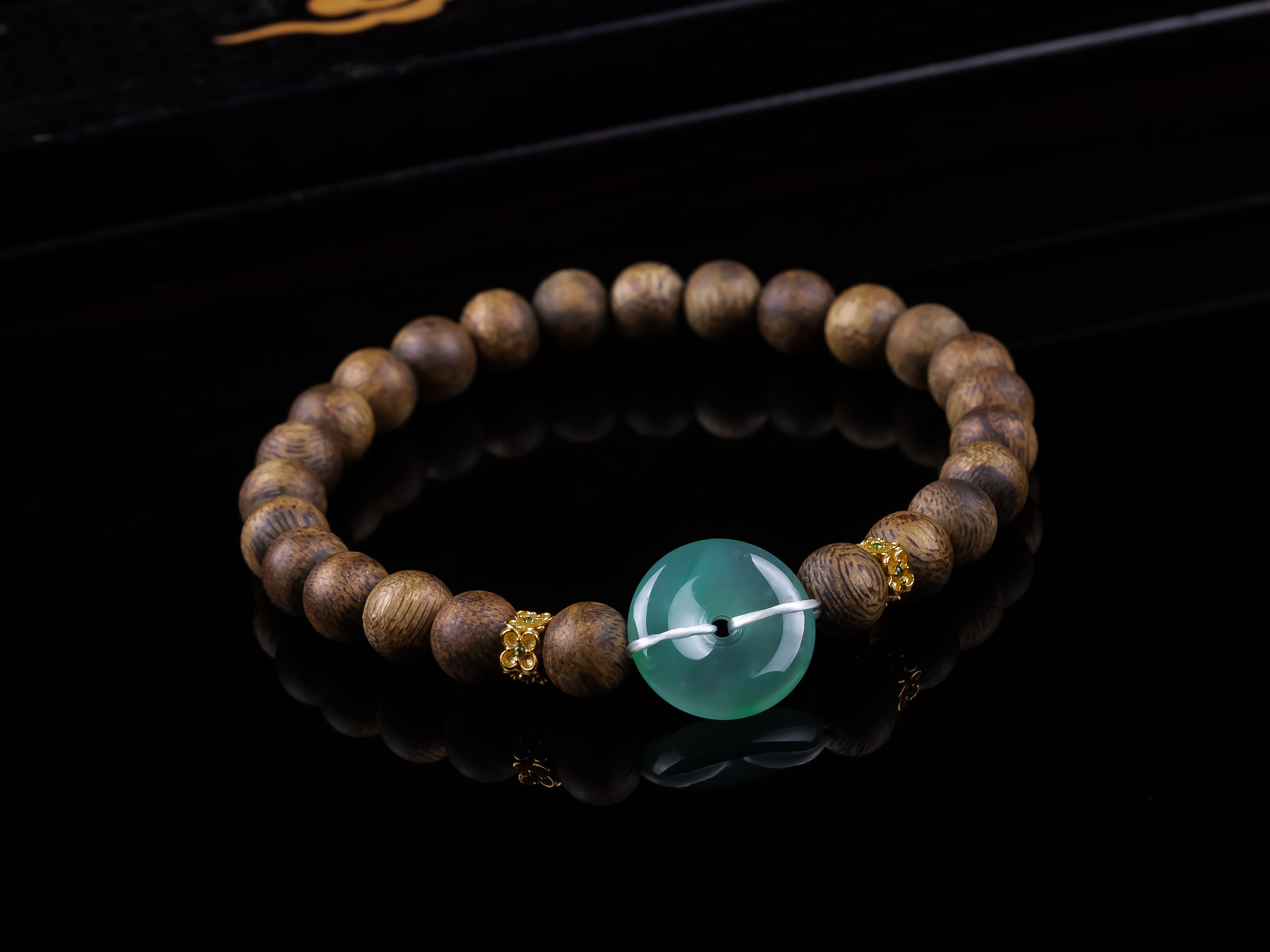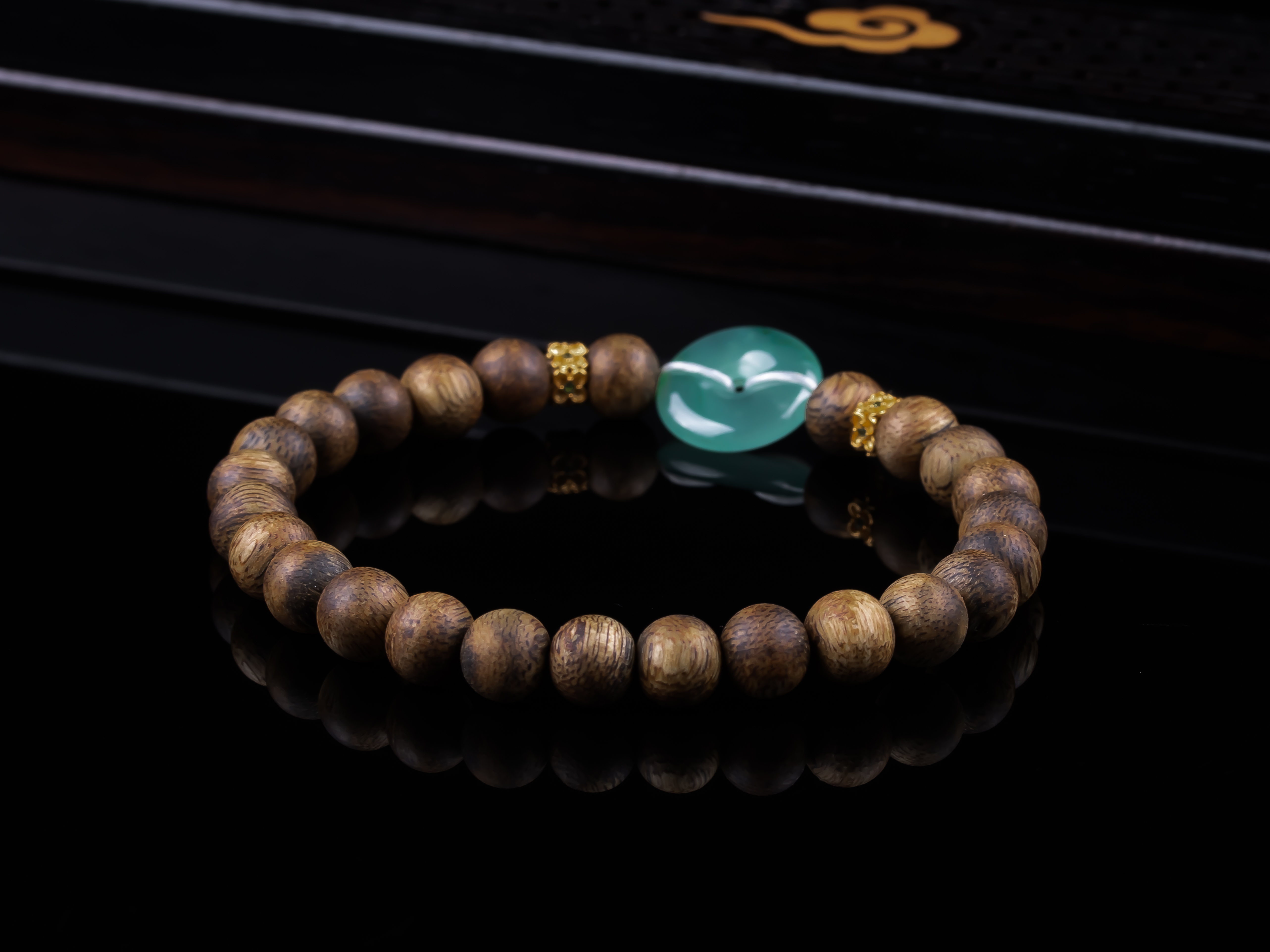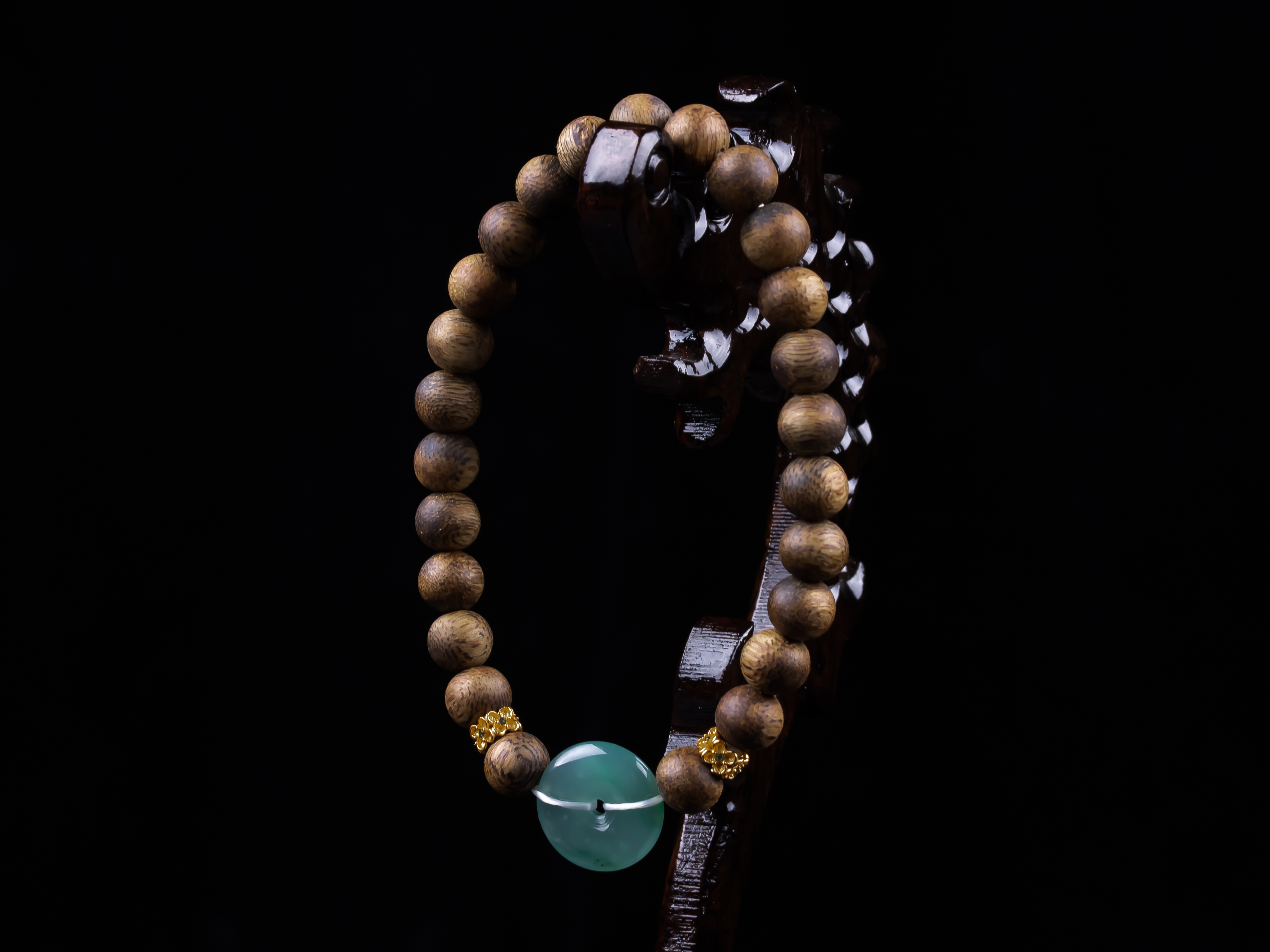 XY0203沉香+冰种翡翠平安扣手串,天然沉香约7.2mm,原色原味,香味自然清甜,冰蓝底的翡翠平安扣约14*3mm,种水细润,两颗925银花珠,搭配简约、大方,上手气质满满。