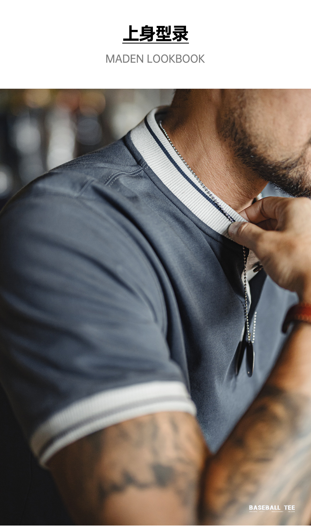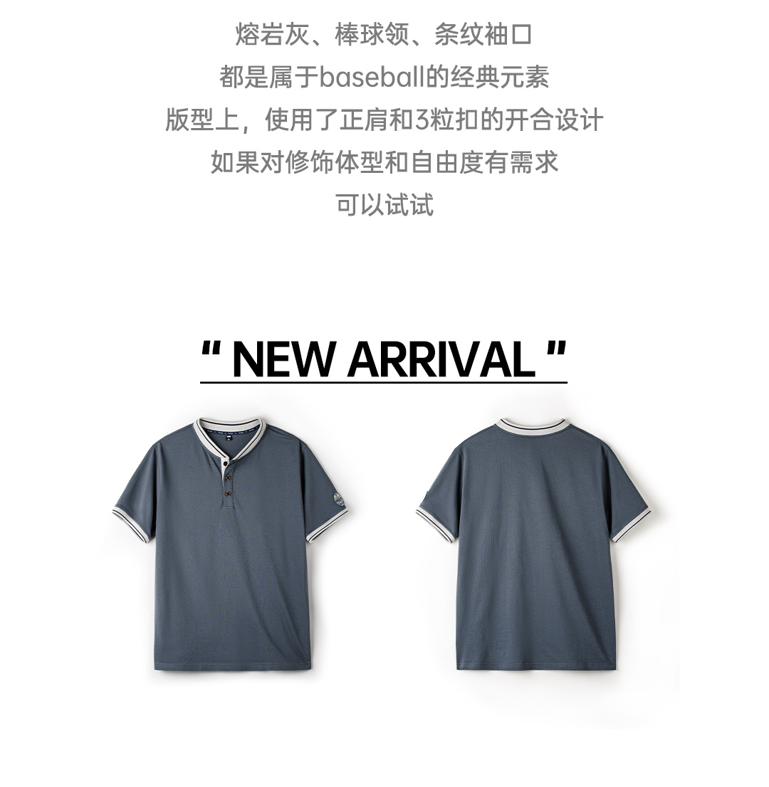 马登工装美式复古棒球领亨利衫T恤纯棉正肩重磅灰蓝撞色短袖男夏