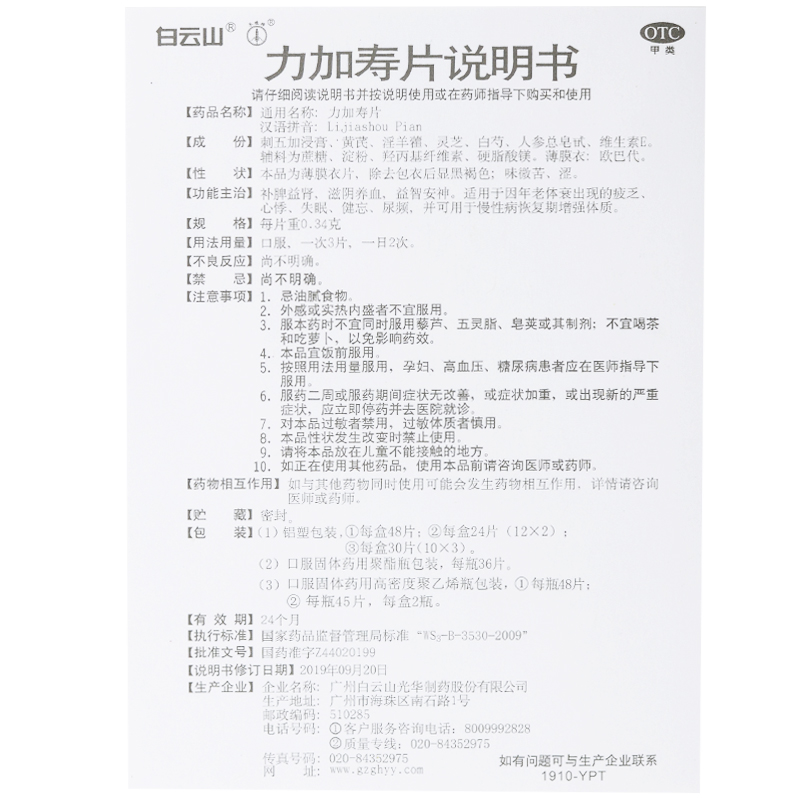 白云山 力加寿片 0.34g*90片补脾益肾安神慢*恢复增强体质