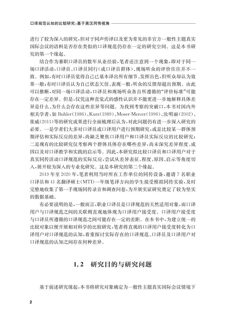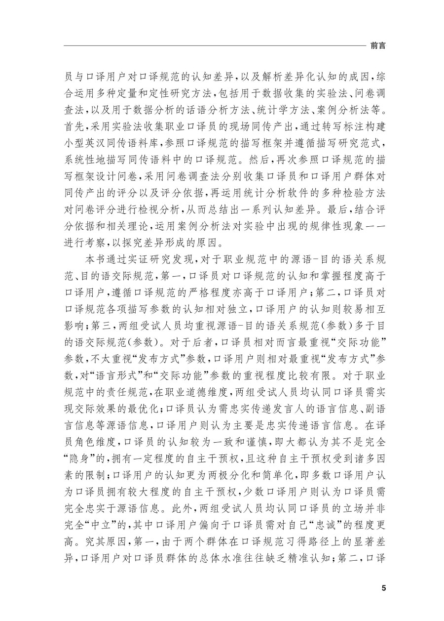王珊,女,复旦大学外文学院翻译系教师。本书聚焦对现场同传活动口译规范的认识,在较为系统地描写现场同传活动口译规范的同时,也较为深入地比较口译员和口译用户在认识口译规范方面的差异,并解析差异的成因。具体而言,在借鉴安德鲁切斯特曼(AndrewChesterman)翻译规范体系中口译规范的描写角度的基础上得出口译规范的描写框架。采用模拟实验法收集口译员的同传产出,并运用文本分析法对口译规范进行详实描写;采用问卷调查法分别获取口译员和口译用户对同传产出的评分及评分依据;采用统计学方法分析两个群体在评分及评分依据方面的差异;采用案例分析法、并结合相关理论分析差异的成因。本书适合对口译规范领域有兴趣的翻译(口译)专业学生,教师和从业者。