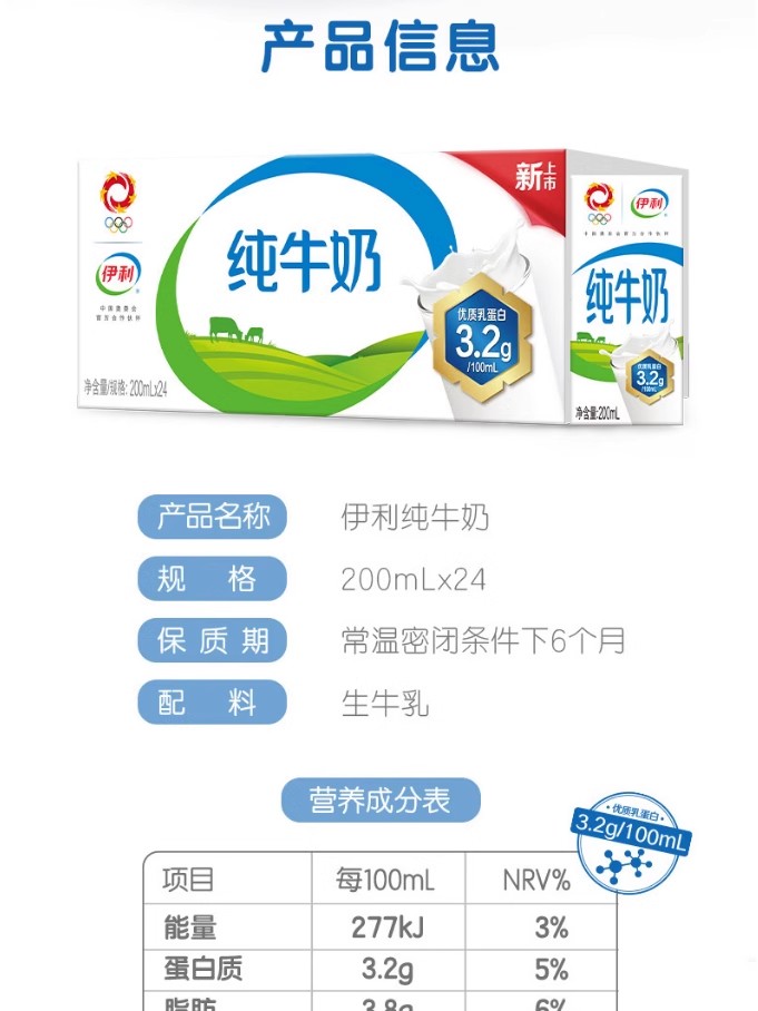 【2提十堰主城区包邮】优质乳蛋白3.2g伊利纯牛奶 200ml*24瓶/提