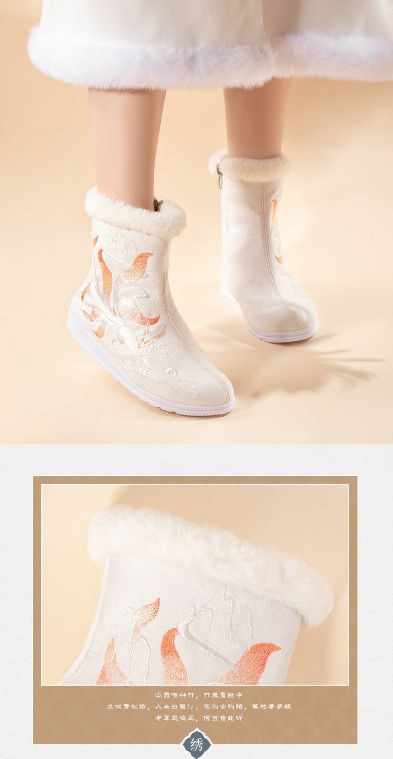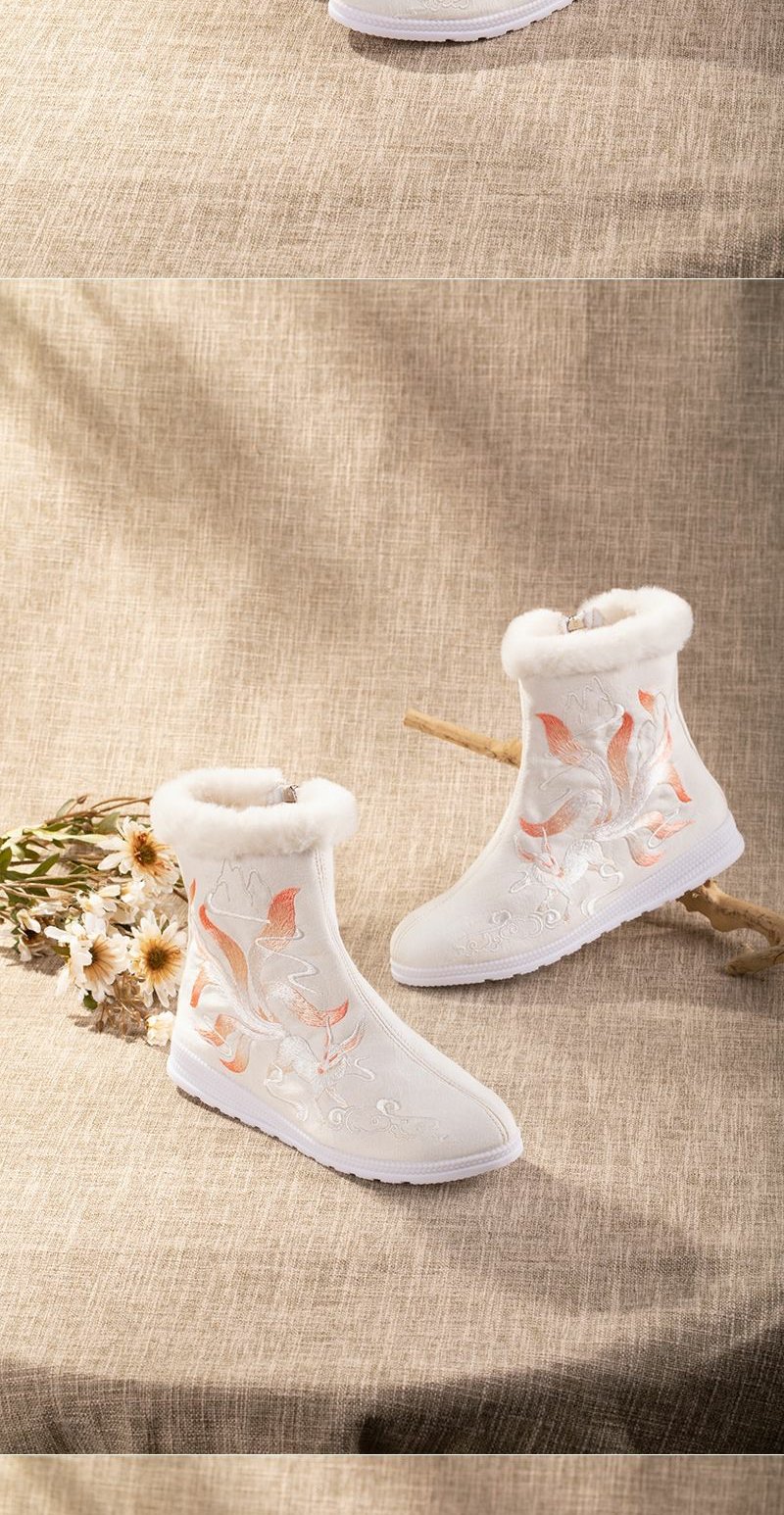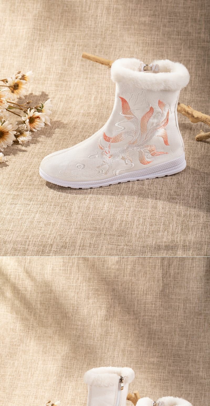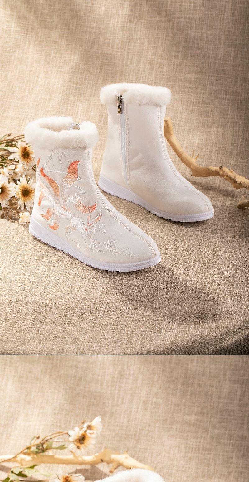 白狐刺绣汉服靴子女百搭汉服鞋冬天保暖加绒古风靴中筒皂靴绣花鞋