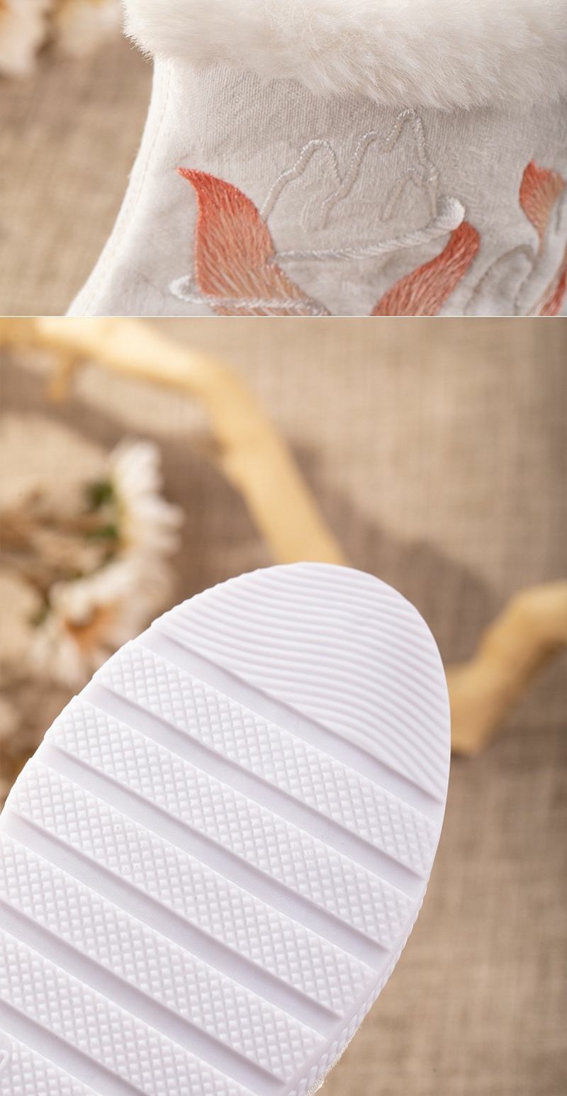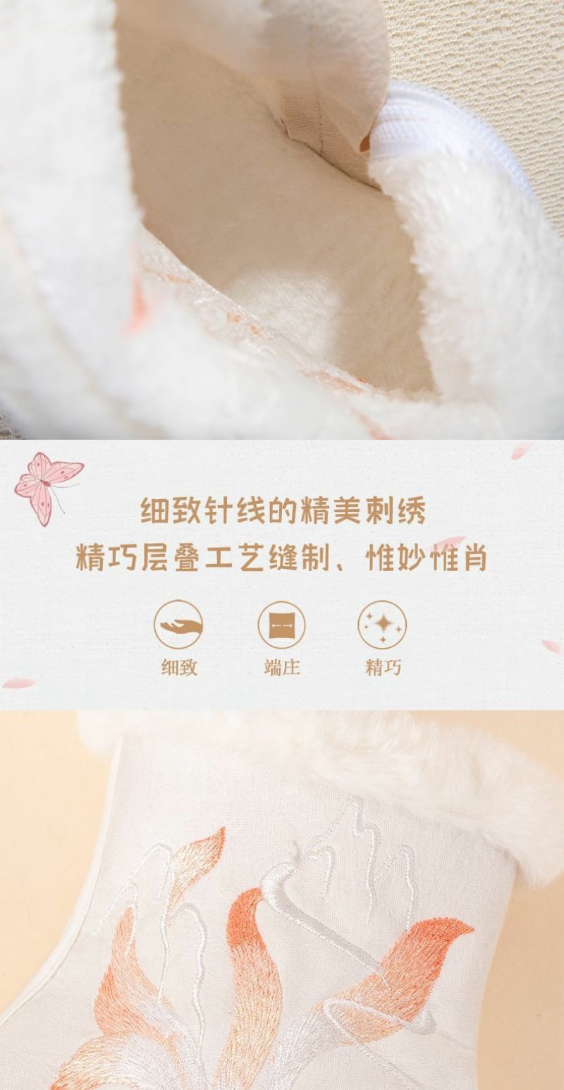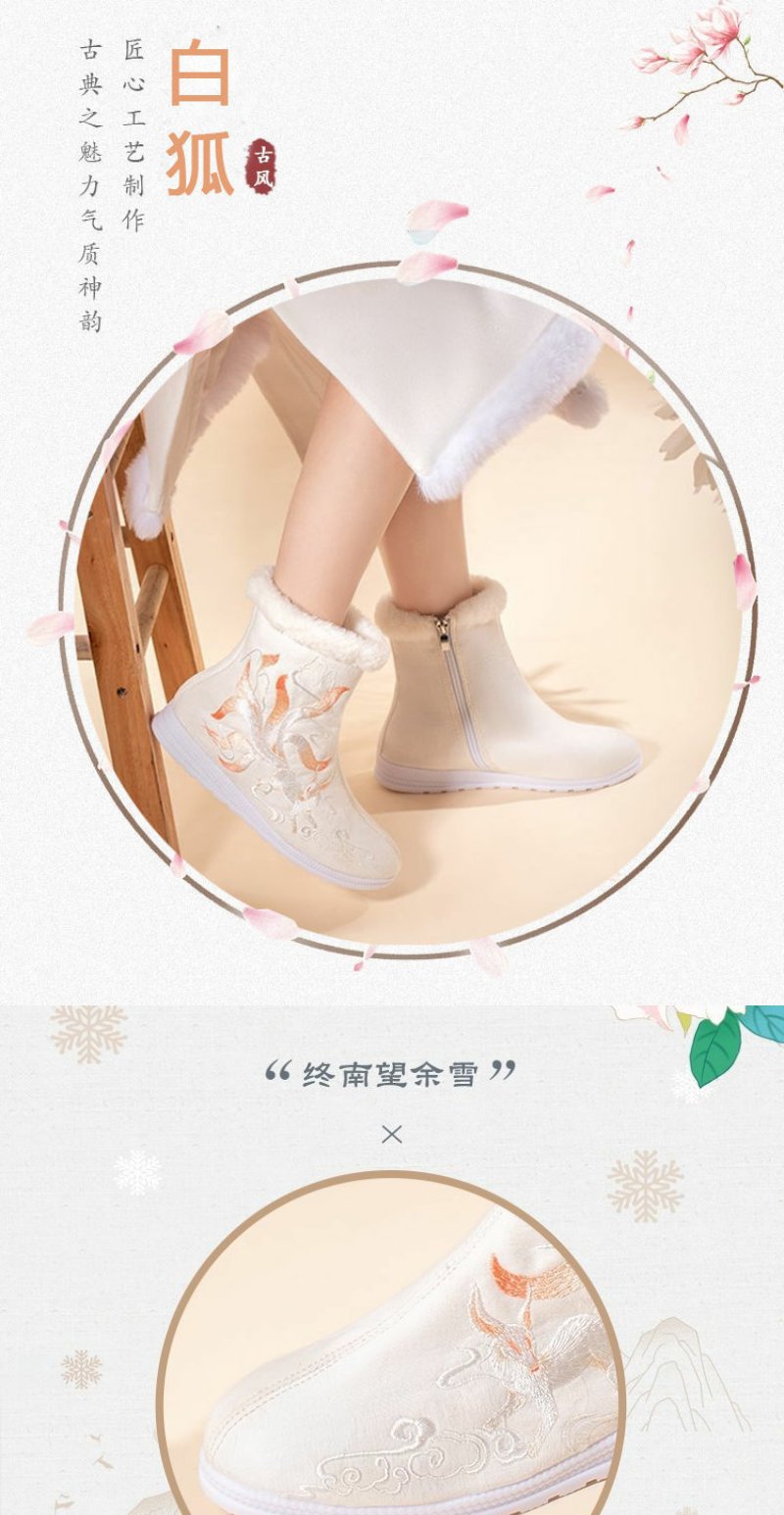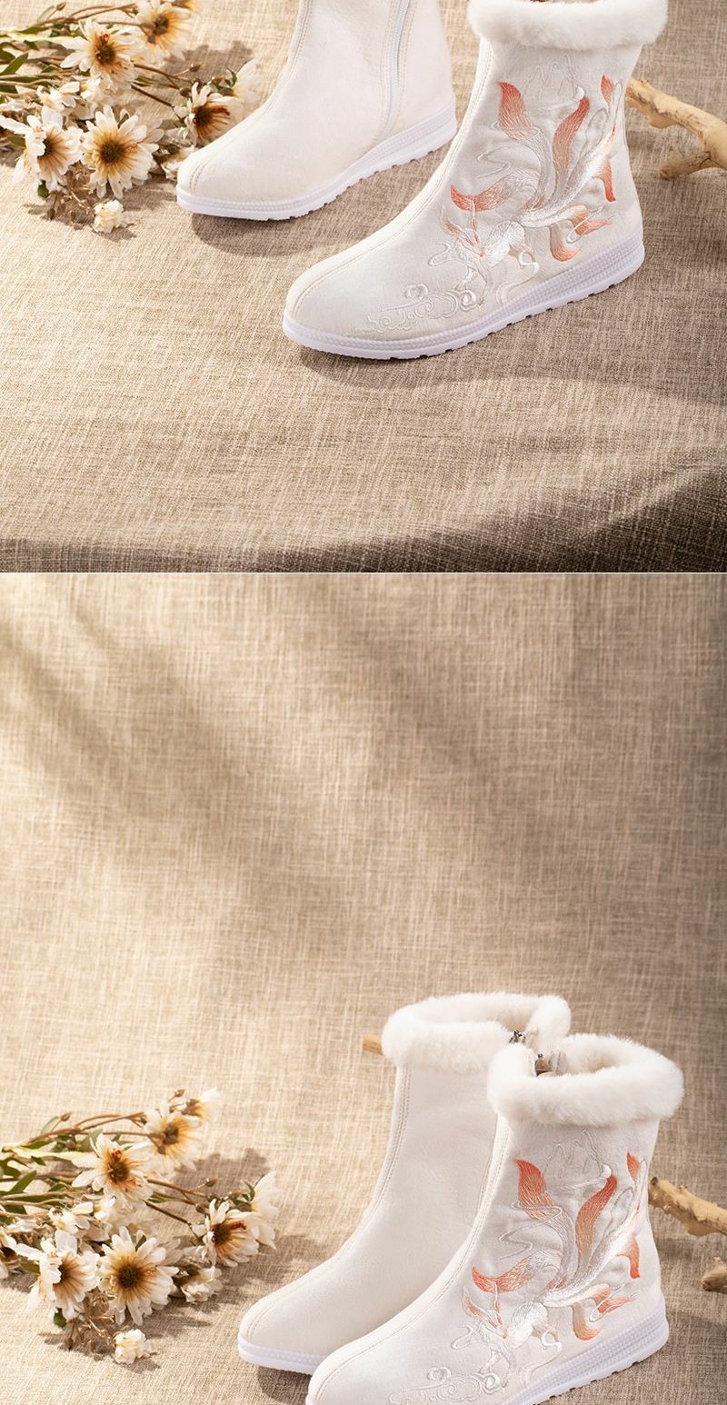 白狐刺绣汉服靴子女百搭汉服鞋冬天保暖加绒古风靴中筒皂靴绣花鞋