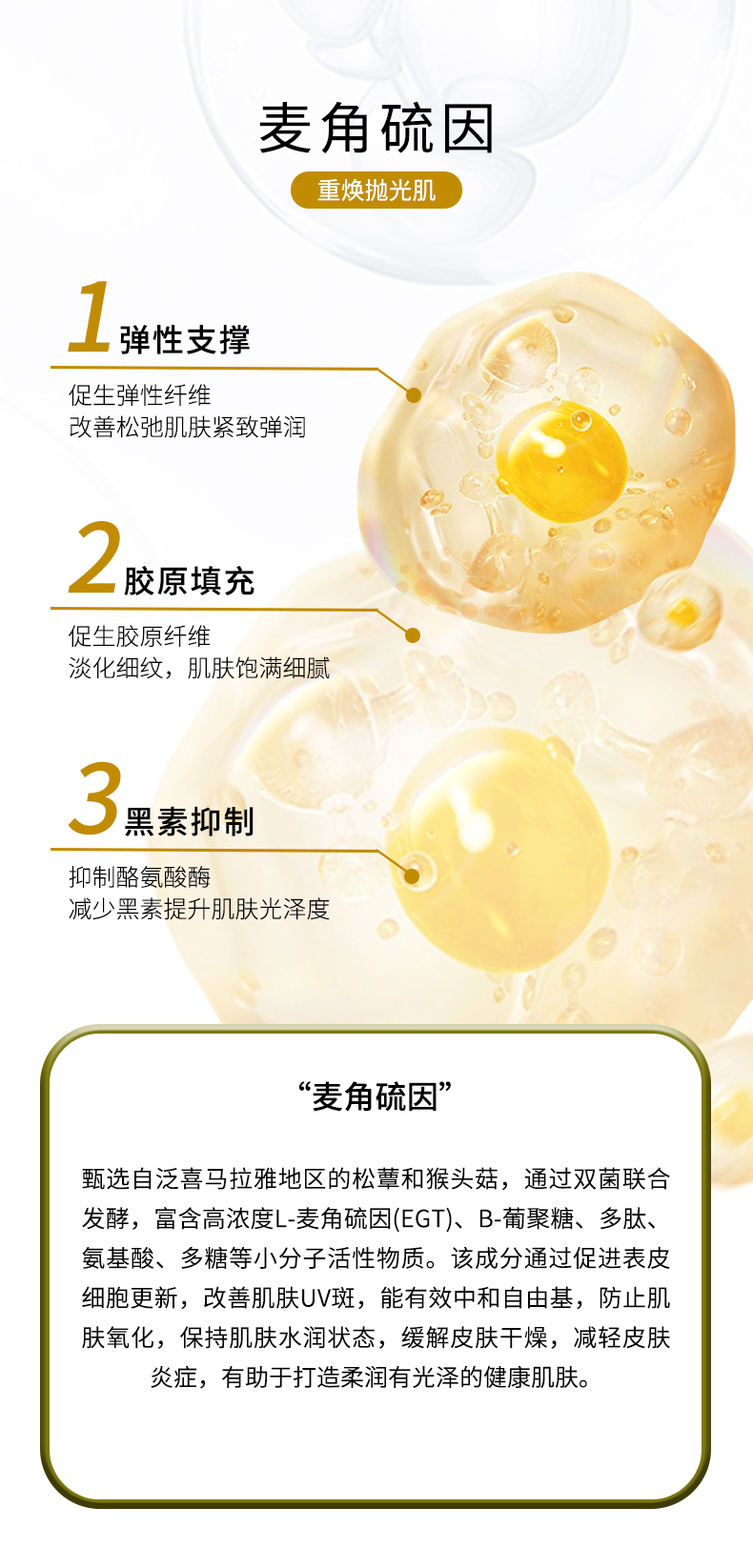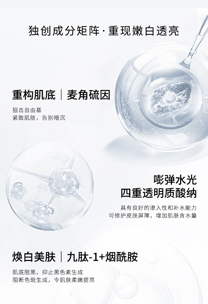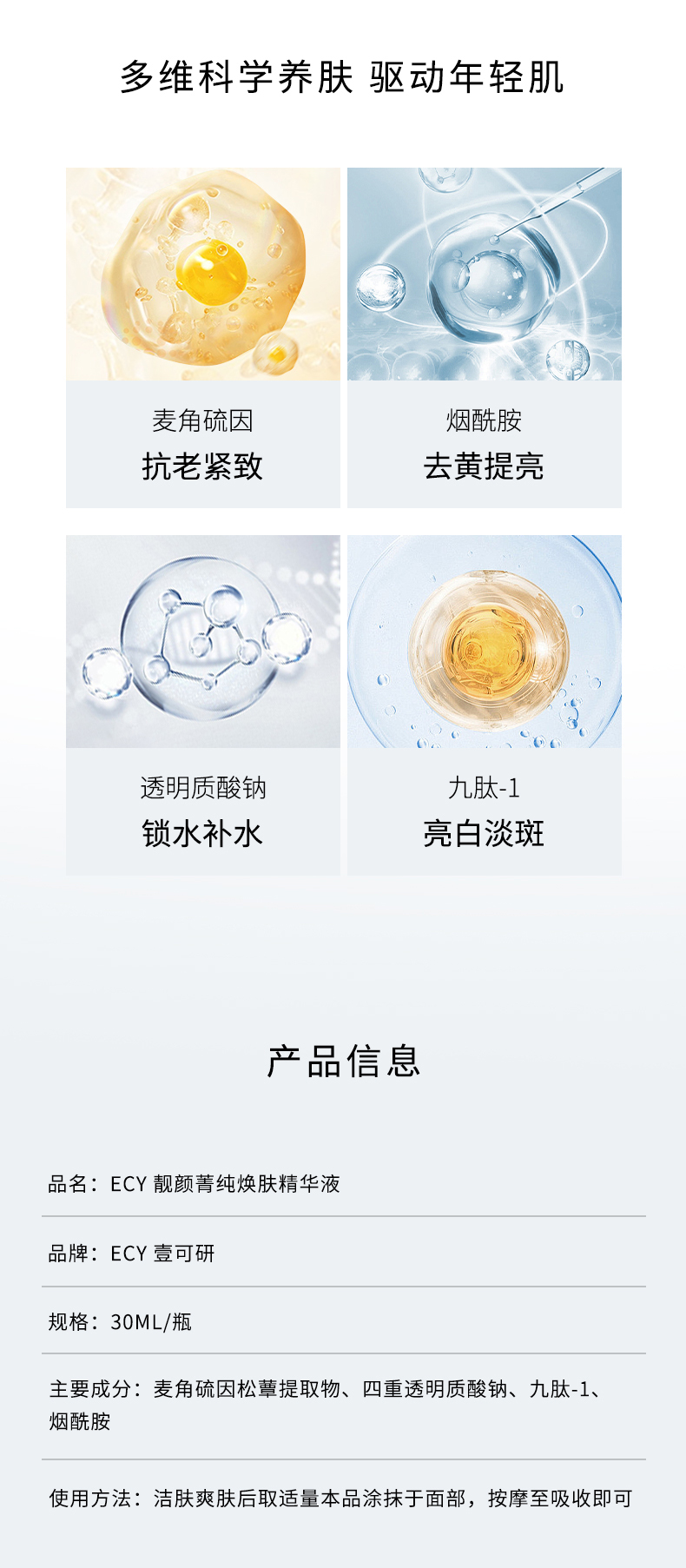 EC的W4,也就是靓颜菁纯焕肤精华液,是特意给懒得用三剑客的,一支搞定,早晚都可用,超方便的!而且集合了四重透明质酸钠、麦角硫因松蕈提取物等优秀成分,给脸子更高效的养护!其中,四重透明质酸钠黄金配比,精准作用于不同层次,让肌肤恢复水嫩与弹性。同时还加入了来自泛喜马拉雅地区的松蕈和猴头菇,通过双菌联合发酵技术,提取出富含高浓度L-麦角硫因(EGT)、β-葡聚糖、多肽、氨基酸、多糖等小分子活性物质,能够温和地让表皮细胞焕新的同时,淡淡UV斑。此外,精华液中的九肽-1成分更是能够有效阻止酪氨酸酶被激活,从源头上减少黑色素的生成。也有烟酰胺哦,可以通过阻断黑色素向肌肤表层的转移,进一步让肤色均匀的同时更加闪闪发光!