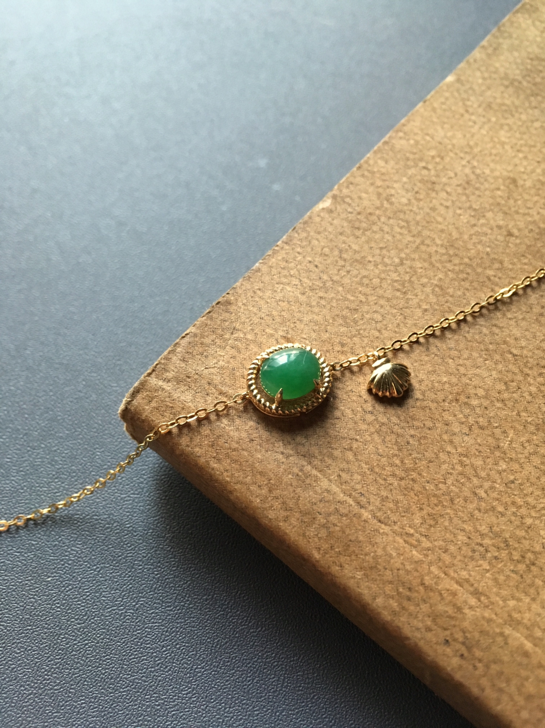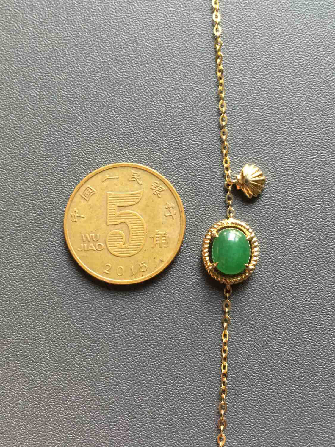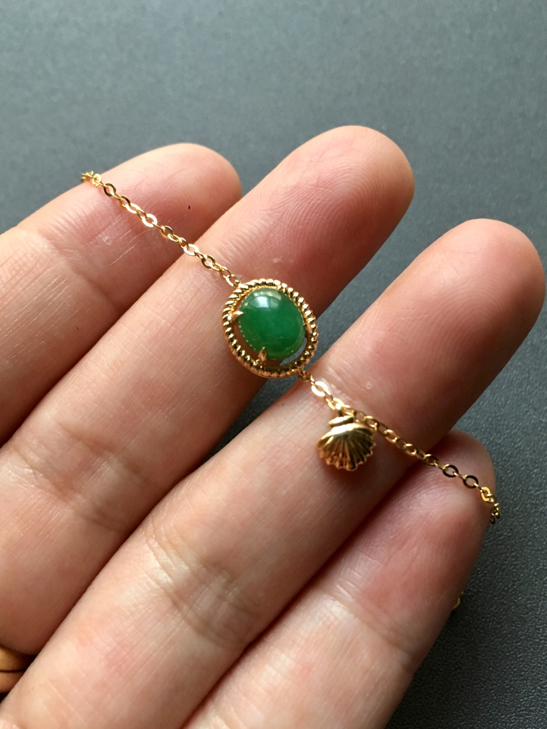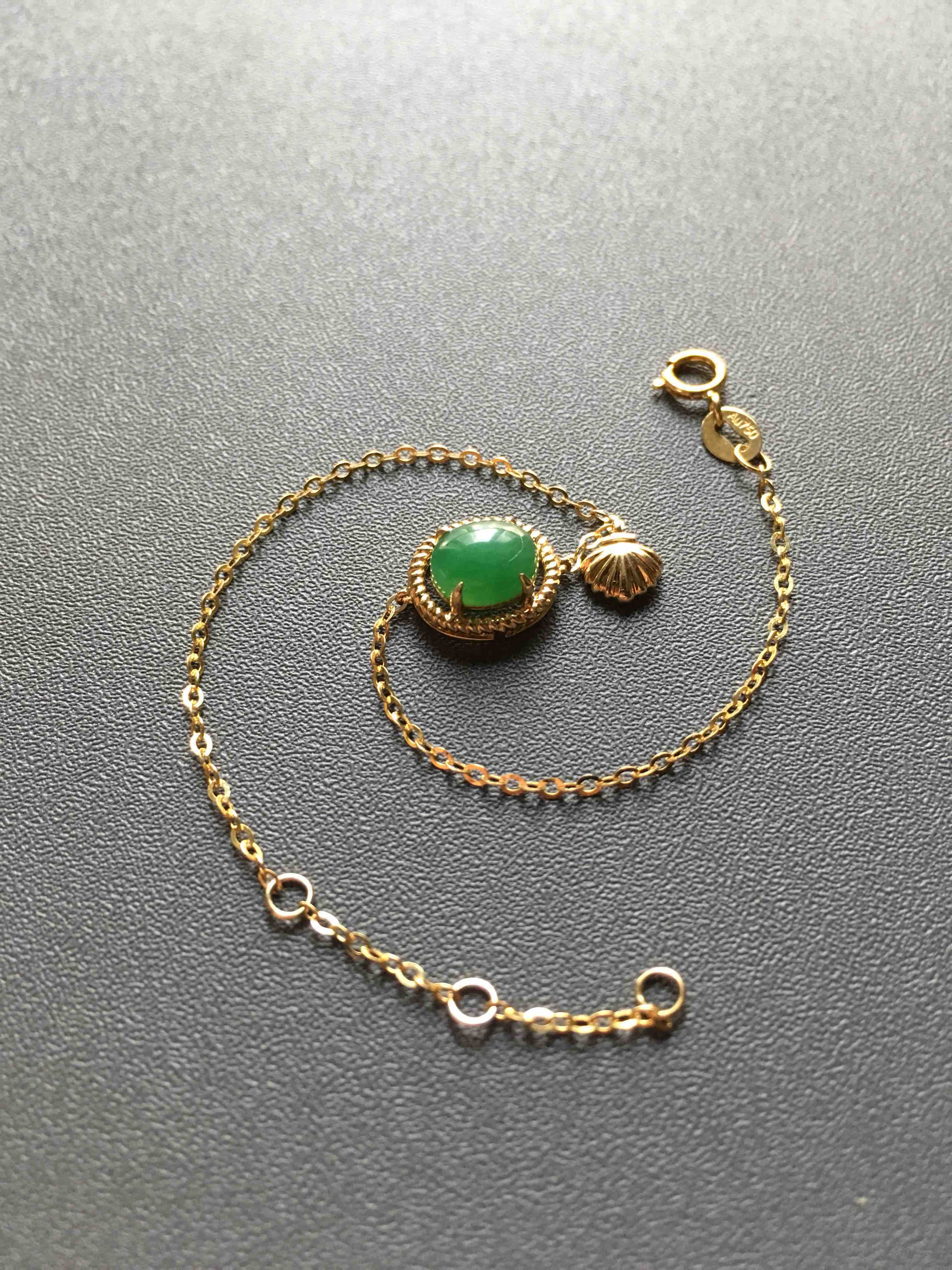 冰种阳绿翡翠手链,蛋面7.5×6.3×2.8mm,翡翠禄来原创设计,灵感来自于浪漫的大海,融入了大家喜欢的贝壳元素,时尚活泼,蛋面种水晶莹剔透,阳绿艳丽,18k黄金镶嵌,链子长14.5cm加3cm可调延长链,只要小四价位即可拥有,强烈推荐