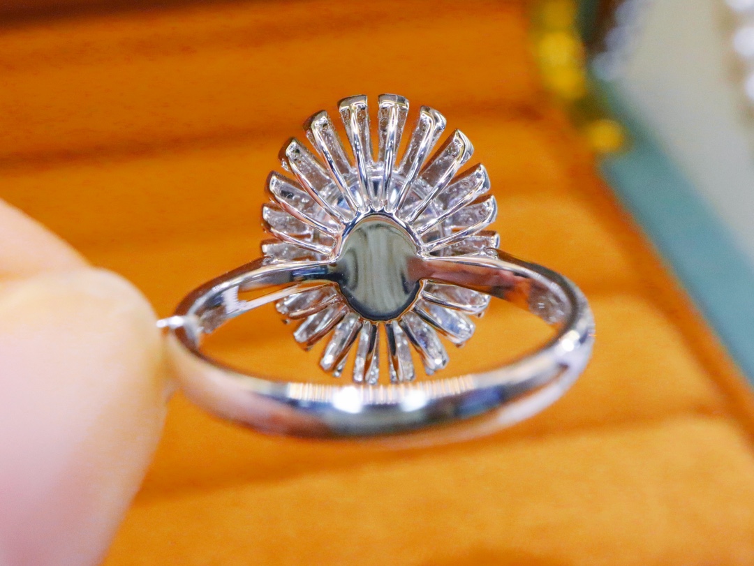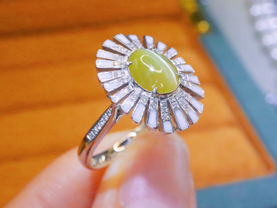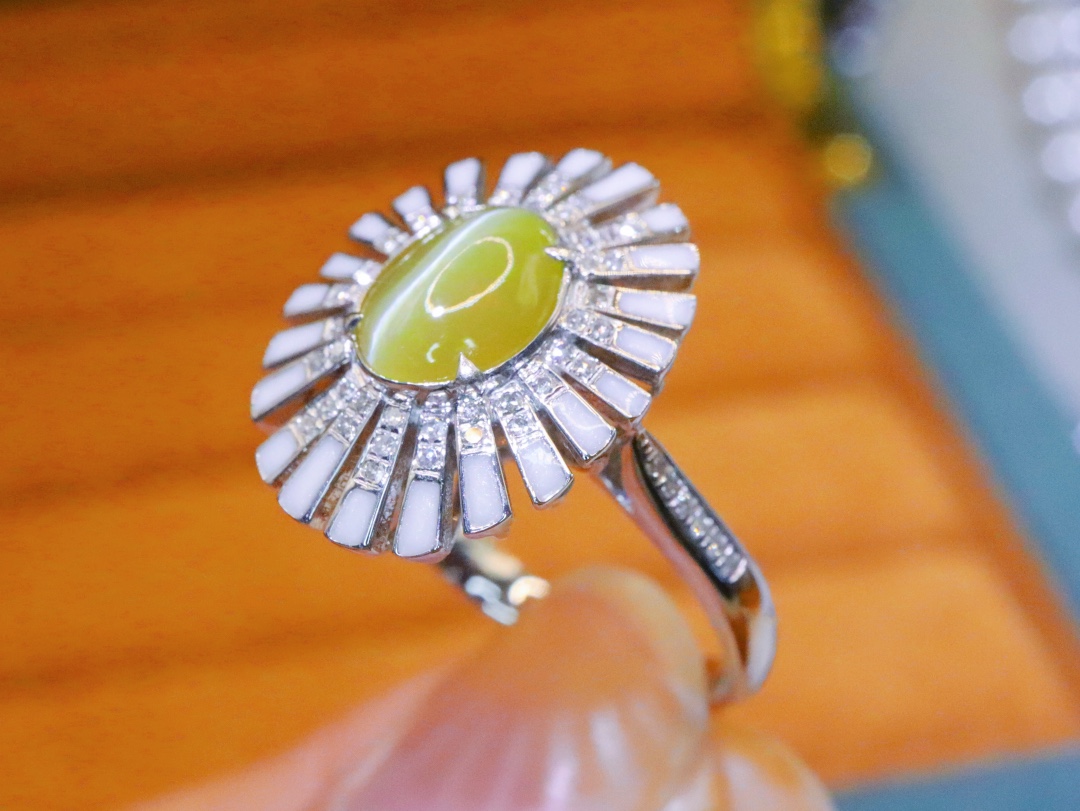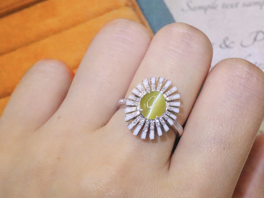 523010 无烧金绿猫眼珐琅戒指 石重:1.68ct;总重:5.10g;钻石: 0.165ct/55颗;圈口:15号 金绿色,18K白金 真金真钻石 超值价:10280