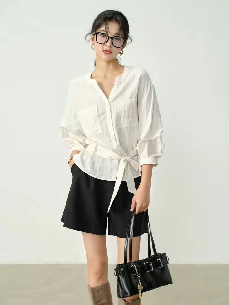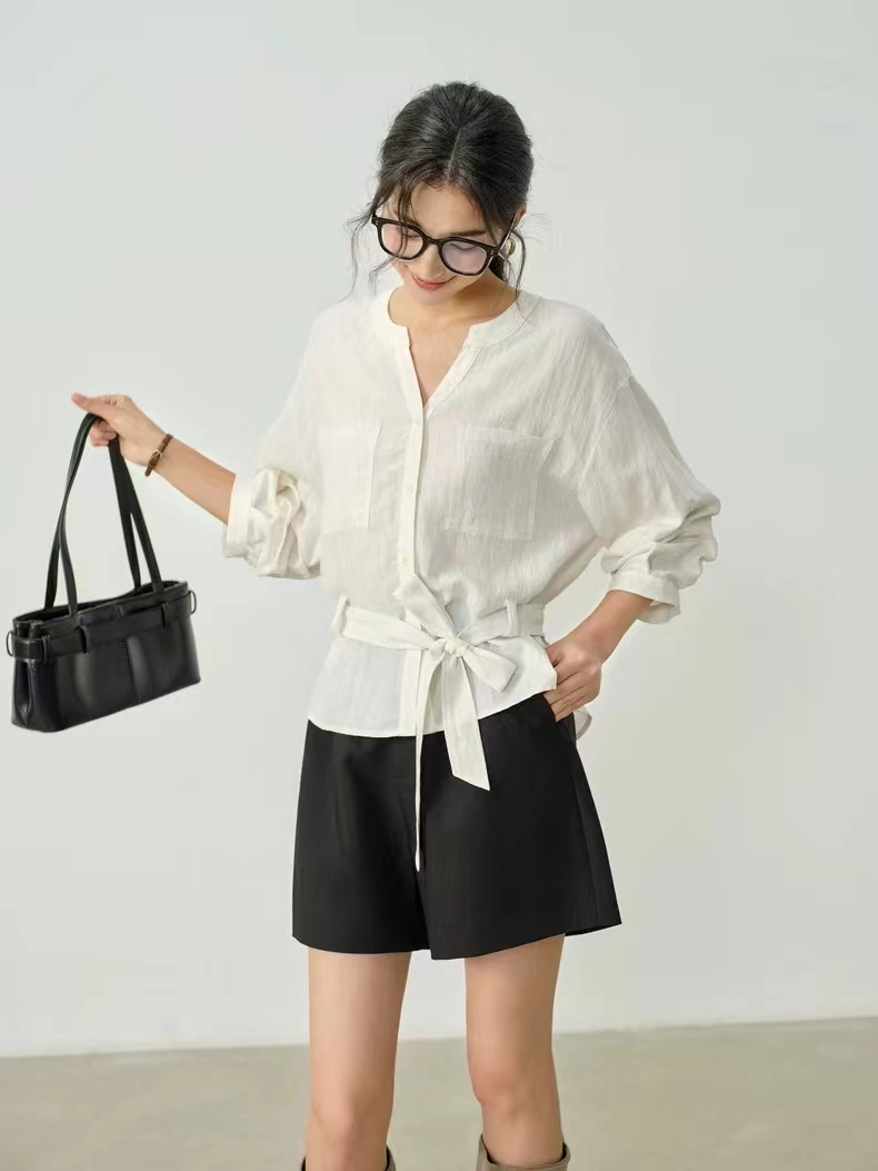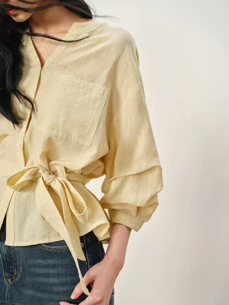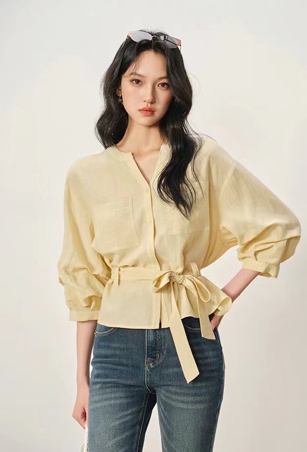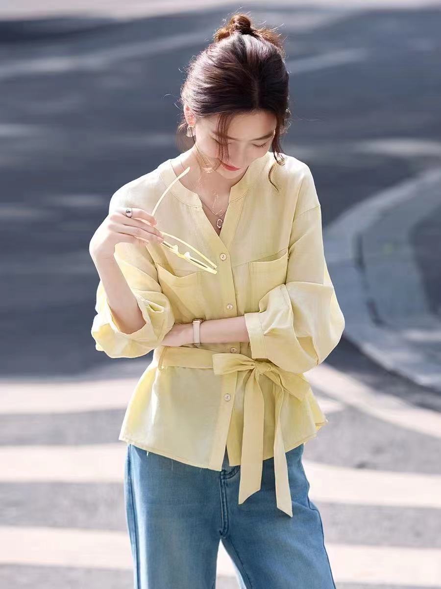 显白柠檬黄~2026夏季法式收腰新品亚麻显瘦中袖V领系带衬衫,温柔感七分灯笼袖衬衫!圆V领设计,圆型衔接V领设计,露出纤细锁骨,修饰颈部线条,既不会过于暴露,又能巧妙拉长脖颈比例。浅色单排扣点缀门襟,扣上是温柔氛围感,解开穿成开衫更随性。七分袖的长度刚好盖过手肘,袖管做了微宽松处理,在腕部自然收拢,既能藏住手臂拜拜肉,又能避免拖沓感,抬手间带着随性的褶皱肌理,透气又清爽,非常适合春夏交替的季节。胸前对称设计了两个方形贴袋,线条利落挺括,不仅增加了实用性,也让衬衫更具结构感,避免了纯色面料的单调;醉点睛的是同面料的宽版腰带,可自由调节松紧,在腰侧系成一个温柔的蝴蝶结,瞬间收拢腰线,优化身材比例,把宽松的衣身穿出“上松下紧”的黄金比例,既遮肉显瘦,又能强调女性的柔美曲线,解开腰带时又是一件随性的oversize衬衫,一衣两穿,实用性拉满。