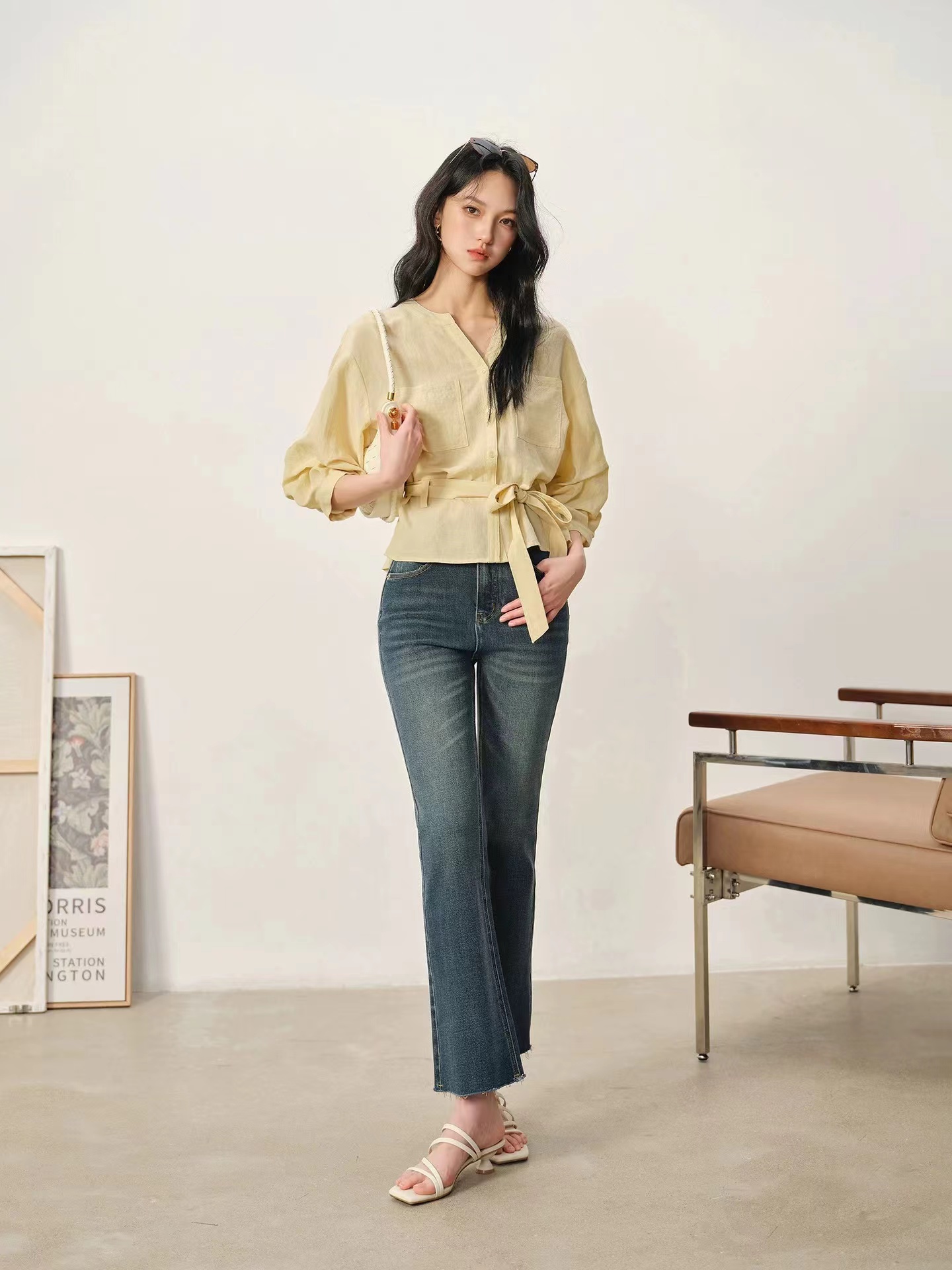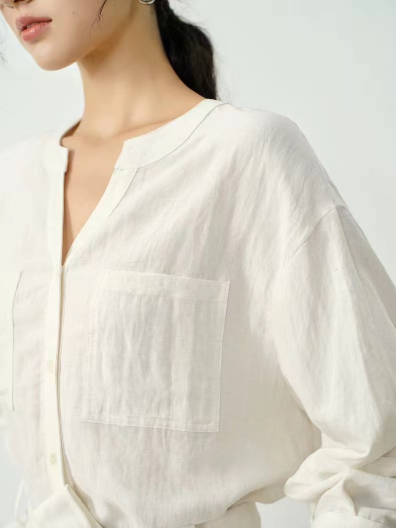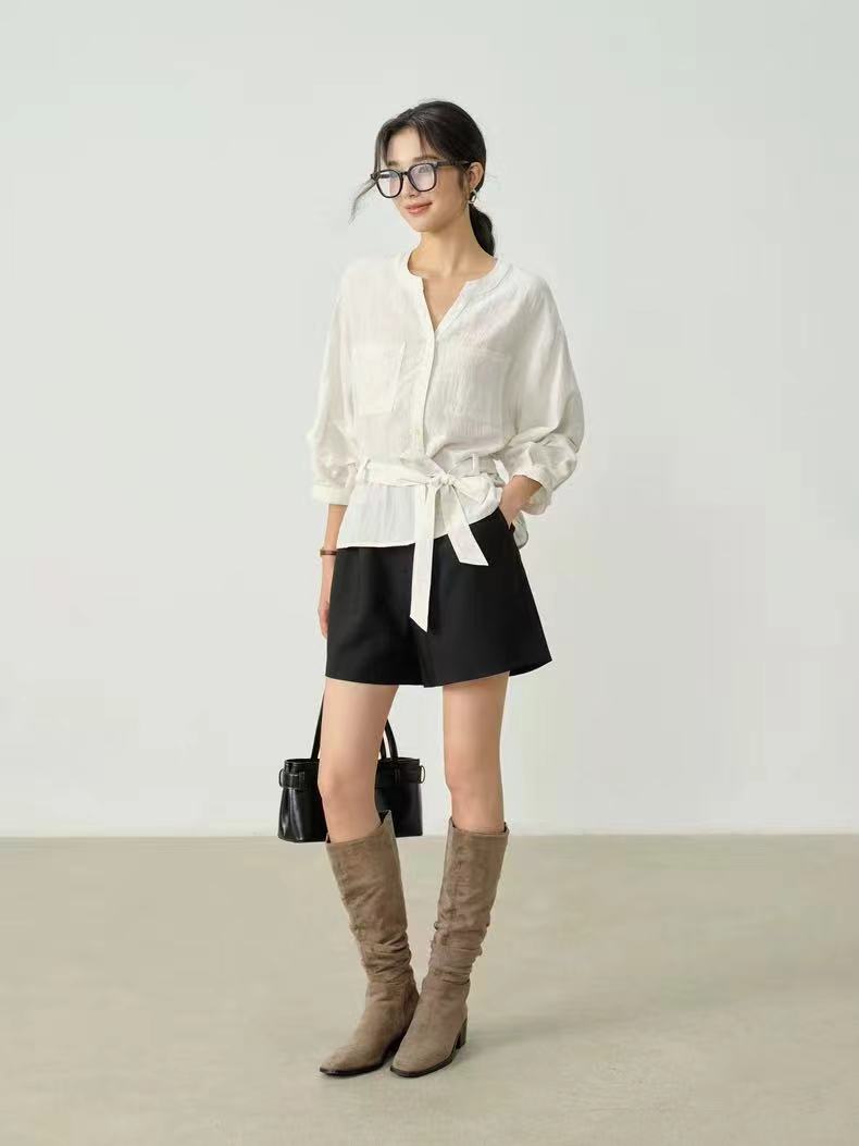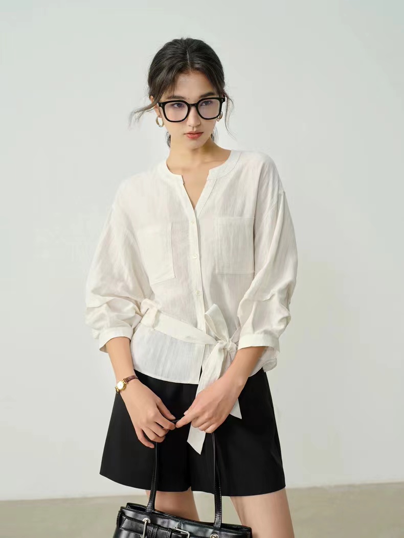 显白柠檬黄~2026夏季法式收腰新品亚麻显瘦中袖V领系带衬衫,温柔感七分灯笼袖衬衫!圆V领设计,圆型衔接V领设计,露出纤细锁骨,修饰颈部线条,既不会过于暴露,又能巧妙拉长脖颈比例。浅色单排扣点缀门襟,扣上是温柔氛围感,解开穿成开衫更随性。七分袖的长度刚好盖过手肘,袖管做了微宽松处理,在腕部自然收拢,既能藏住手臂拜拜肉,又能避免拖沓感,抬手间带着随性的褶皱肌理,透气又清爽,非常适合春夏交替的季节。胸前对称设计了两个方形贴袋,线条利落挺括,不仅增加了实用性,也让衬衫更具结构感,避免了纯色面料的单调;醉点睛的是同面料的宽版腰带,可自由调节松紧,在腰侧系成一个温柔的蝴蝶结,瞬间收拢腰线,优化身材比例,把宽松的衣身穿出“上松下紧”的黄金比例,既遮肉显瘦,又能强调女性的柔美曲线,解开腰带时又是一件随性的oversize衬衫,一衣两穿,实用性拉满。