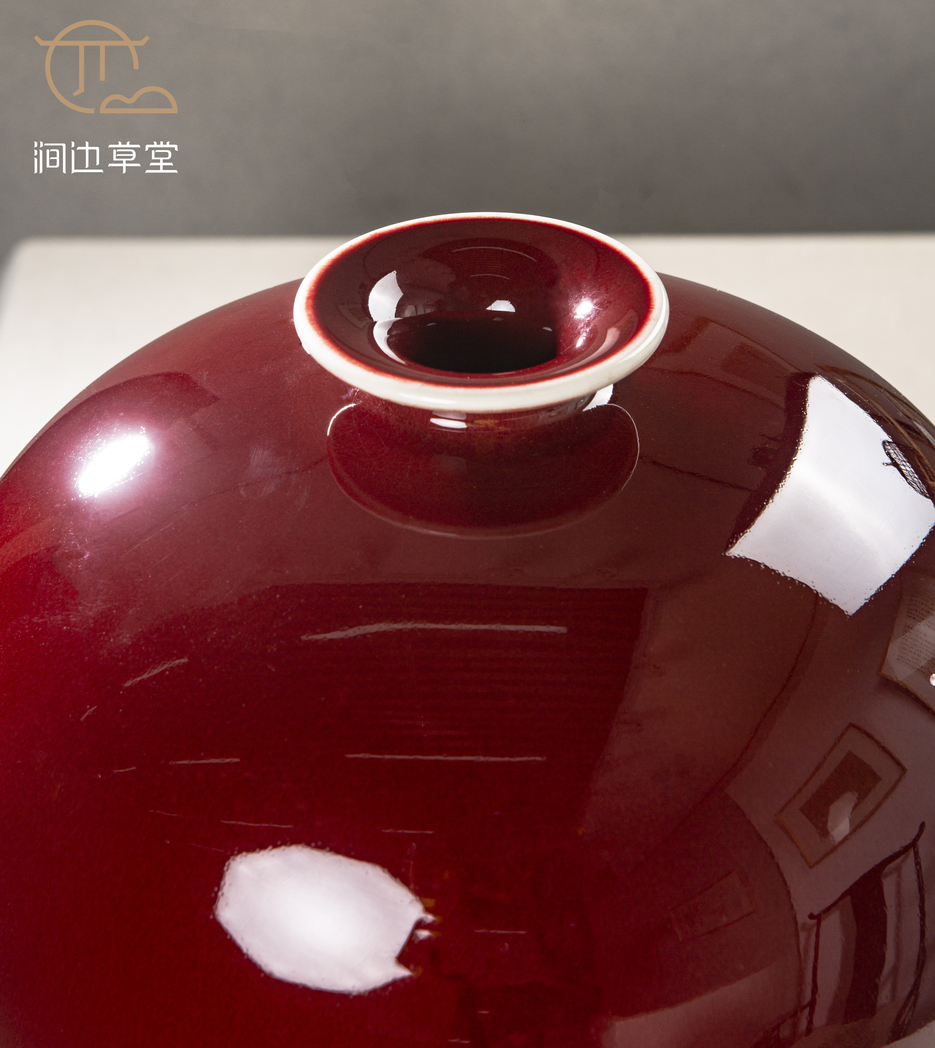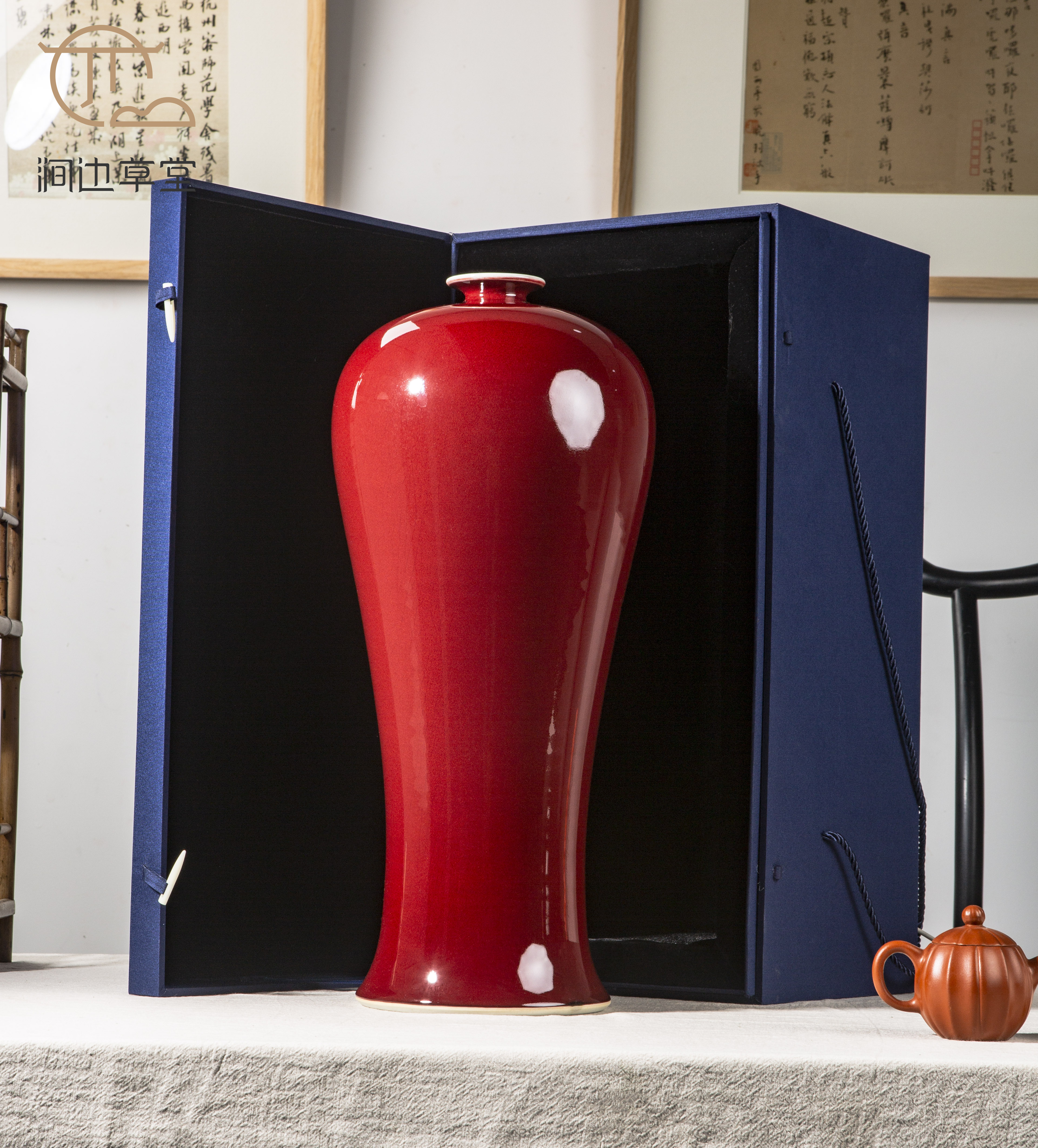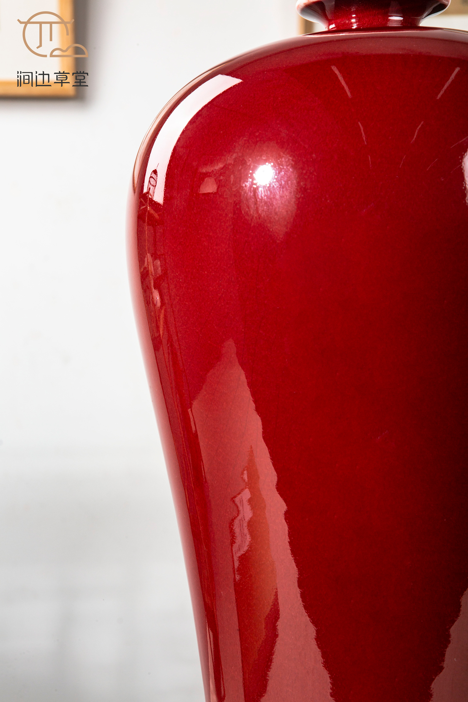 纯手工拉坯大尺寸祭红梅瓶,器型高雅端庄,釉色纯正,配有高档锦盒,祭红色在单色釉瓷器中是很难烧成的颜色,此梅瓶十分难得。