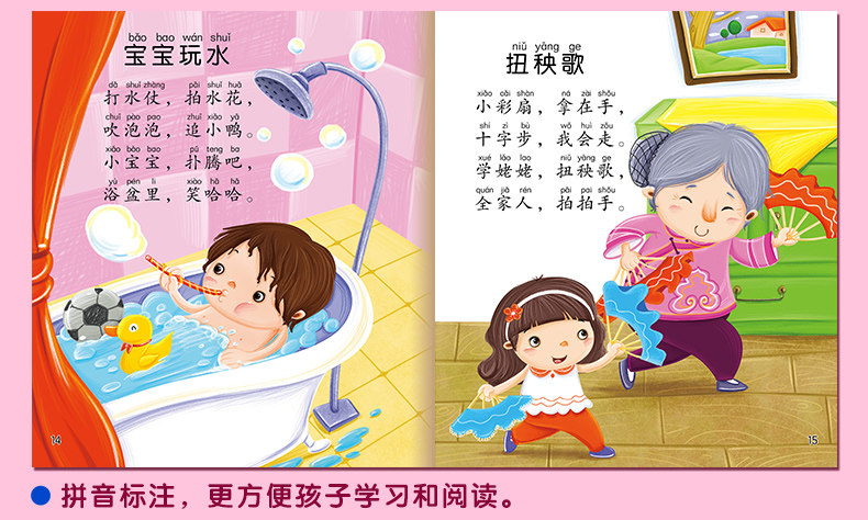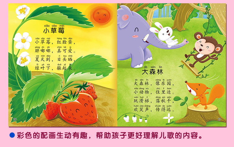 这套书既能作为简单的认读书学习,又可以阅读儿歌,帮助宝宝学话,同时,它还是宝宝的识字书。