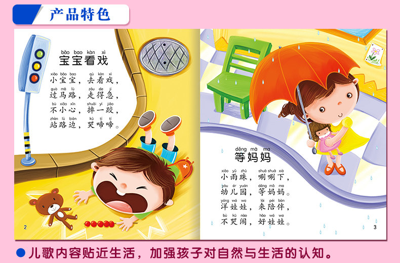 它的特色在于贴近生活,充满童趣,便于学习;三字格式,琅琅上口,适合朗诵;大字注音,图画鲜艳,适合认读。