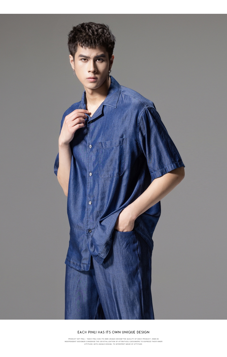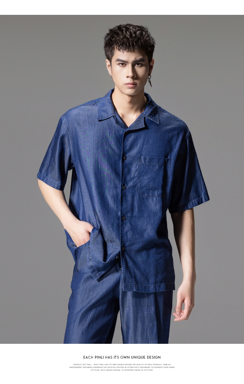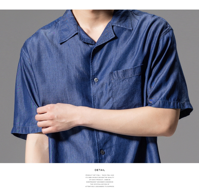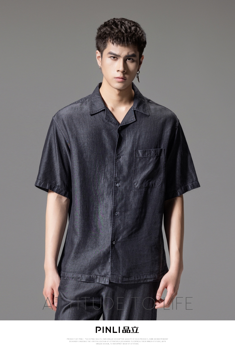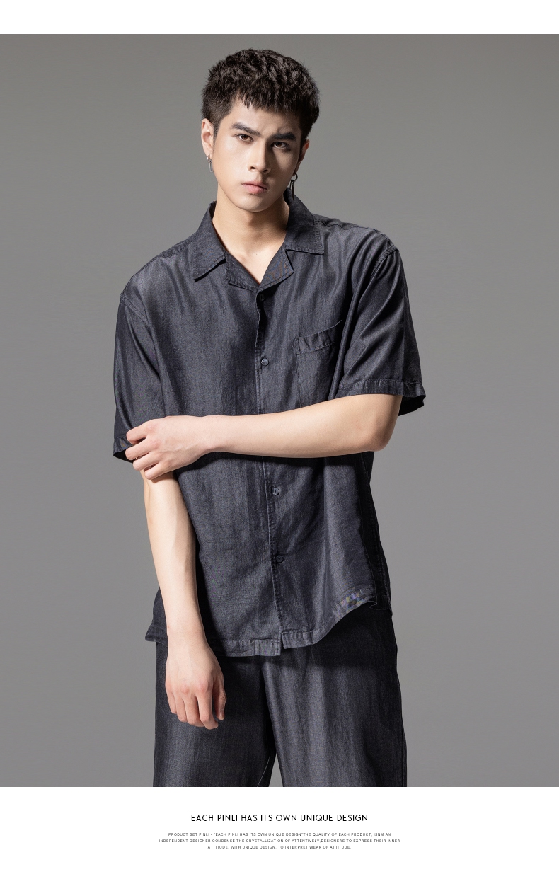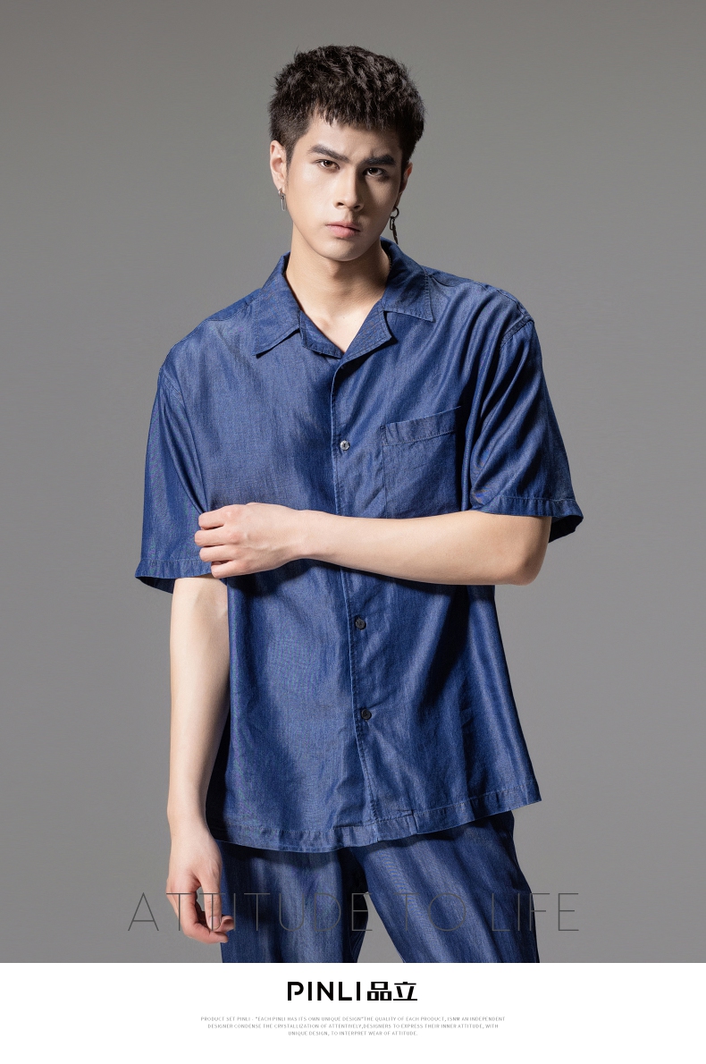 PINLI品立夏季新款宽松翻领牛仔短袖衬衫雅痞男士休闲衬衣潮GD242313308