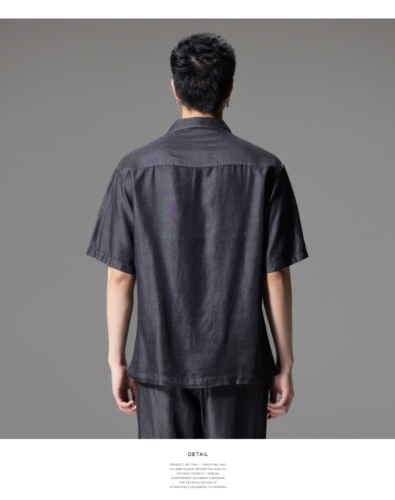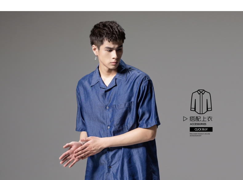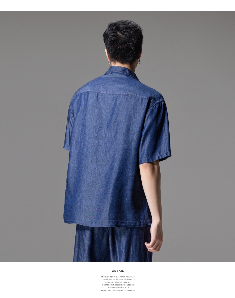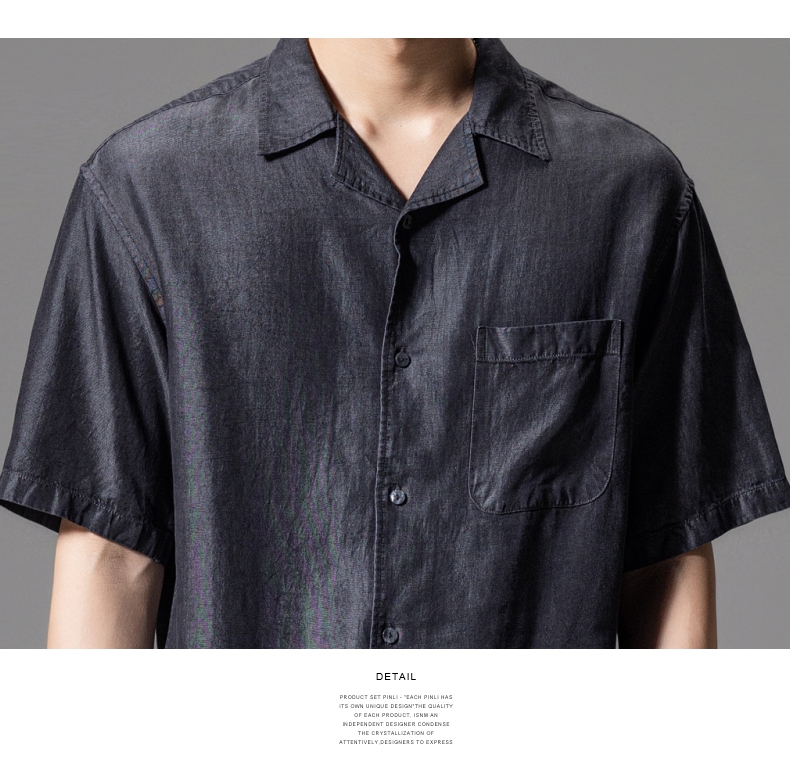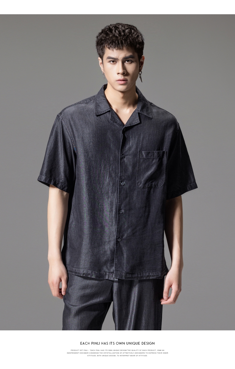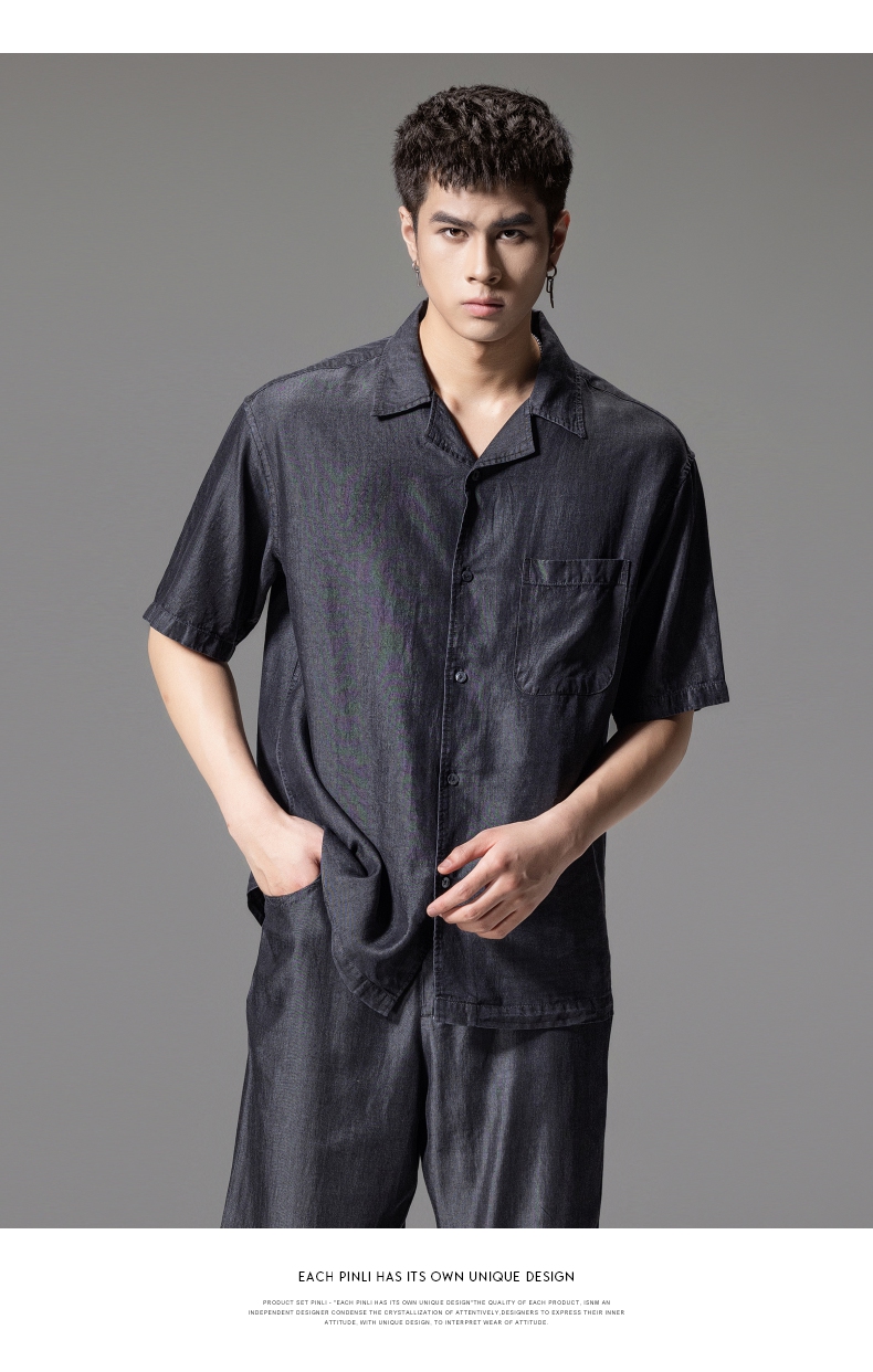 PINLI品立夏季新款宽松翻领牛仔短袖衬衫雅痞男士休闲衬衣潮GD242313308