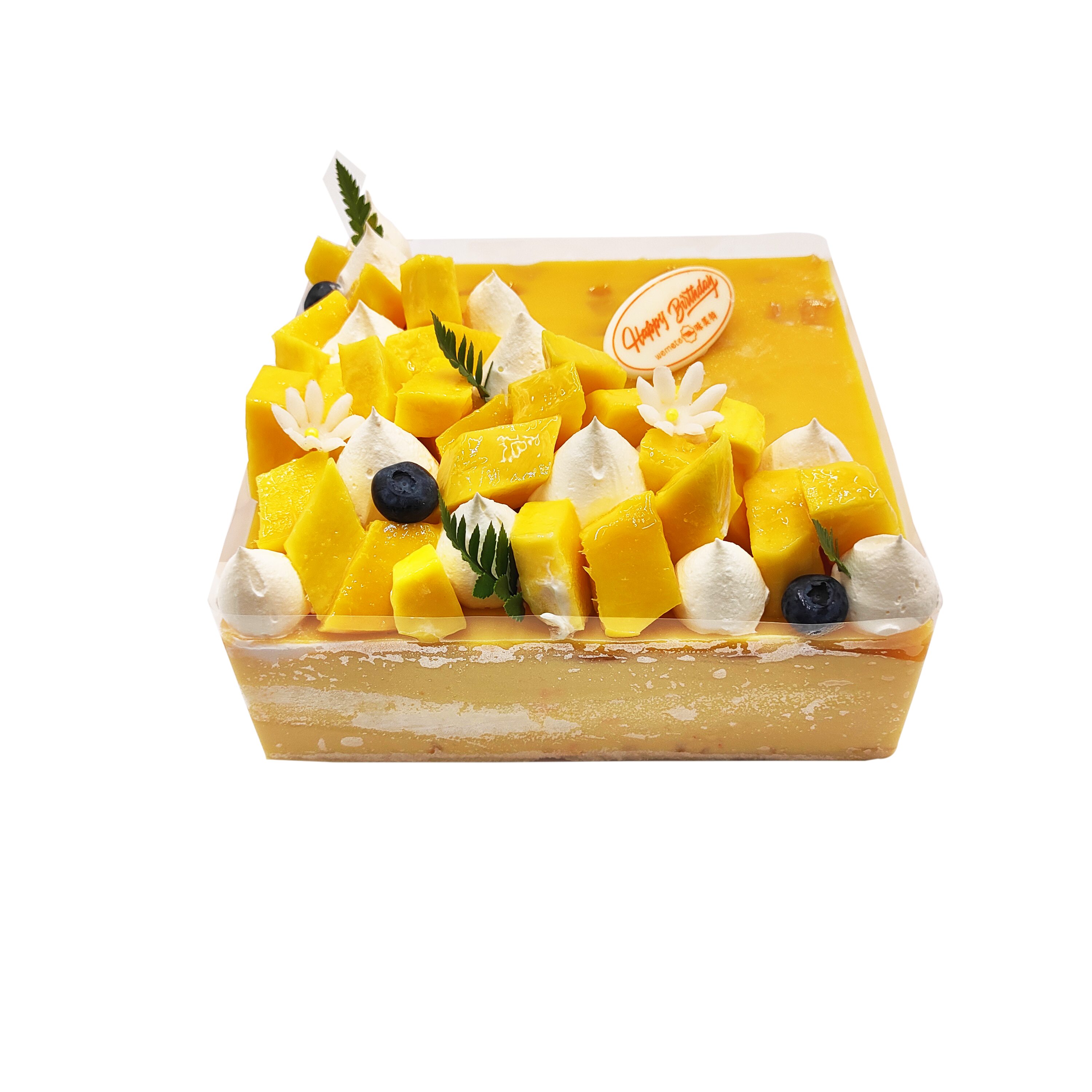 味美特“芒果慕斯”慕斯水果蛋糕-拍摄样板是8英寸图片-主要原材料有冷冻芒果果泥+动物奶油+芒果库里+新鲜芒果