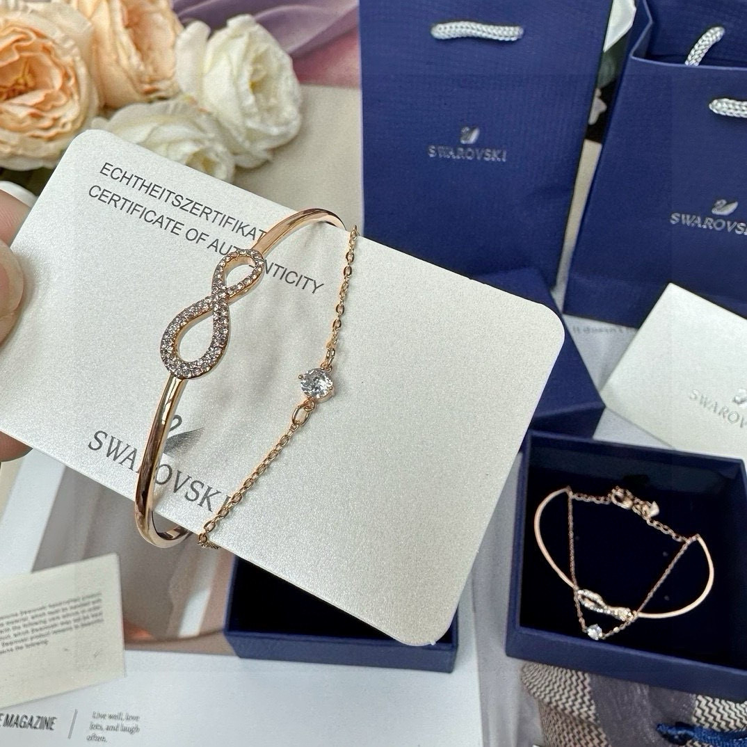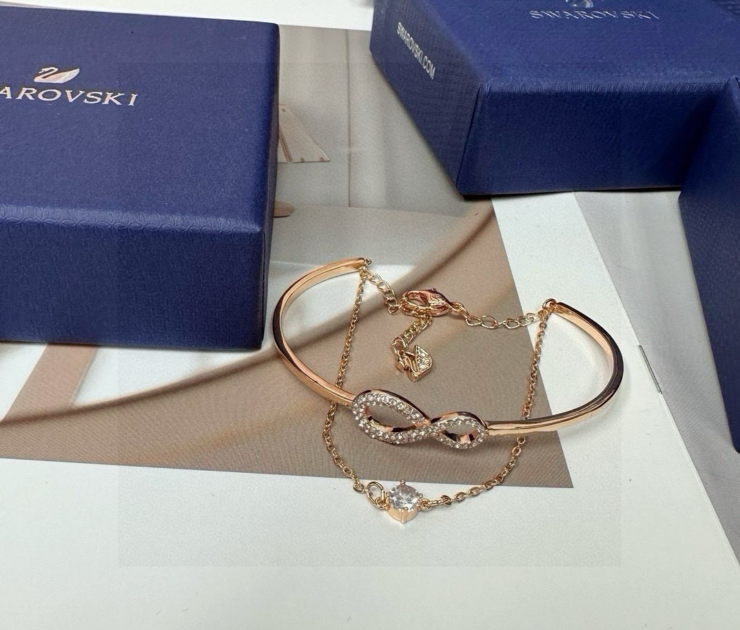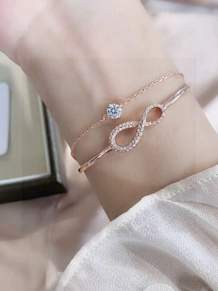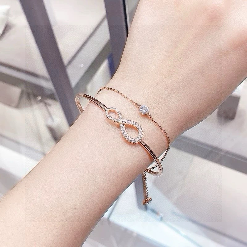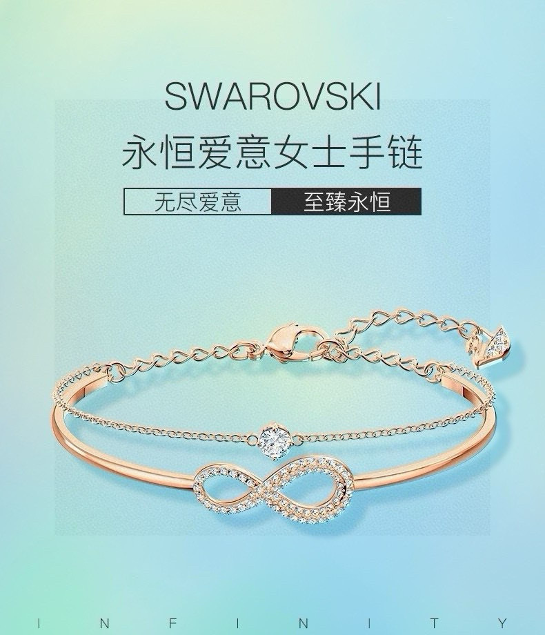 施华洛世奇永恒爱意8字手镯礼物 施华洛世奇王一博同款手镯永恒爱意 层搭设计手镯 饰有「无尽」符号的装饰,寓意爱的延续与成长,承托了对唯美爱情的期许;层搭设计,增添腕间浪漫摩登气息。配专柜全套包装 佩戴注意事项说明:施华洛世奇材质为合金镀铑(一种稀有贵金属),洗澡需要摘下,出汗及时擦干等