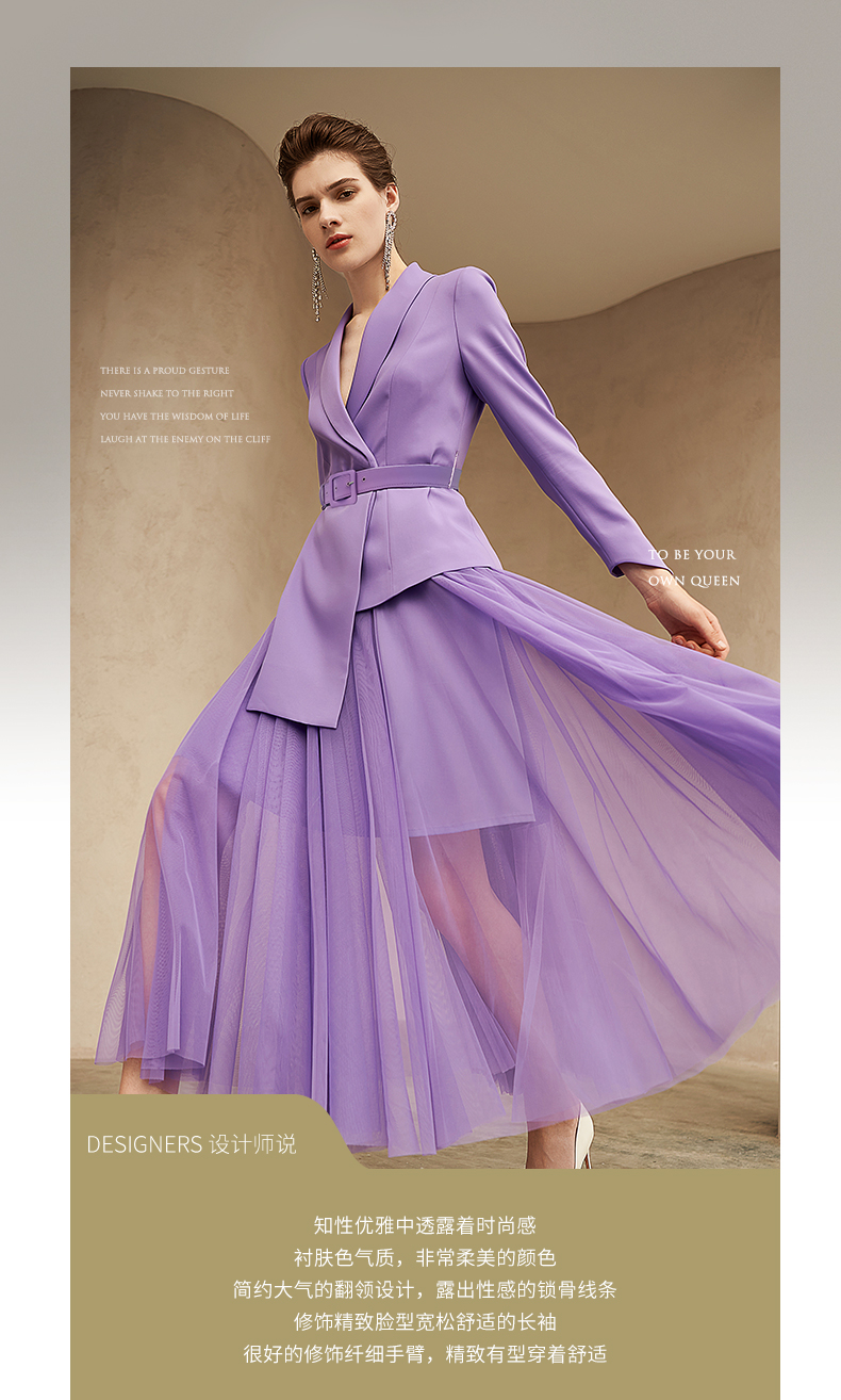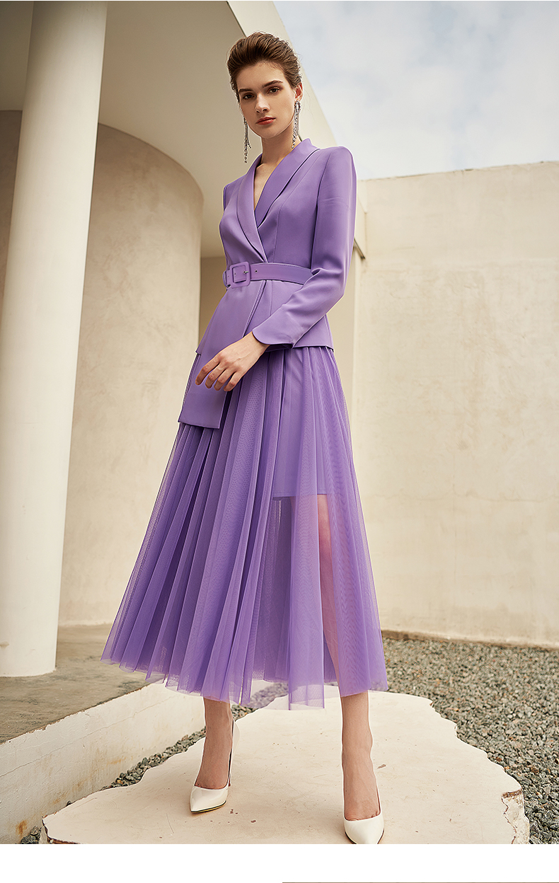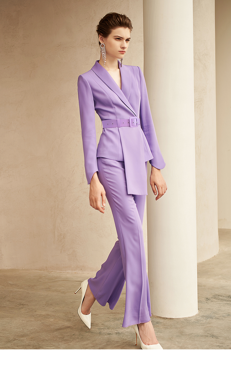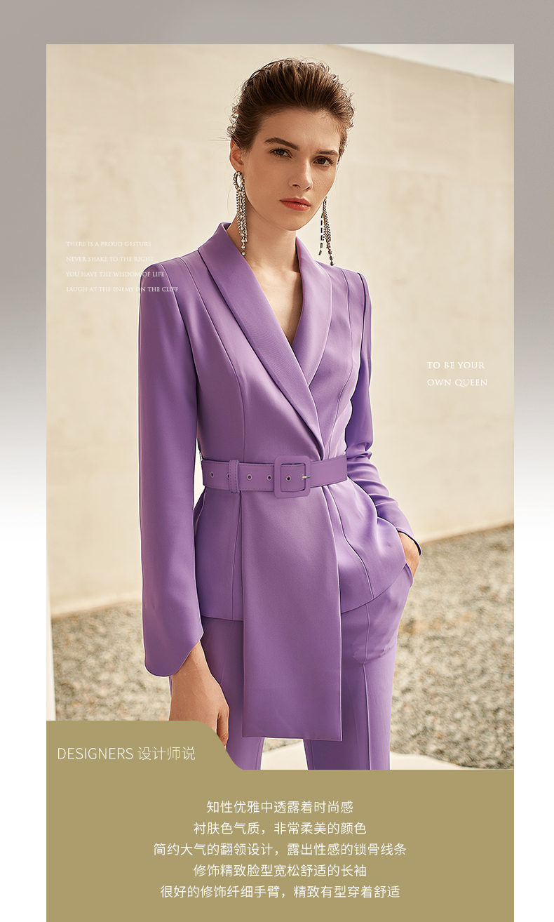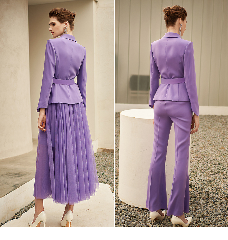 春秋高端时尚收腰紫色西服女微喇裤气质绑带西装名媛纱裙套装洋气