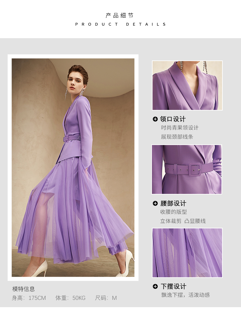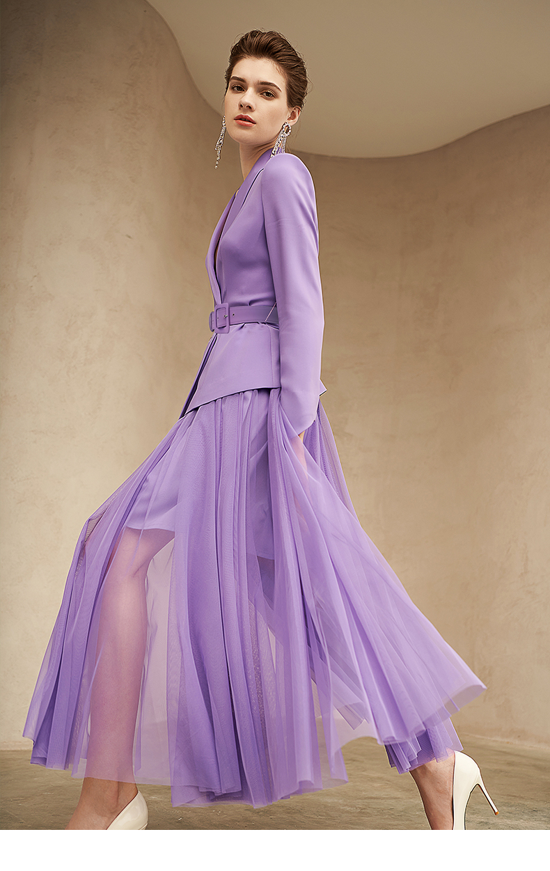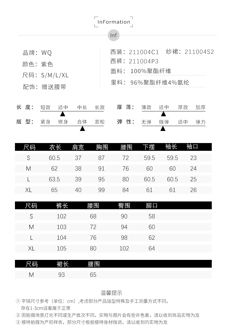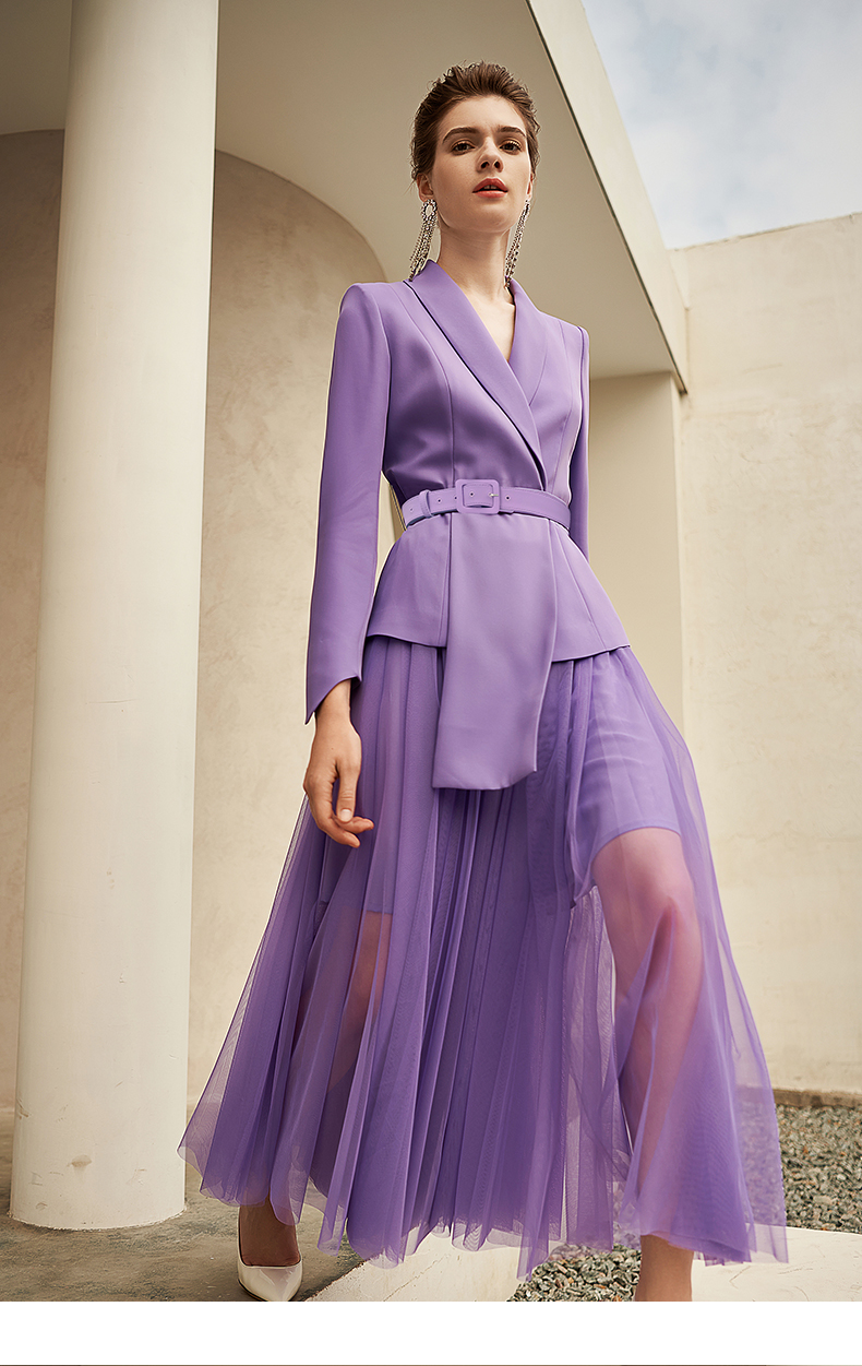 春秋高端时尚收腰紫色西服女微喇裤气质绑带西装名媛纱裙套装洋气