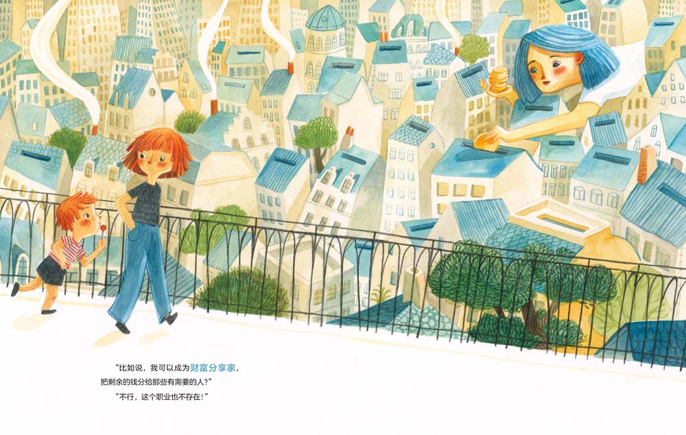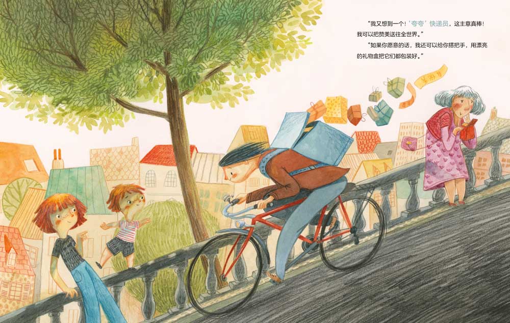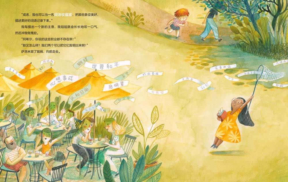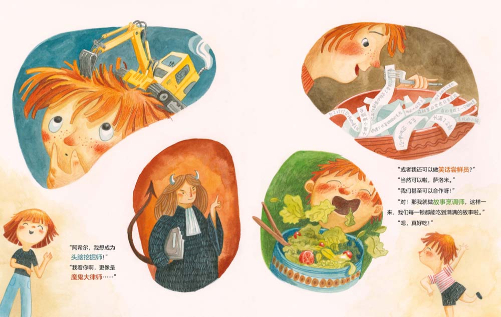 ;你以后想做什么职业呢?姐弟俩围绕这个问题展开了一场有趣的讨论。姐姐的目标很明确,她要做一名兽医,但弟弟还没有想好,他有很多备选项,比如悲伤疗愈师、头脑修理工、;夸夸快递员等。一开始,姐姐认为弟弟的答案有些不着边际,因为这些工作在现实生活中并不存在。弟弟却不这么认为,不存在又怎样?把它发明出来不就好了?后来,姐姐也加入了这场幻想的游戏,他们一起挥洒想象,幻想出了许多可以给周围的人和世界带去美好的全新的职业!