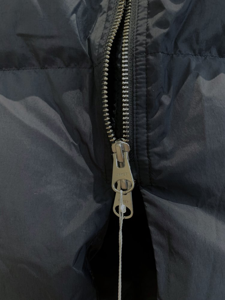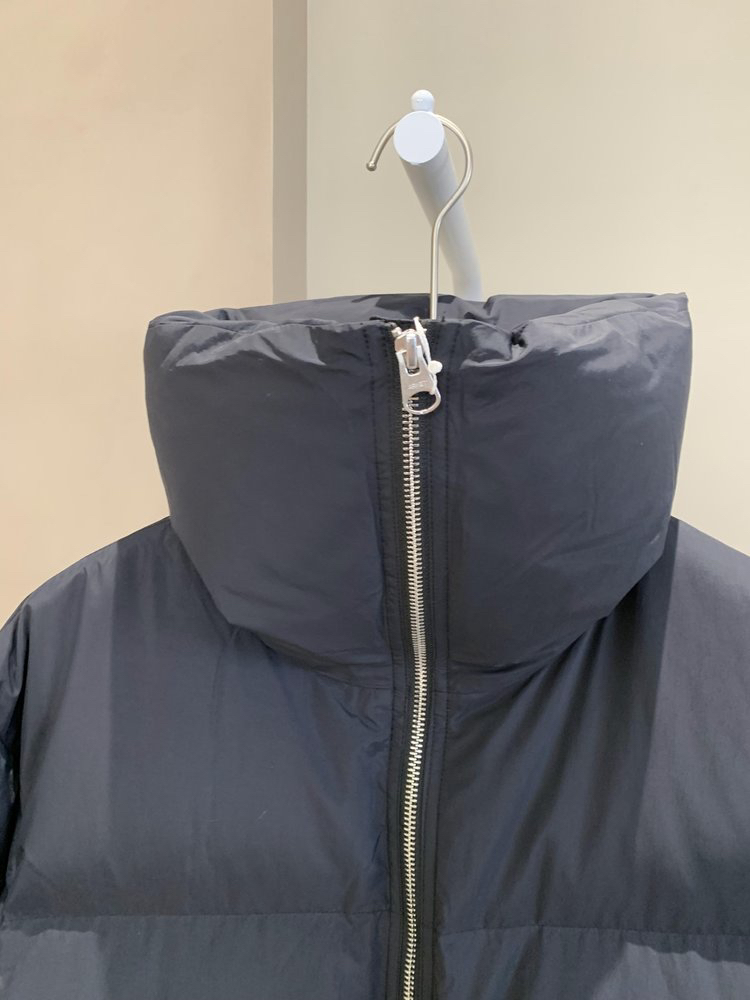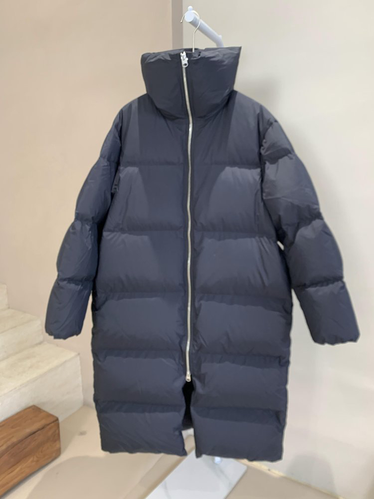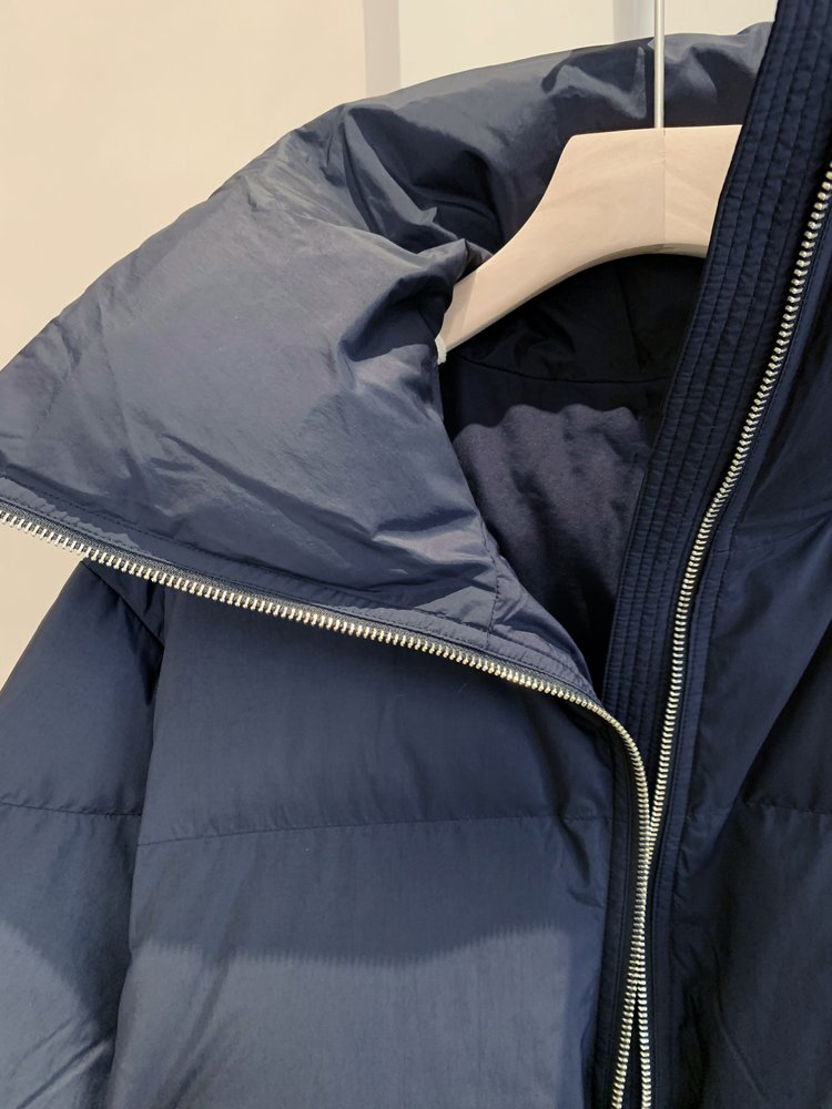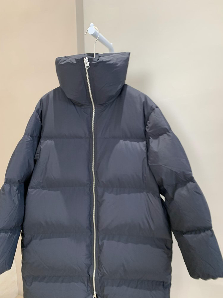 宽松长款版型,搭配高领设计,正面双向拉链开襟。配有两个口袋和一个内袋。