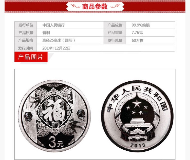 2015年贺岁福字银币,含卡册和证书!