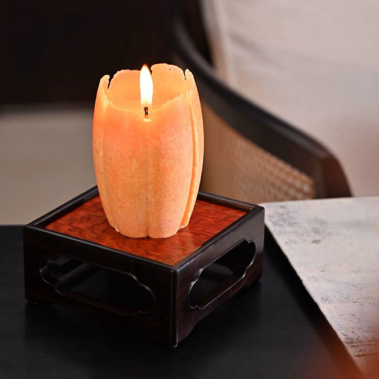 选用金丝楠木或紫光檀加花梨木制成, 木纹自然生动,光影中隐现如云似水的流动感。 整件香座以传统榫卯结构相接, 不开钉、不用胶,结构稳固而含蓄。