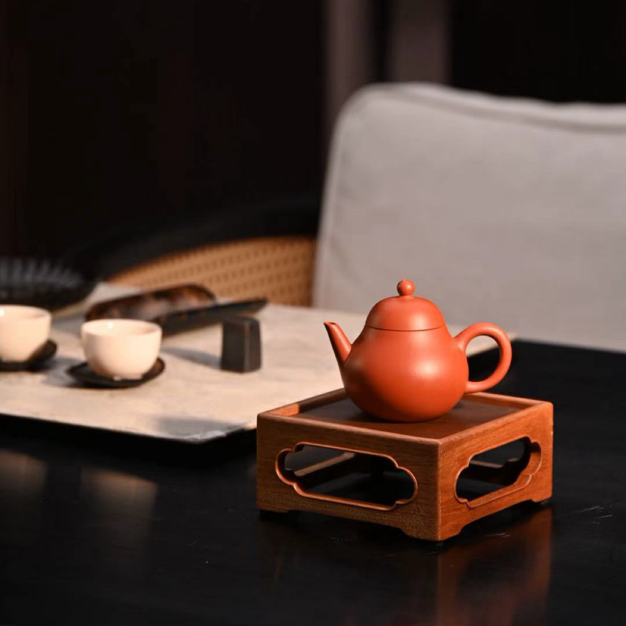 可承香炉、香插、茶器、花器, 亦可独立陈设于书案、几案之上。 当香烟袅袅升起, 香座的镂空处若云开气动,虚实相映。