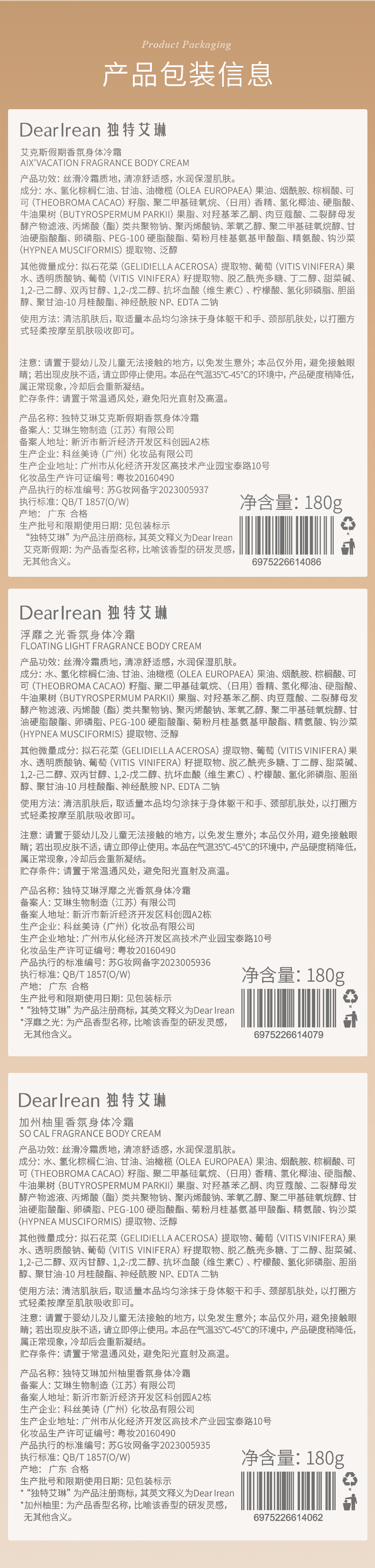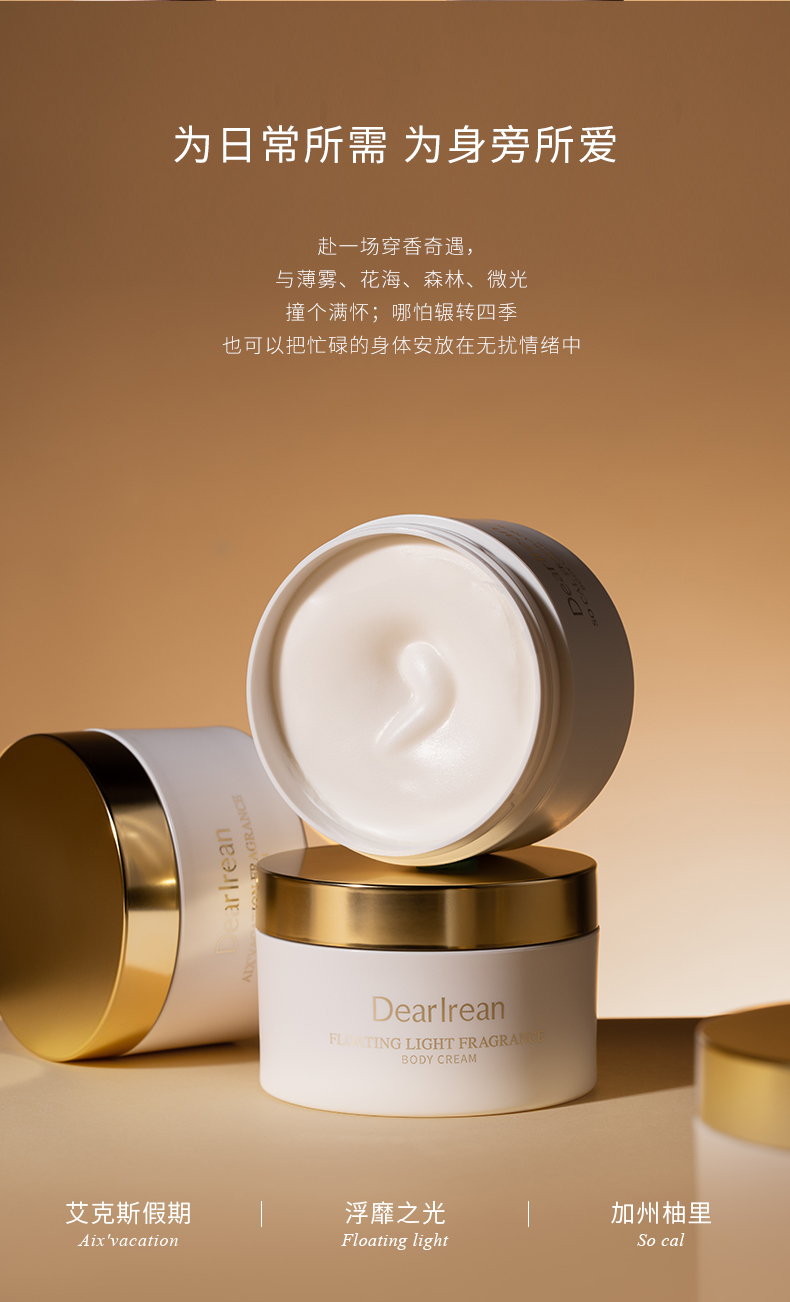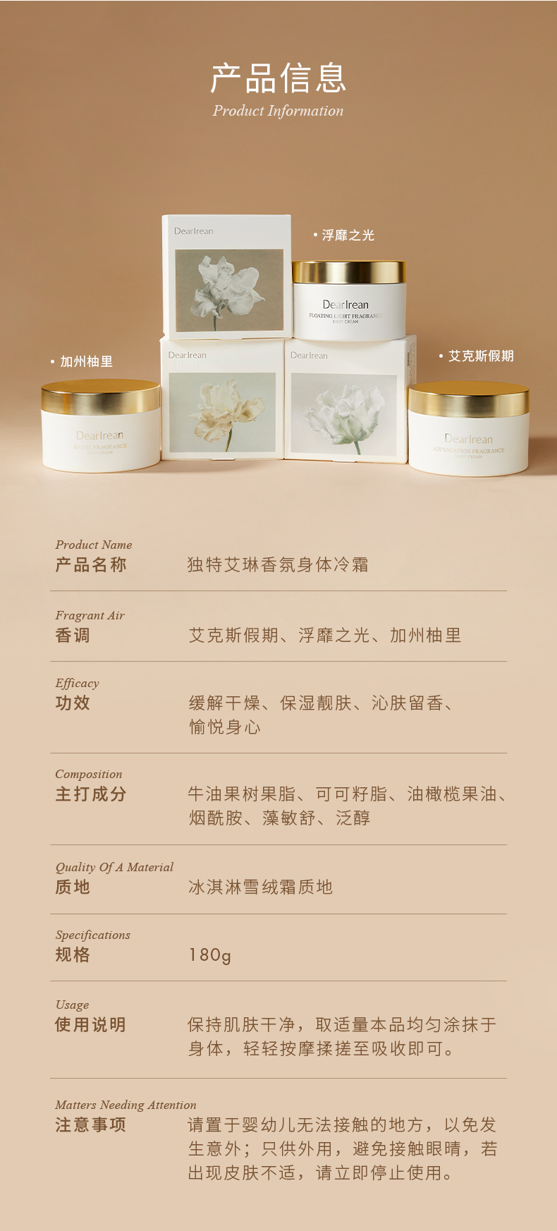 注意:独特艾琳香氛身体冷霜目前有两种材质的包装,分别是pet塑料和玻璃,均是正品,随机发货不接受指定。