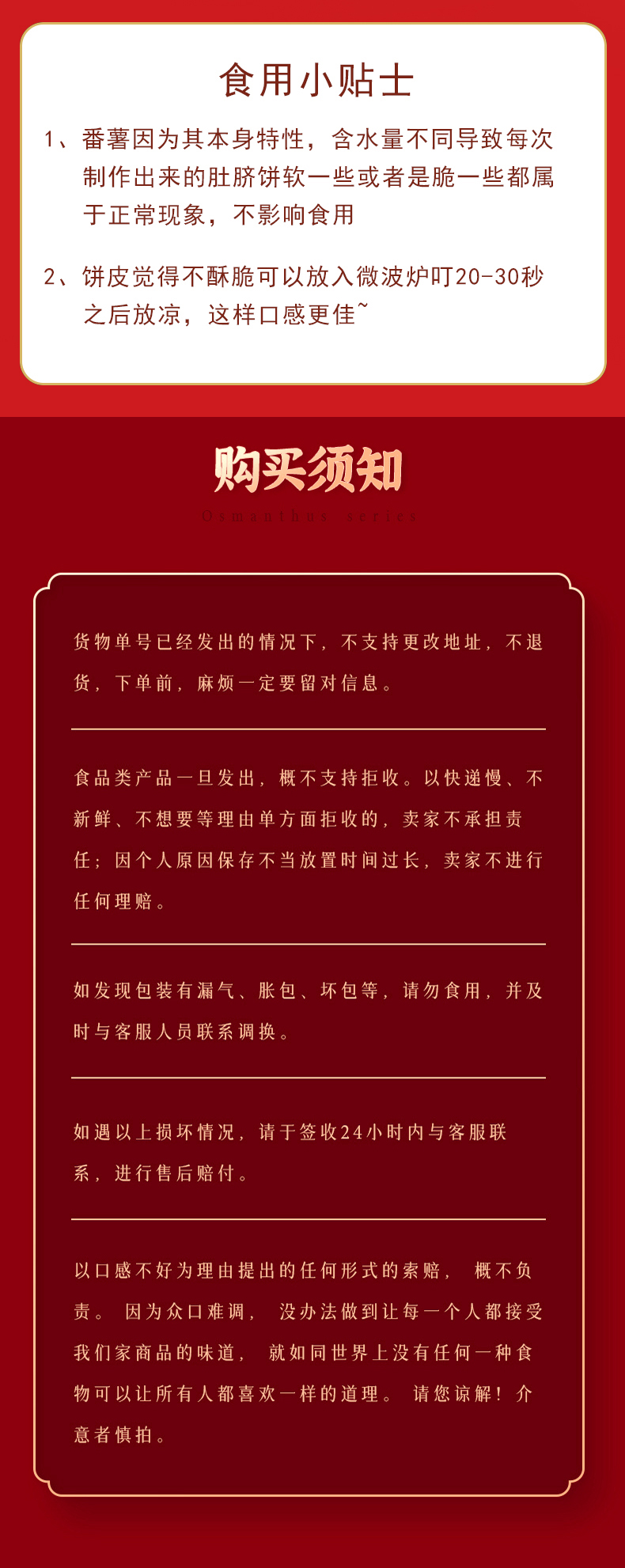 4.番薯因其自然特性,含水量的不同会导致每次制作出来的肚脐饼或软些或脆些,这个是其自然特性,不在售后范围内